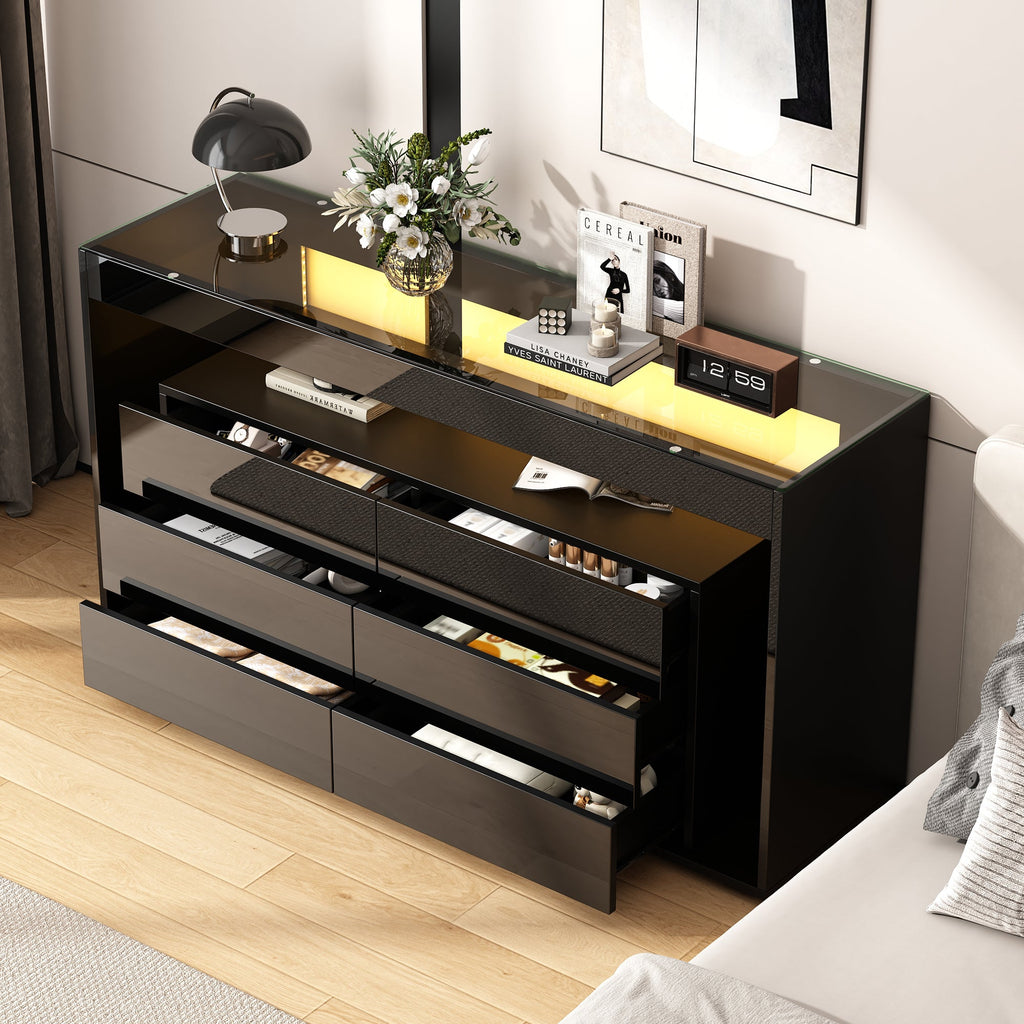 Sideboard, 6-Drawer LED High-Gloss with Tempered Glass Top, Black