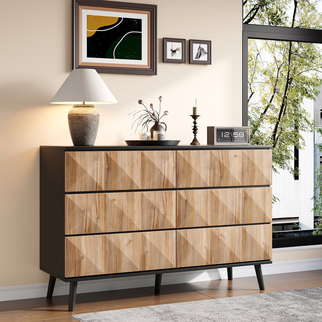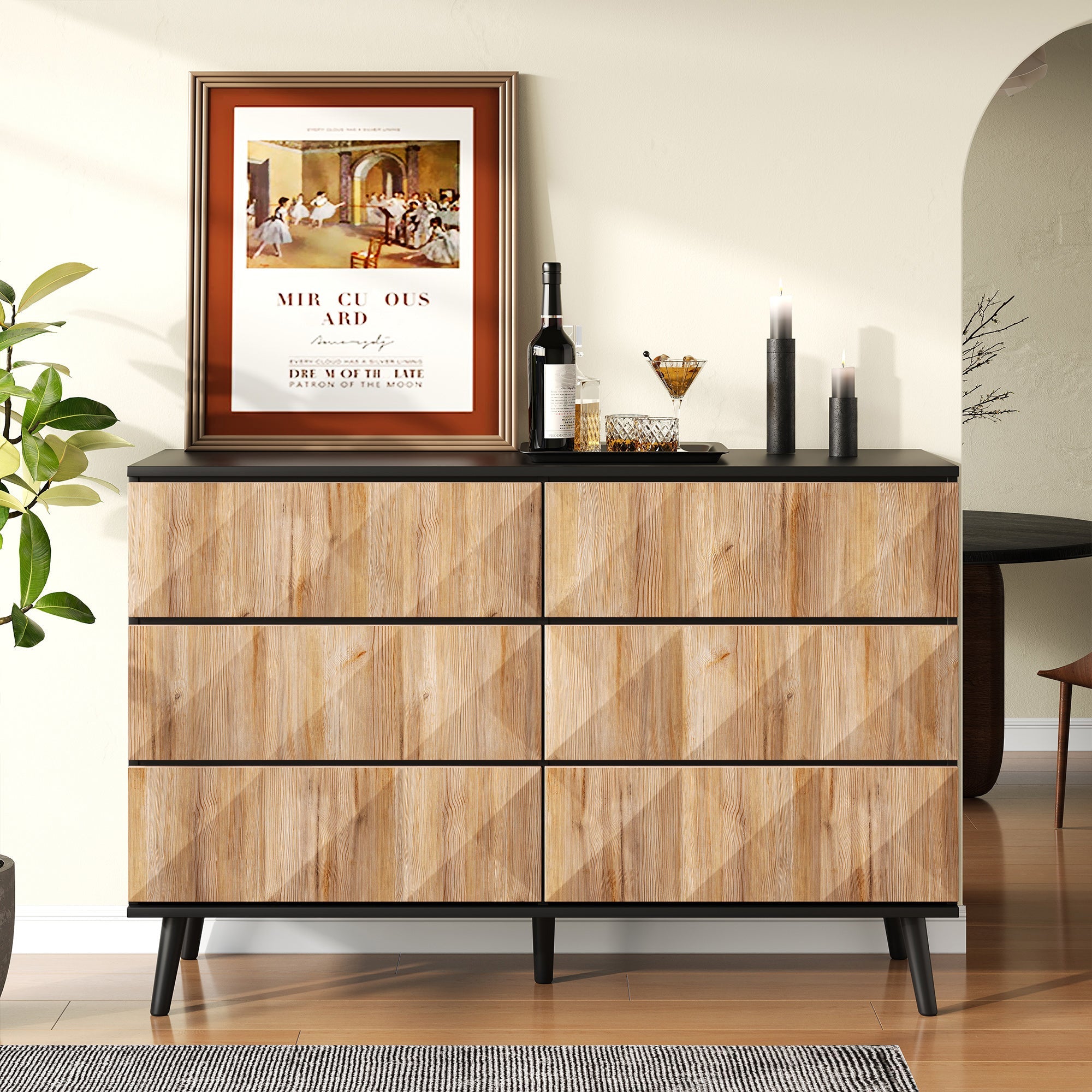 This modern sideboard combines practical functionality with modern design, making it a striking addition to any home. Six spacious drawers offer ample storage for clothing, accessories, or everyday household items, keeping your living space organized. Each drawer features an elegant black decorative strip that also serves as a concealed handle, emphasizing the minimalist look while allowing easy access.