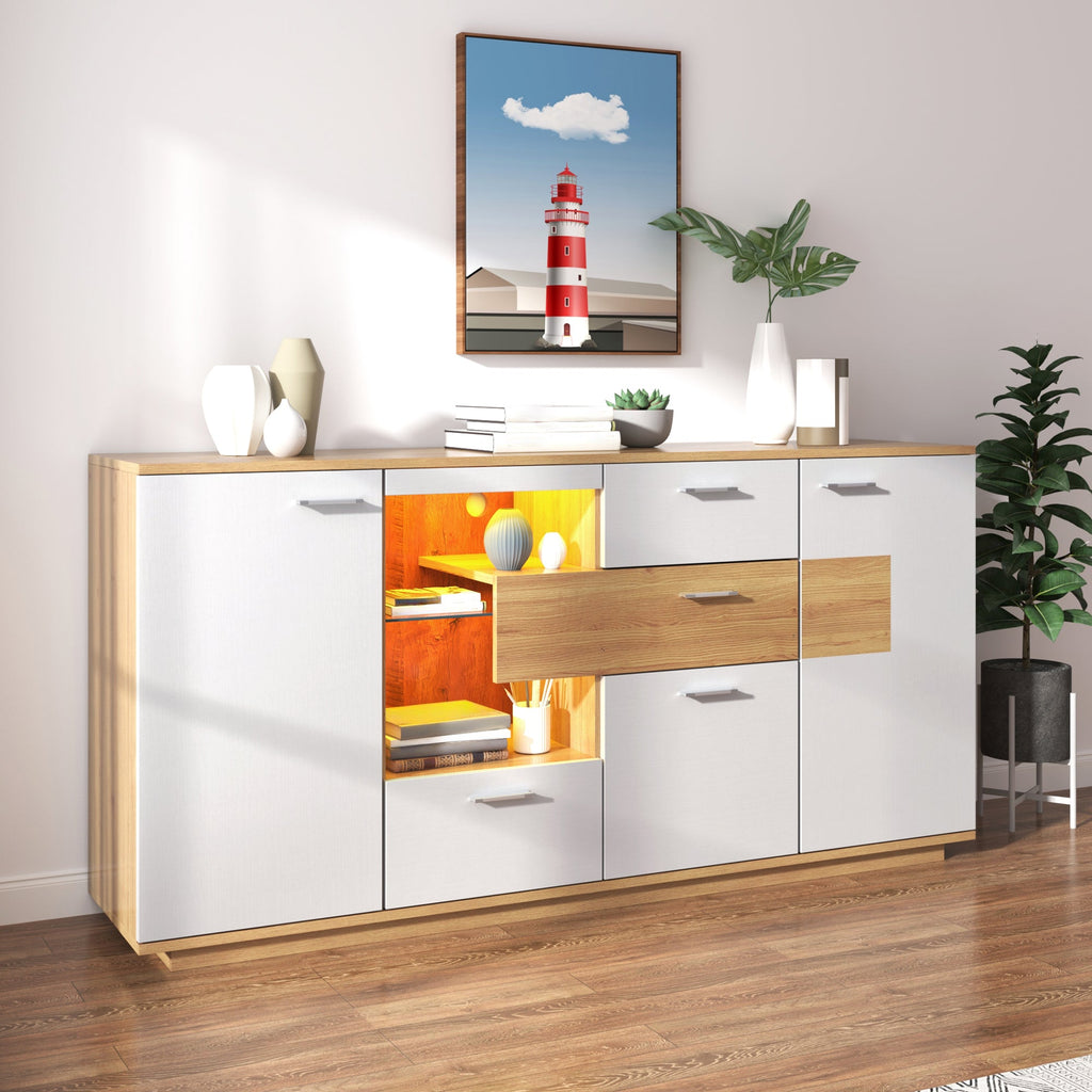 Sideboard Cabinet, 160x40x77cm, LED Lighting, 2 Doors, 4 Drawers, Glass Shelf, White Wood Look