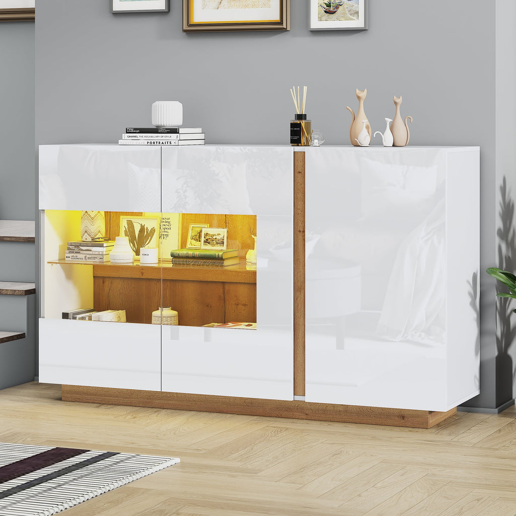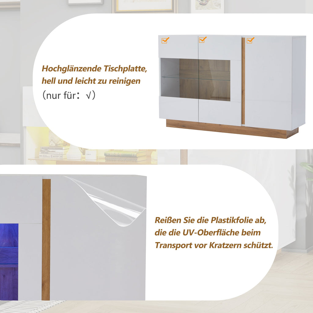 This sideboard and storage cabinet combines high-quality particleboard, tempered glass, and LED lighting strips. Its dimensions are 138 x 38.5 x 90.5 cm. The main color features white high-gloss cabinet doors and glass, while the back panel, base, and dividers are made of solid wood. The stylish and simple design, with a load capacity of 30 kg, is a highlight of this sideboard. The combination of glass and LED lights makes this sideboard environmentally friendly, bringing it closer to nature.