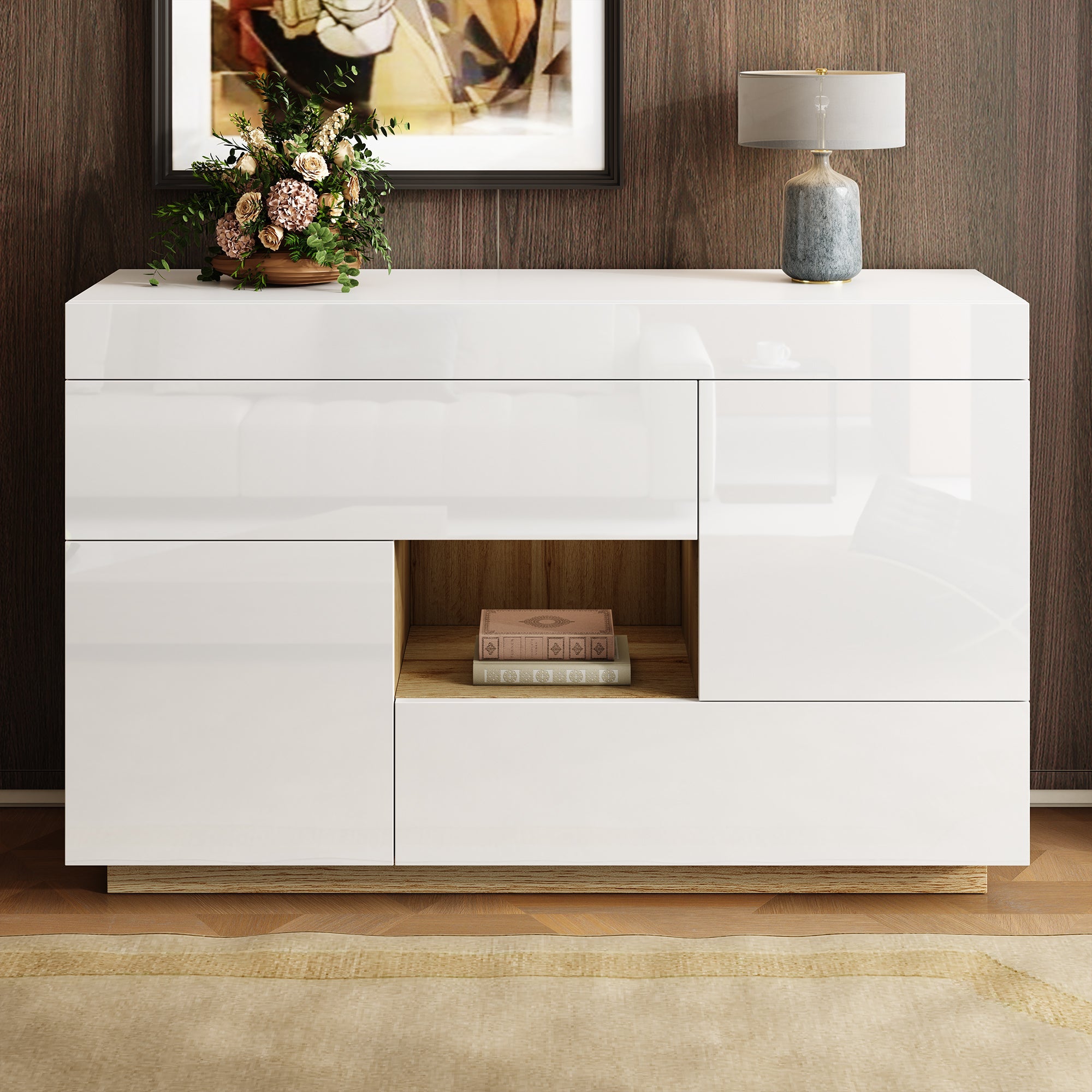 Sideboard, High-Gloss Display Cabinet with LED Lighting & Drawers, White