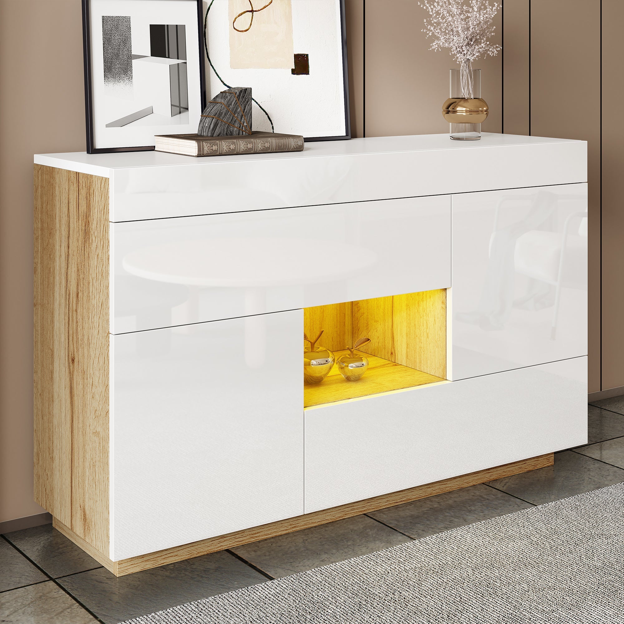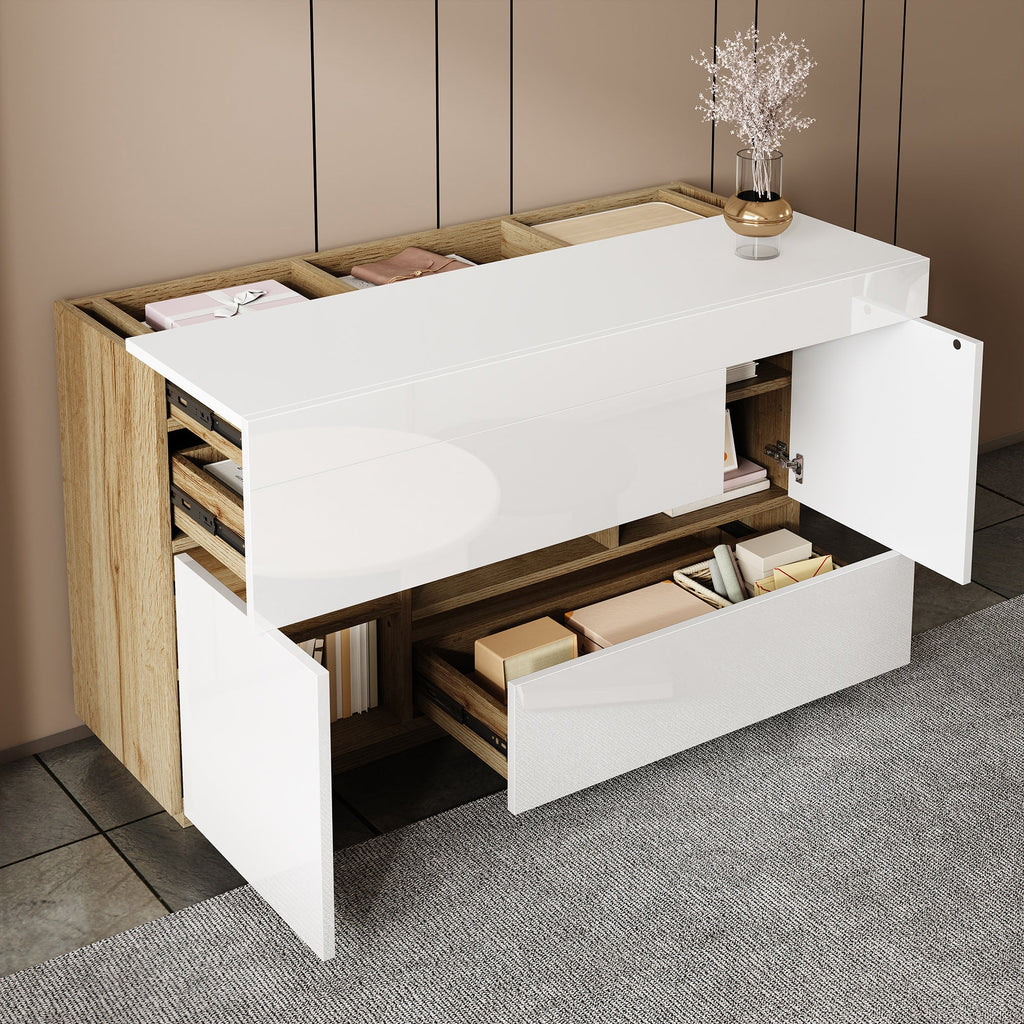 This sideboard features a high-gloss design with brilliant white panels that reflect natural light, creating a bright and elegant ambiance. The perfect combination of high-gloss white and natural wood grain creates a timeless two-tone design that blends harmoniously with any interior style.