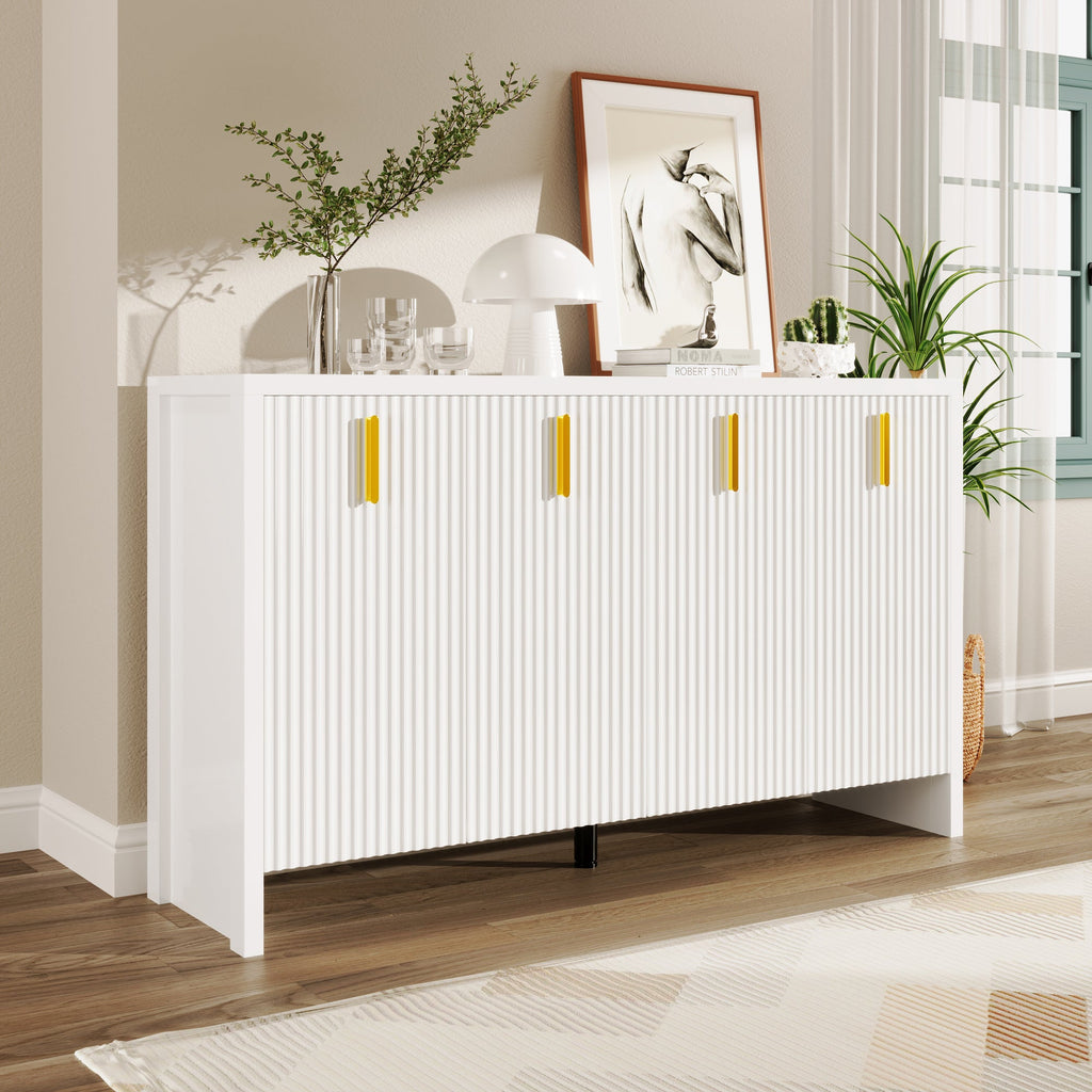 This sideboard measures 140 cm x 38 cm x 80 cm. It features a pure white finish and a simple shape that exudes an elegant temperament. The four doors are adorned with unique gold handles, adding a touch of vibrant color and creating a spacious and beautiful effect. The cabinet door features an adjustable, movable shelf that allows you to adjust the height of the shelf as needed for better storage of different items.
