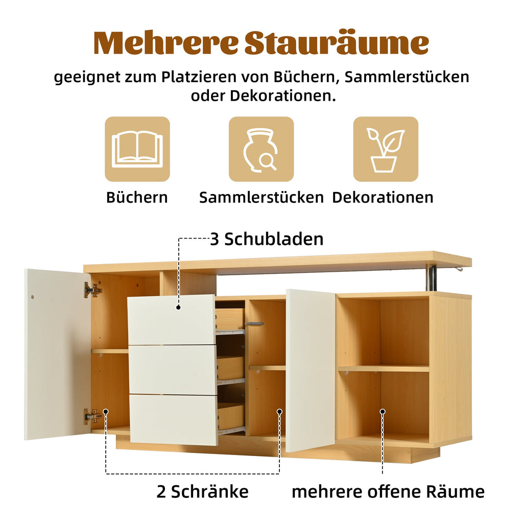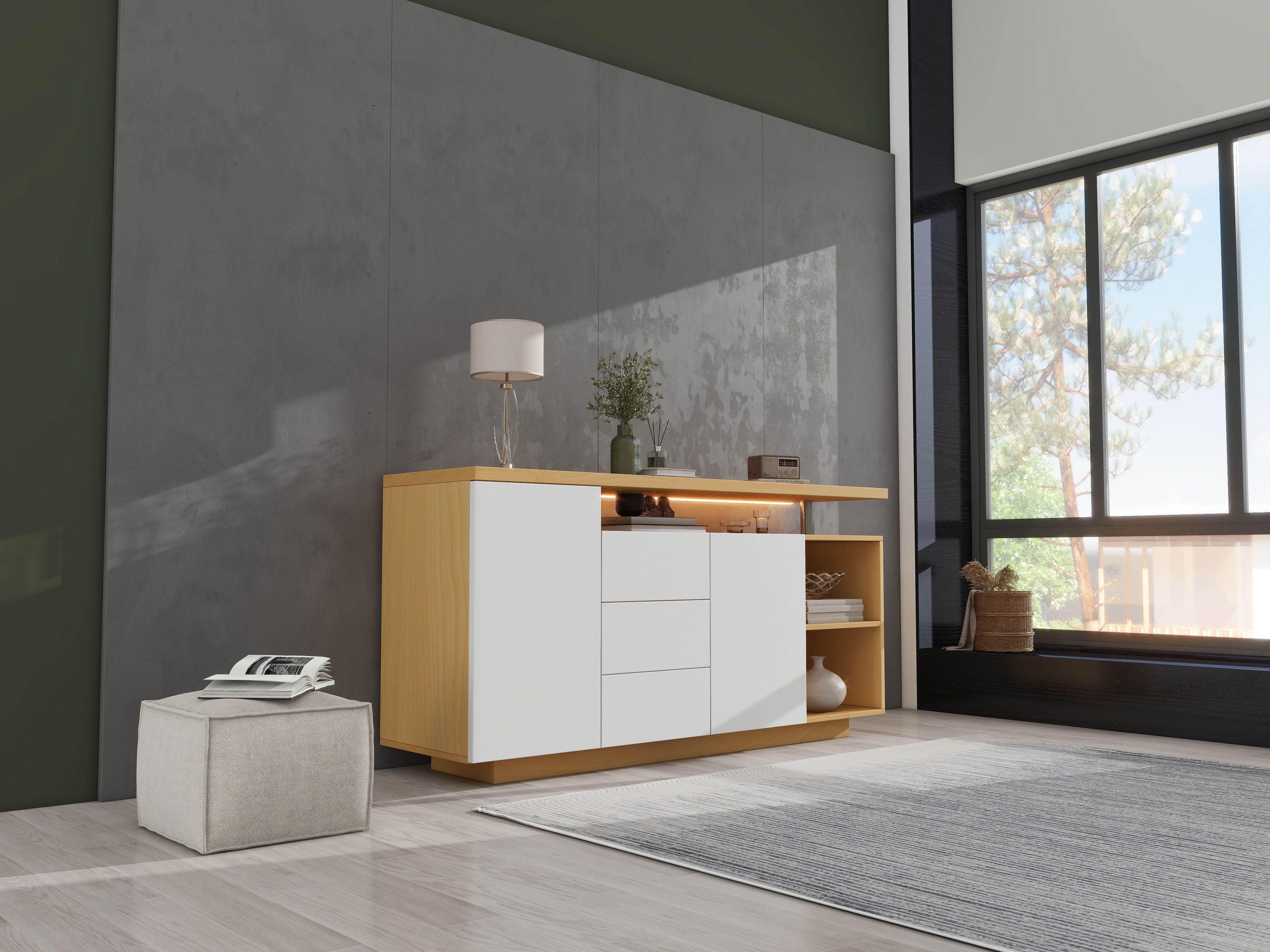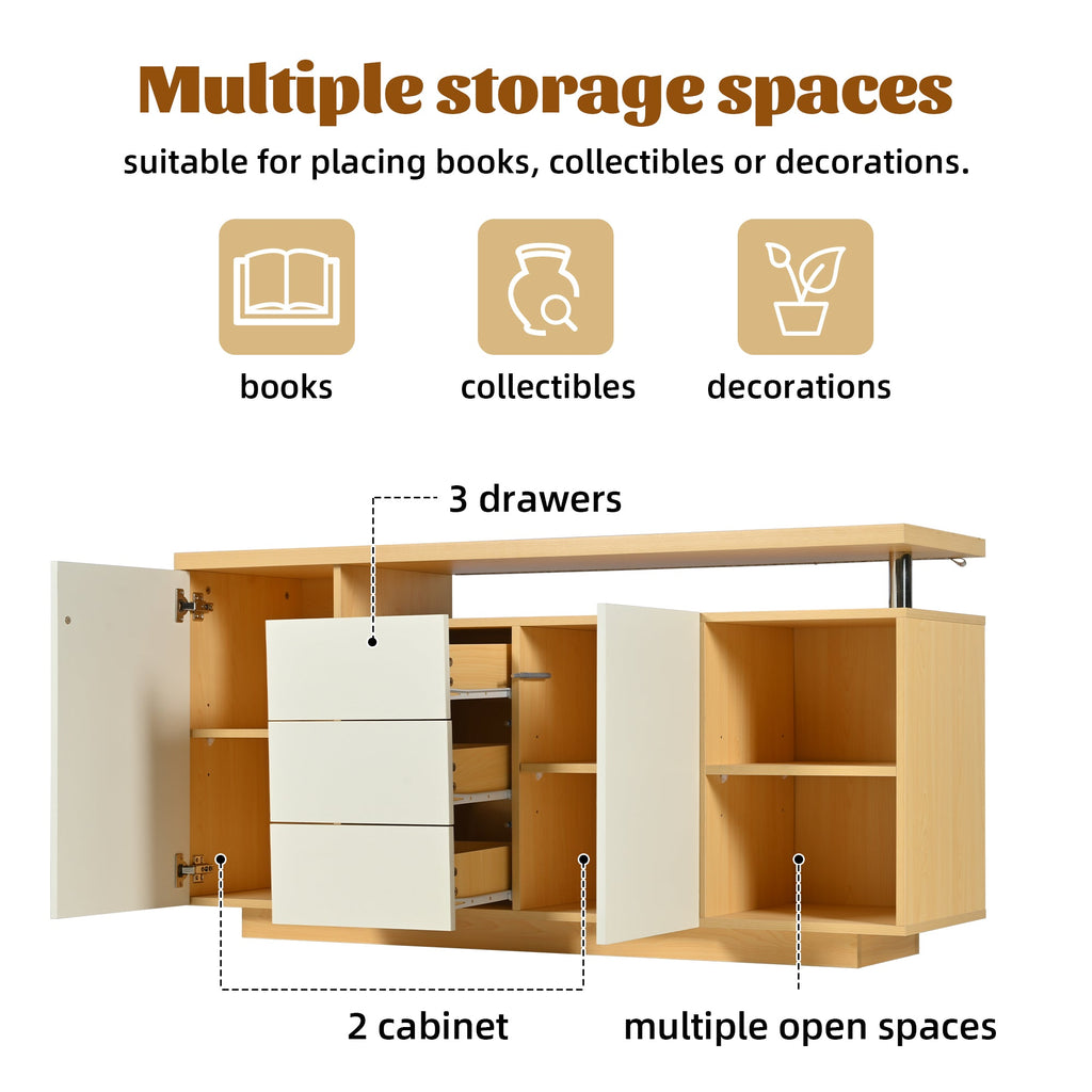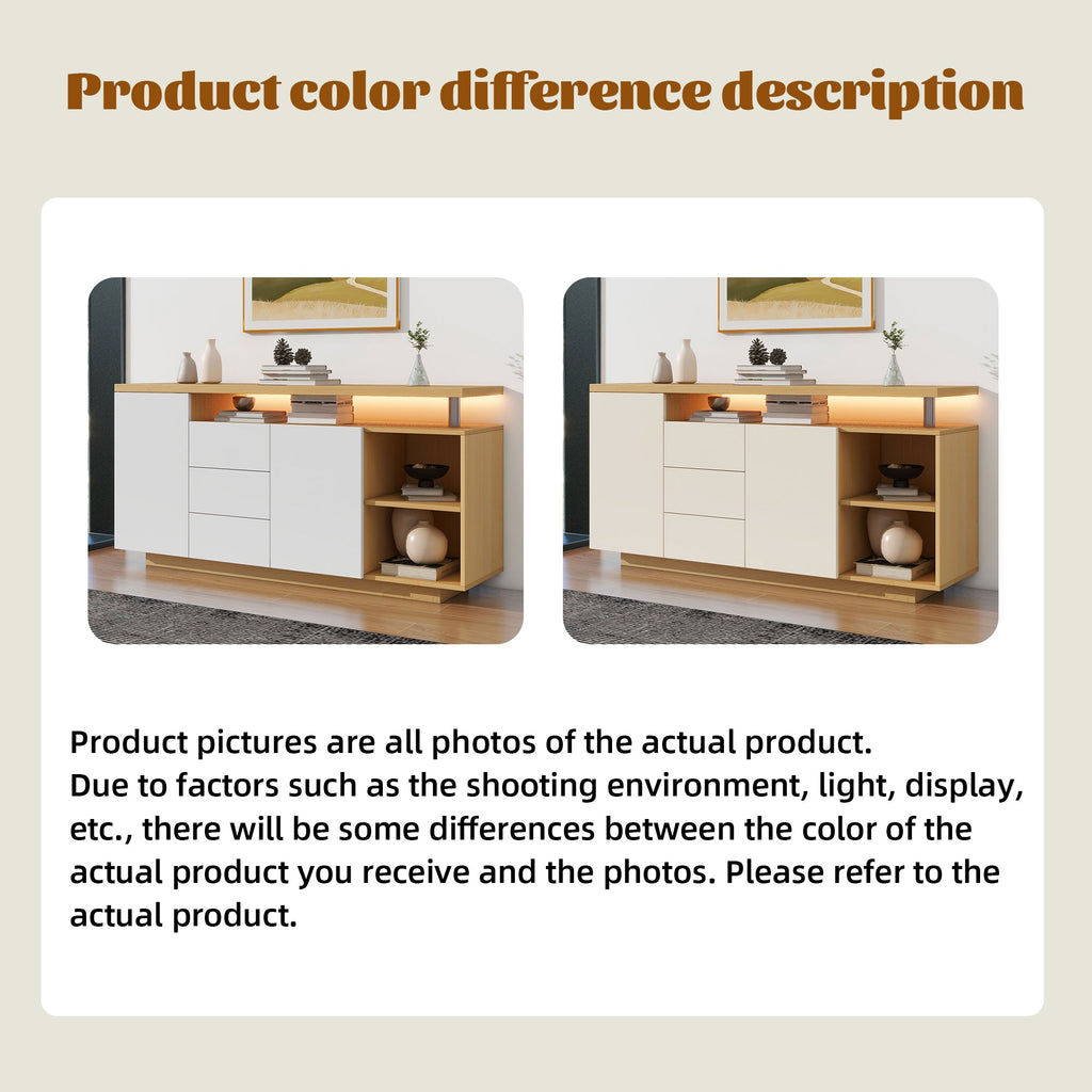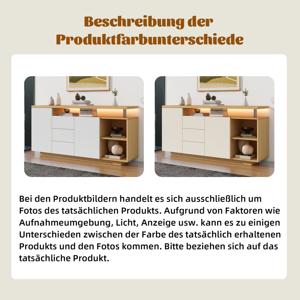 Sideboard, Multifunctional with 2 Doors, 3 Drawers, 2 Open, LED, White/Wood Imitation