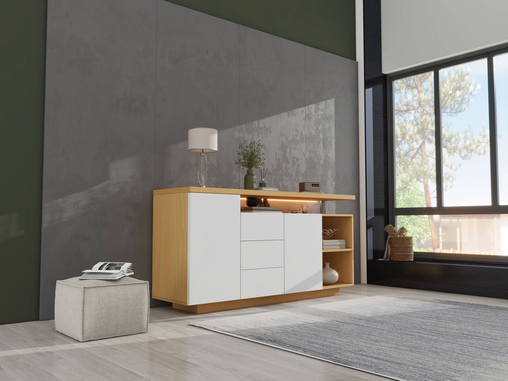 Our 140 cm long dining sideboard is the perfect combination of functionality and style to enhance the organization of your living room. Featuring a striking color combination of white and faux wood, this versatile cabinet includes 2 doors, 3 drawers, and 2 open storage compartments. Height-adjustable dividers inside the doors allow for customization.
