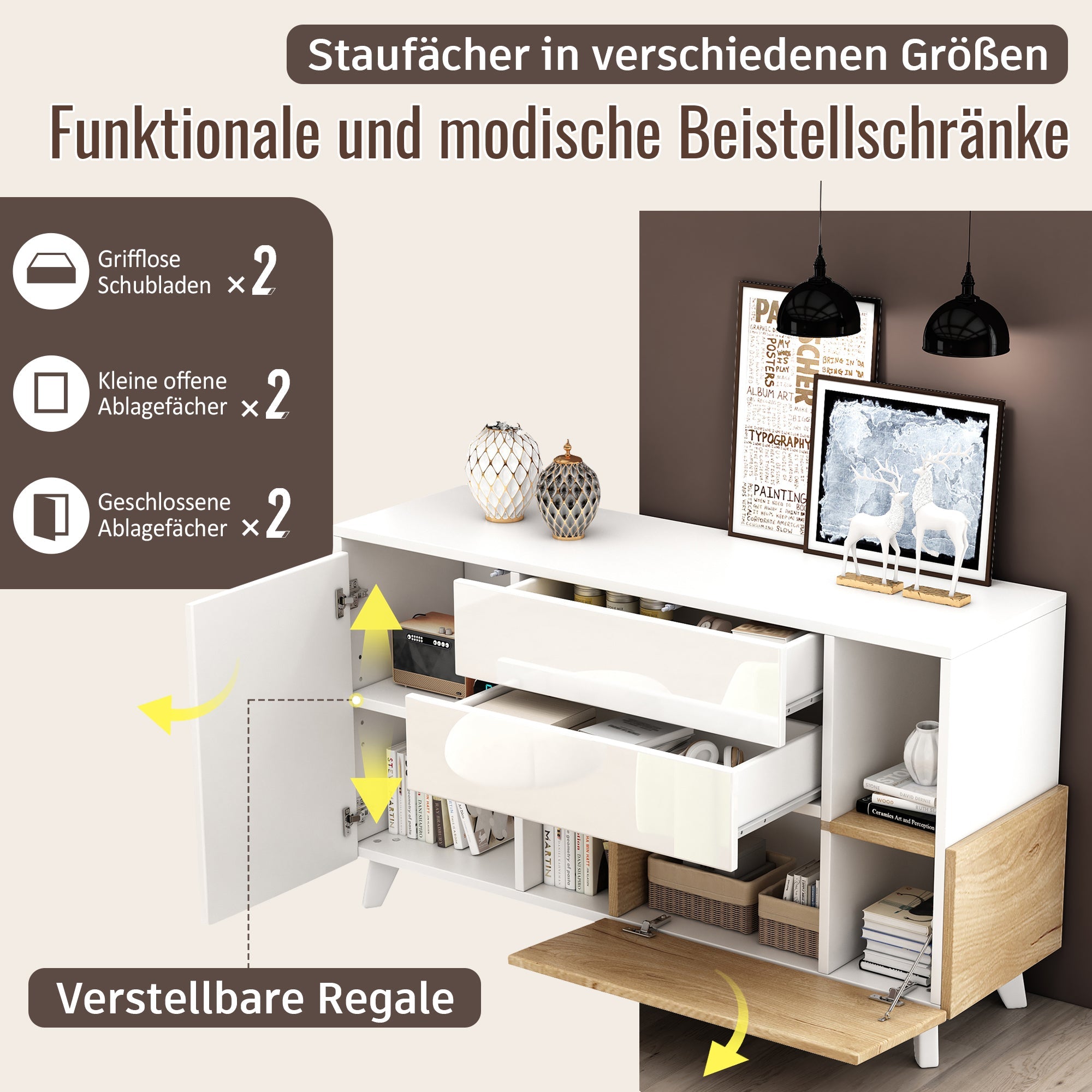 The multifunctional storage system features a single door, two wide drawers, a drop-leaf door, and open compartments ideal for decorative items. Its five-legged structure ensures solid support, while the high-gloss top is durable and stain-resistant, simplifying daily maintenance.