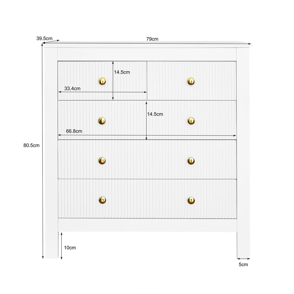 This 5-drawer chest of drawers combines elegance and functionality, making it the perfect addition to any room. The unique textured finish of each drawer creates a visually appealing look and a unique tactile experience, adding a touch of sophistication. Thickened legs ensure stability and durability, making it a reliable piece of furniture for long-term use. Each drawer features gold-plated handles for a luxurious shine and a sophisticated look that complements the textured finish. With five spacious drawers, this chest of drawers offers ample storage space for clothes, accessories, tableware, and more, helping to keep your living space organized and clutter-free. Its versatile design makes it suitable for a variety of rooms, such as the bedroom, living room, or hallway. This chest of drawers fits seamlessly into any decor style, enhancing your interior while providing a practical storage solution. The combination of solid construction, elegant design, and practical functionality makes this chest of drawers a valuable addition to your home.