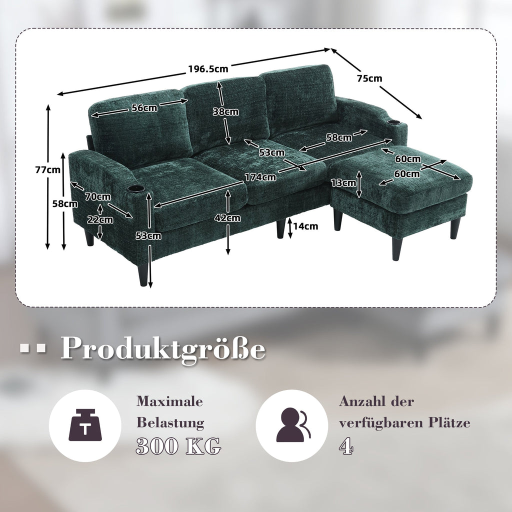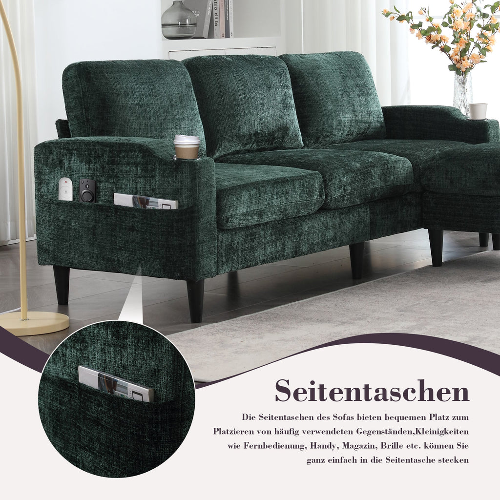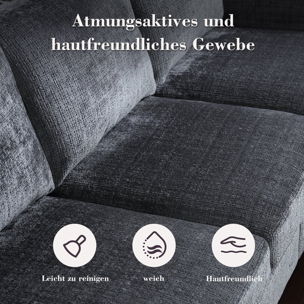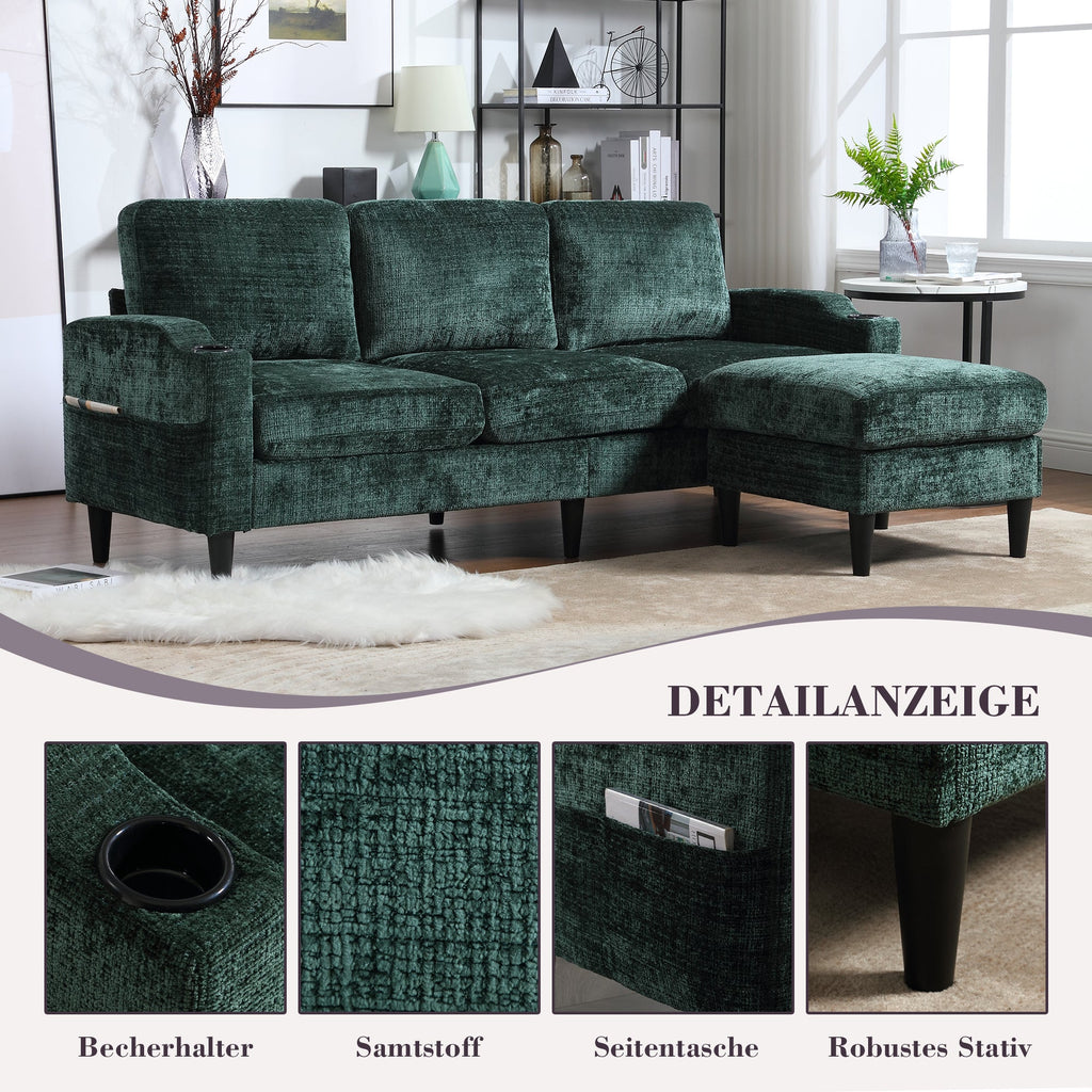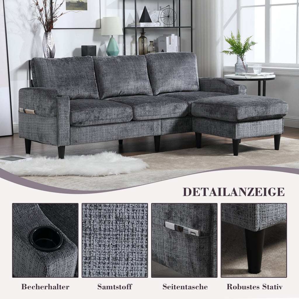 This 4-seater sofa features comfortable armrests, convenient cup holders, and side pockets. Its velvet upholstery offers a skin-friendly and luxurious feel. Enjoy maximum comfort thanks to the durable and pleasantly soft chenille upholstery, ideal for everyday relaxation.