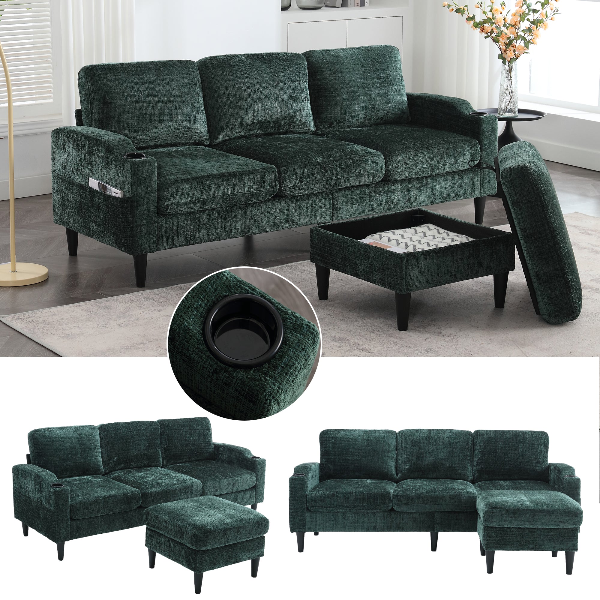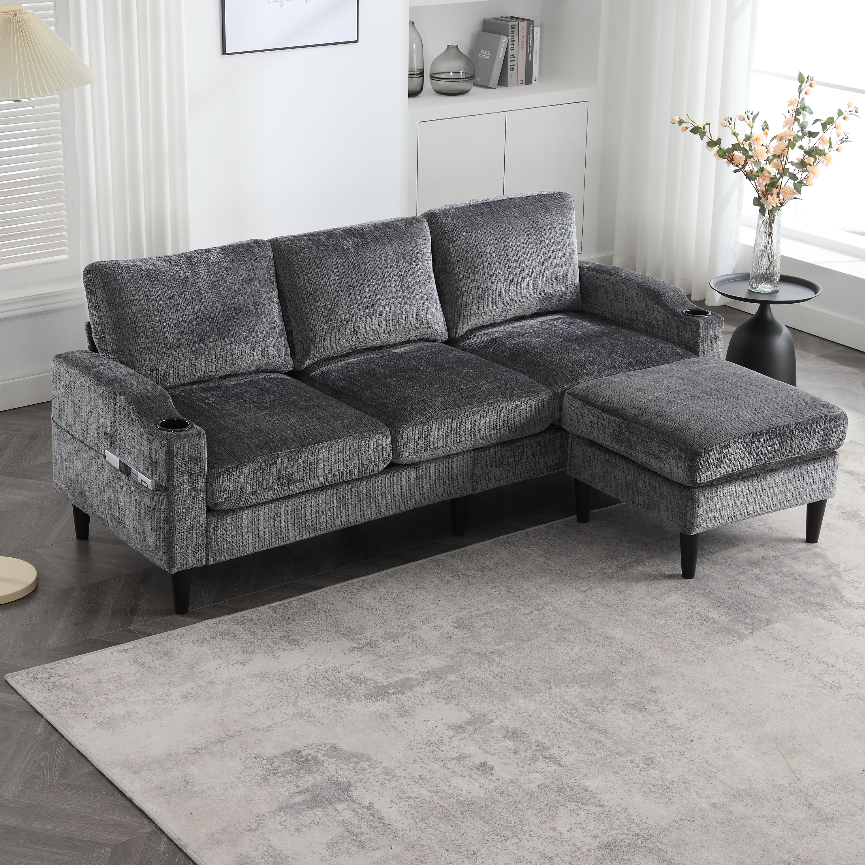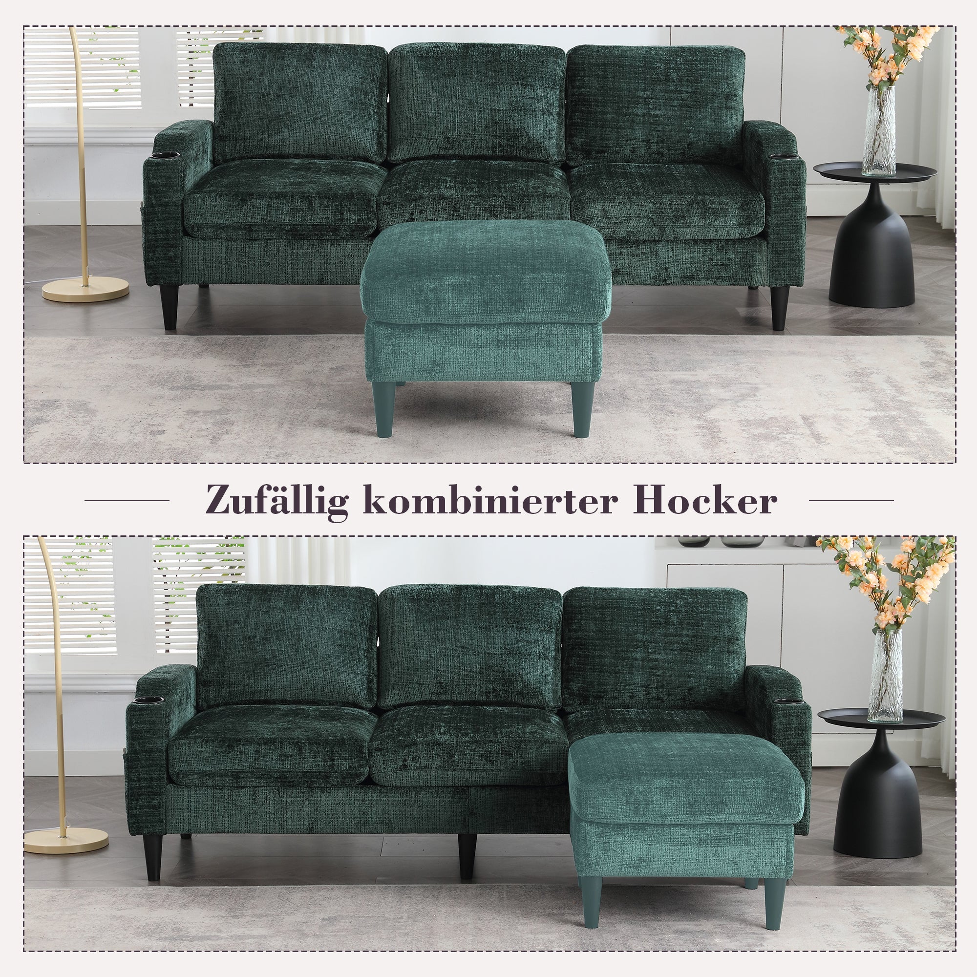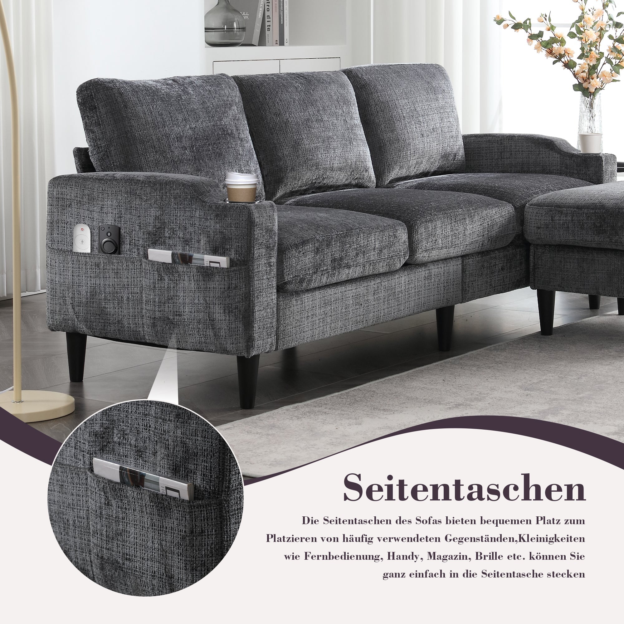 This 4-seater sofa features comfortable armrests, convenient cup holders, and side pockets. Its velvet upholstery offers a skin-friendly and luxurious feel. Enjoy maximum comfort thanks to the durable and pleasantly soft chenille upholstery, ideal for everyday relaxation.