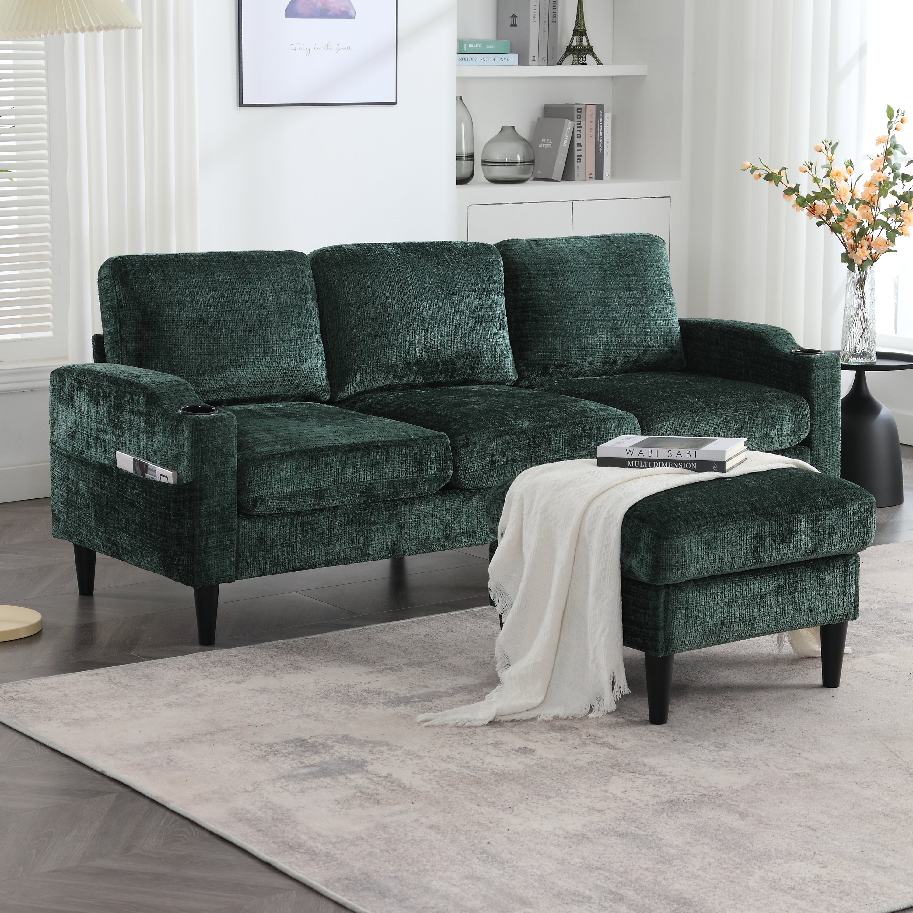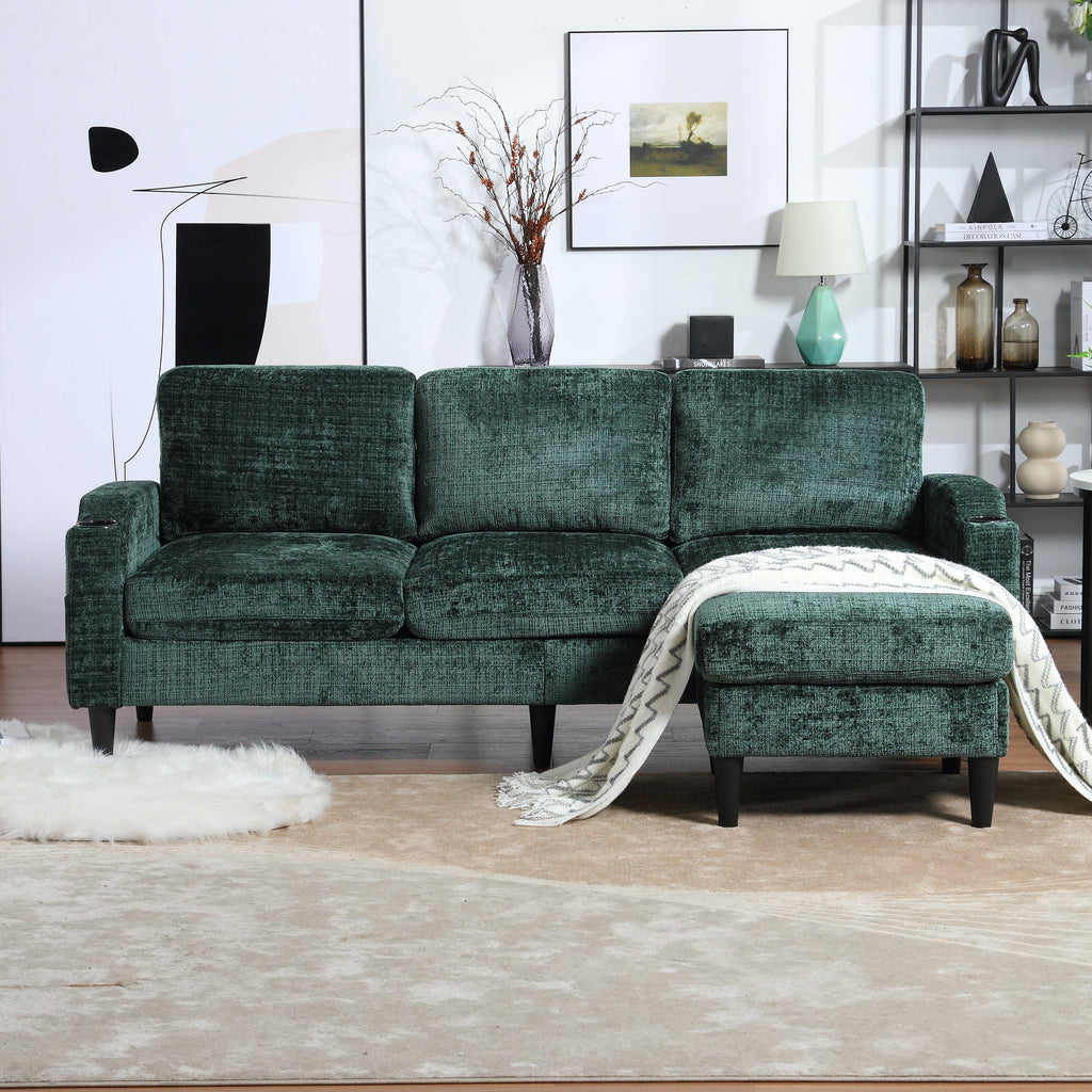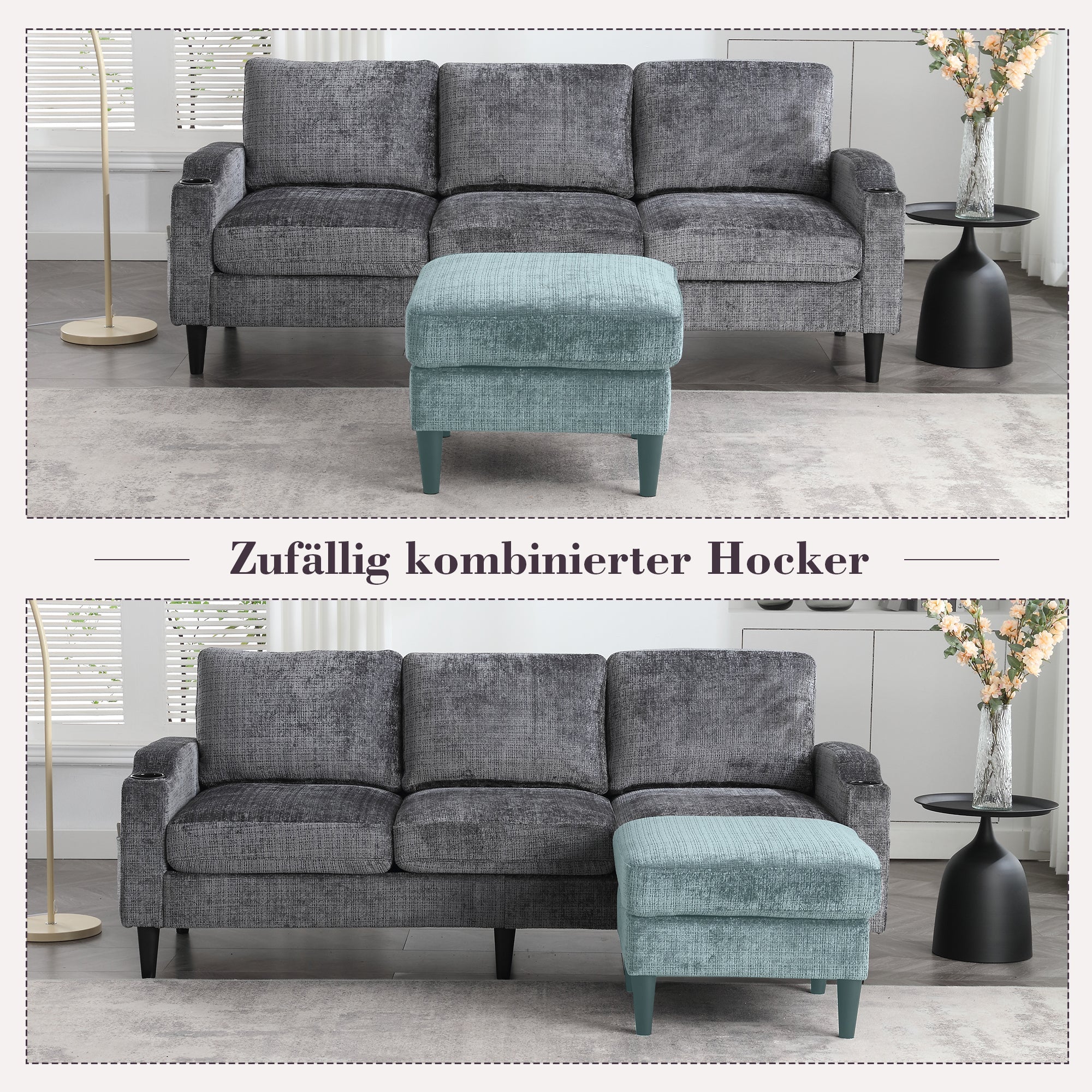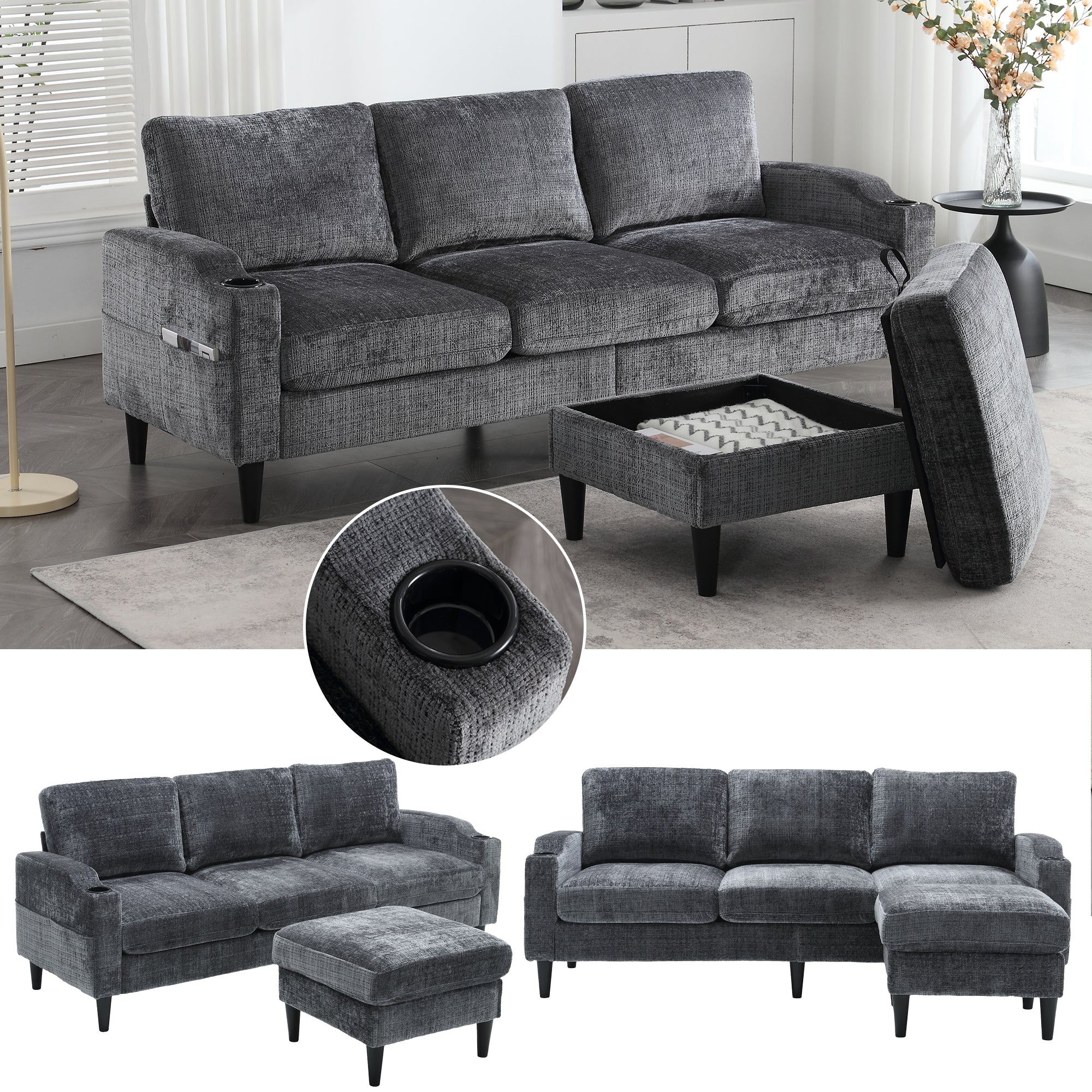 This 4-seater sofa features comfortable armrests, convenient cup holders, and side pockets. Its velvet upholstery offers a skin-friendly and luxurious feel. Enjoy maximum comfort thanks to the durable and pleasantly soft chenille upholstery, ideal for everyday relaxation.