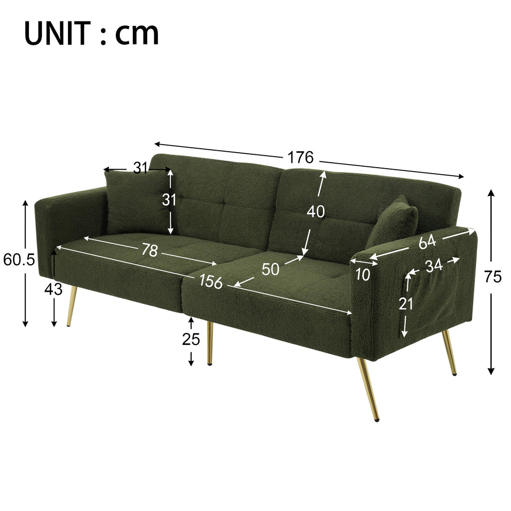 Sofa Bed with 3 Adjustable Backrest Angles and Storage Pockets, Gold Legs