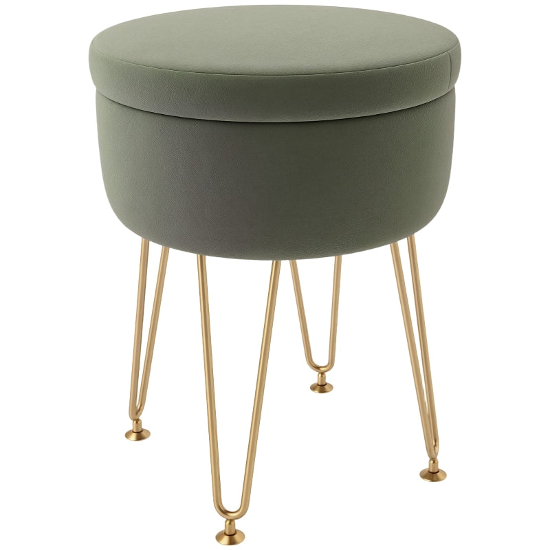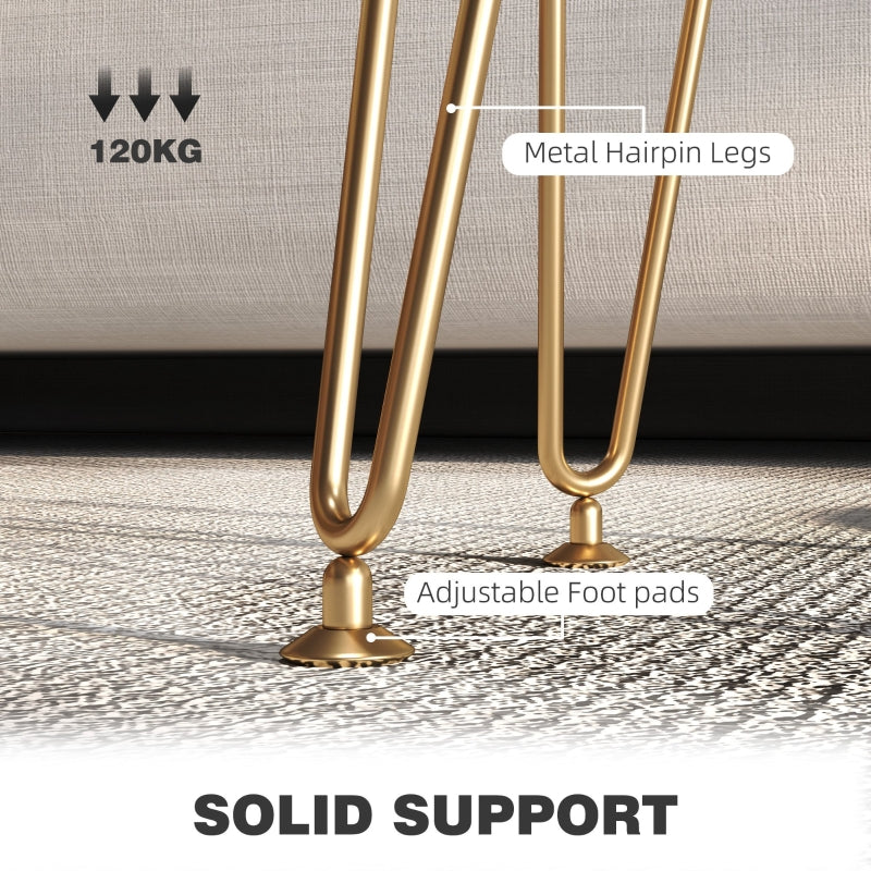 This elegant storage seat features velvet-feel upholstery paired with gold-colored hairpin legs, making it a beautiful addition to your space.