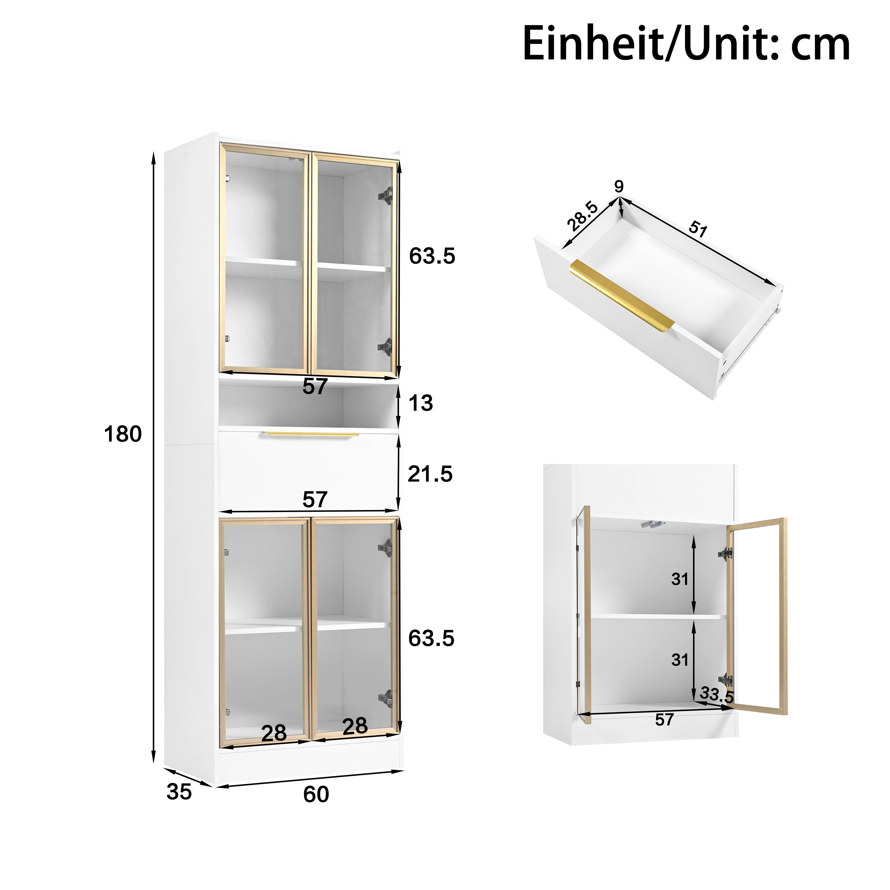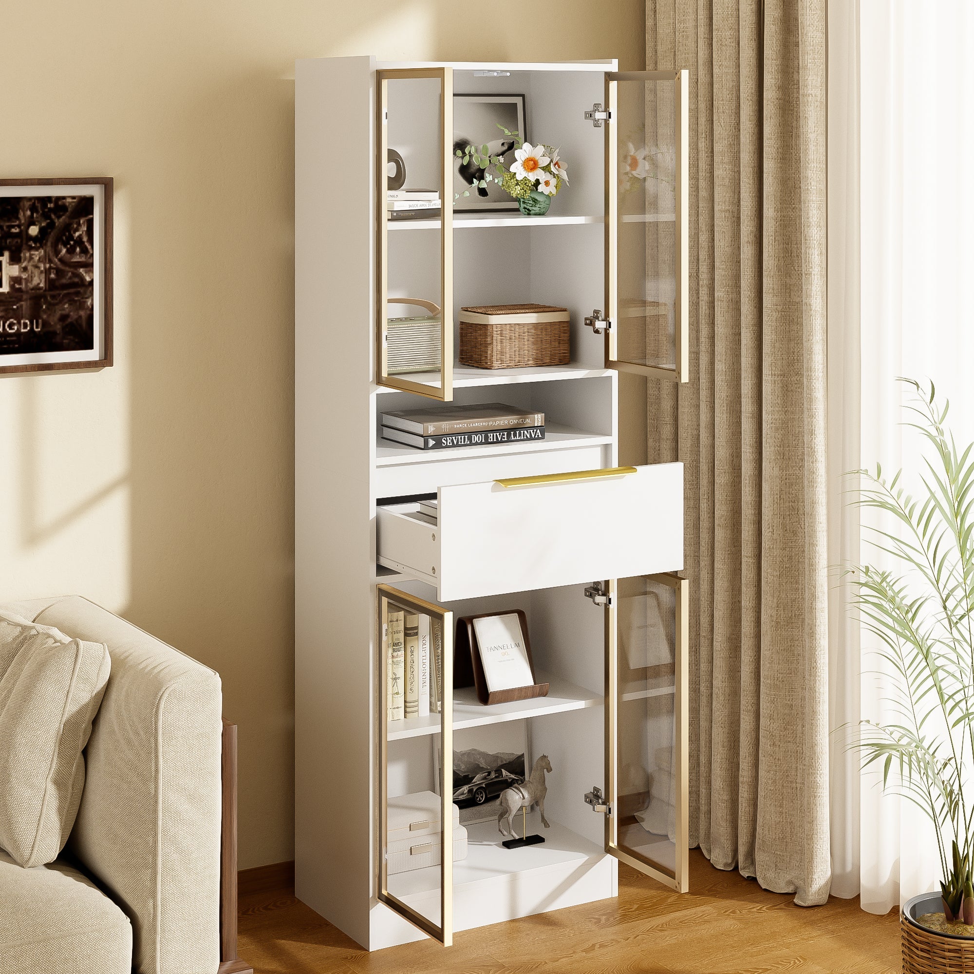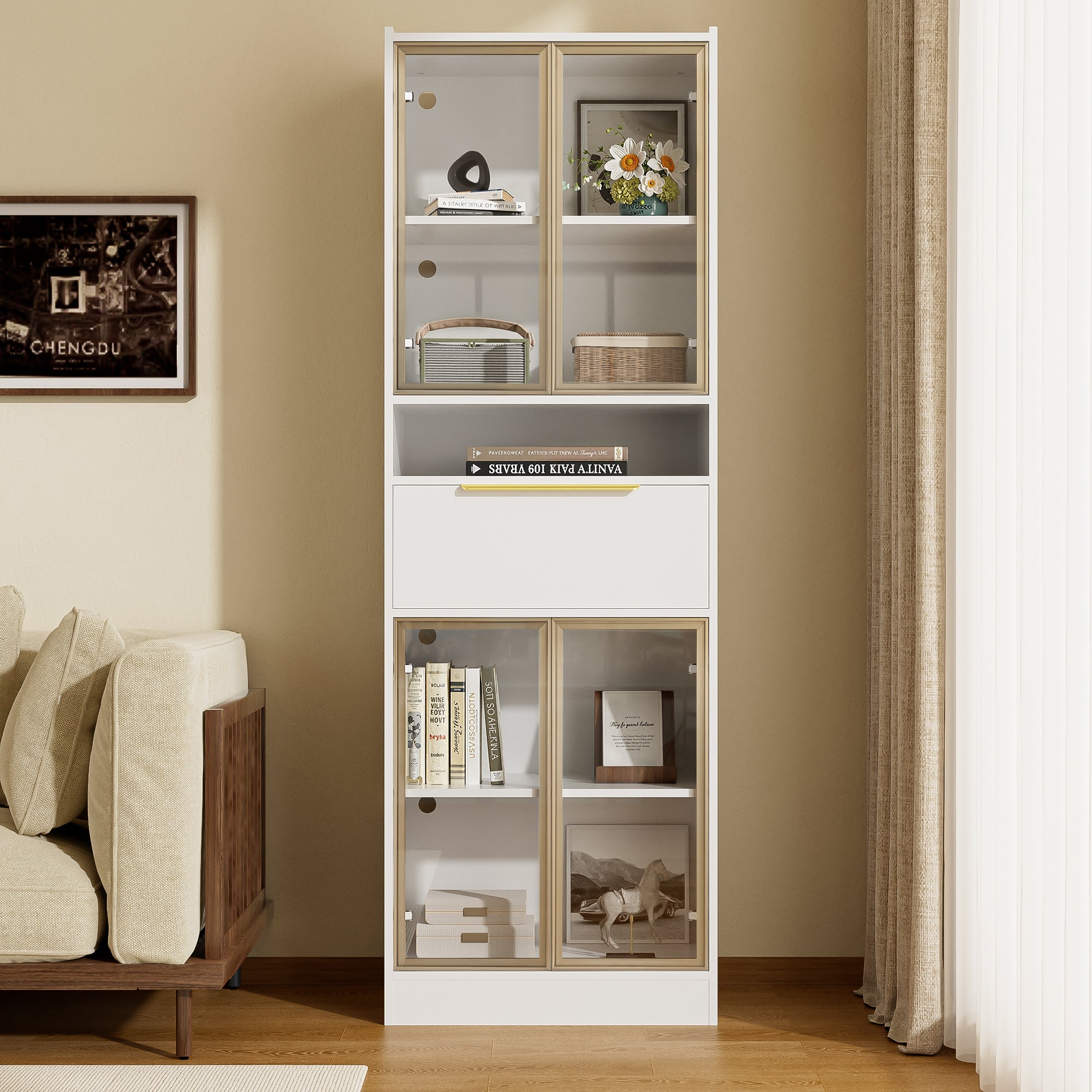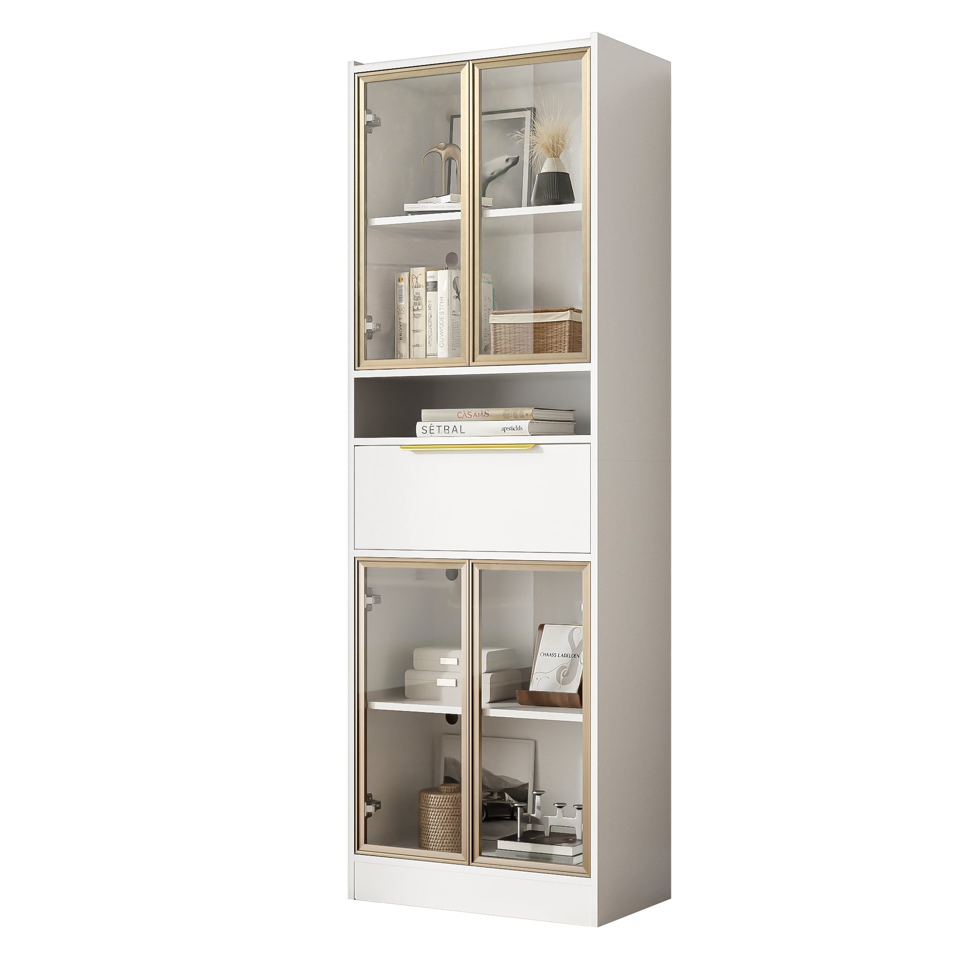 Crafted from high-quality MDF, the tall cabinet offers stability and durability. The four glass doors are made of tempered safety glass, enclosed in robust aluminum frames, allowing a clear view of your books, decorative items, or collectibles while exuding stylish elegance. The doors have no handles, emphasizing the minimalist design. The white drawer, with its elegant gold handle, provides additional storage space while adding a modern touch.