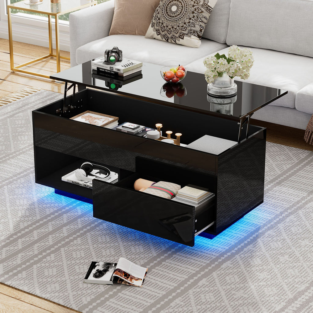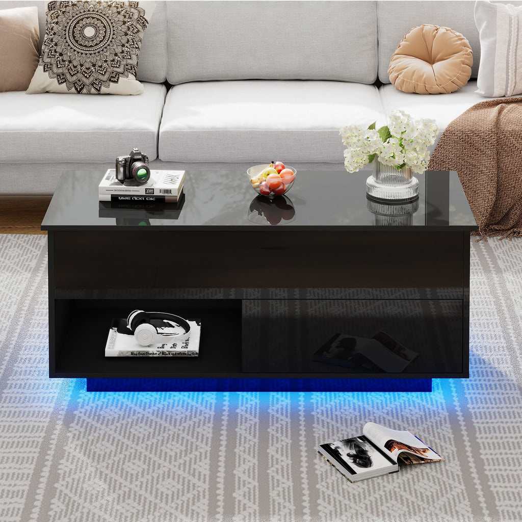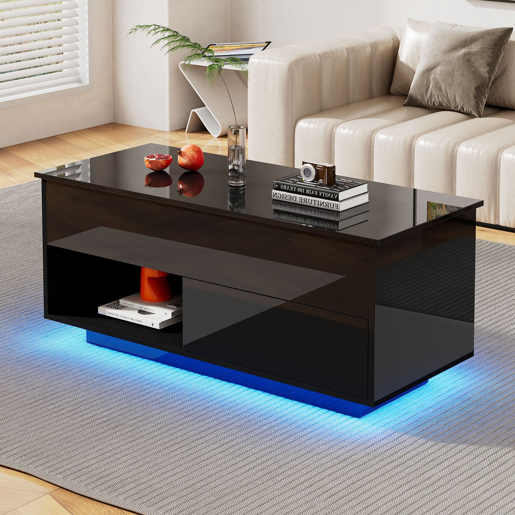 Tea Table, High-Gloss Lift-Up LED with Hydraulic Lift, Black