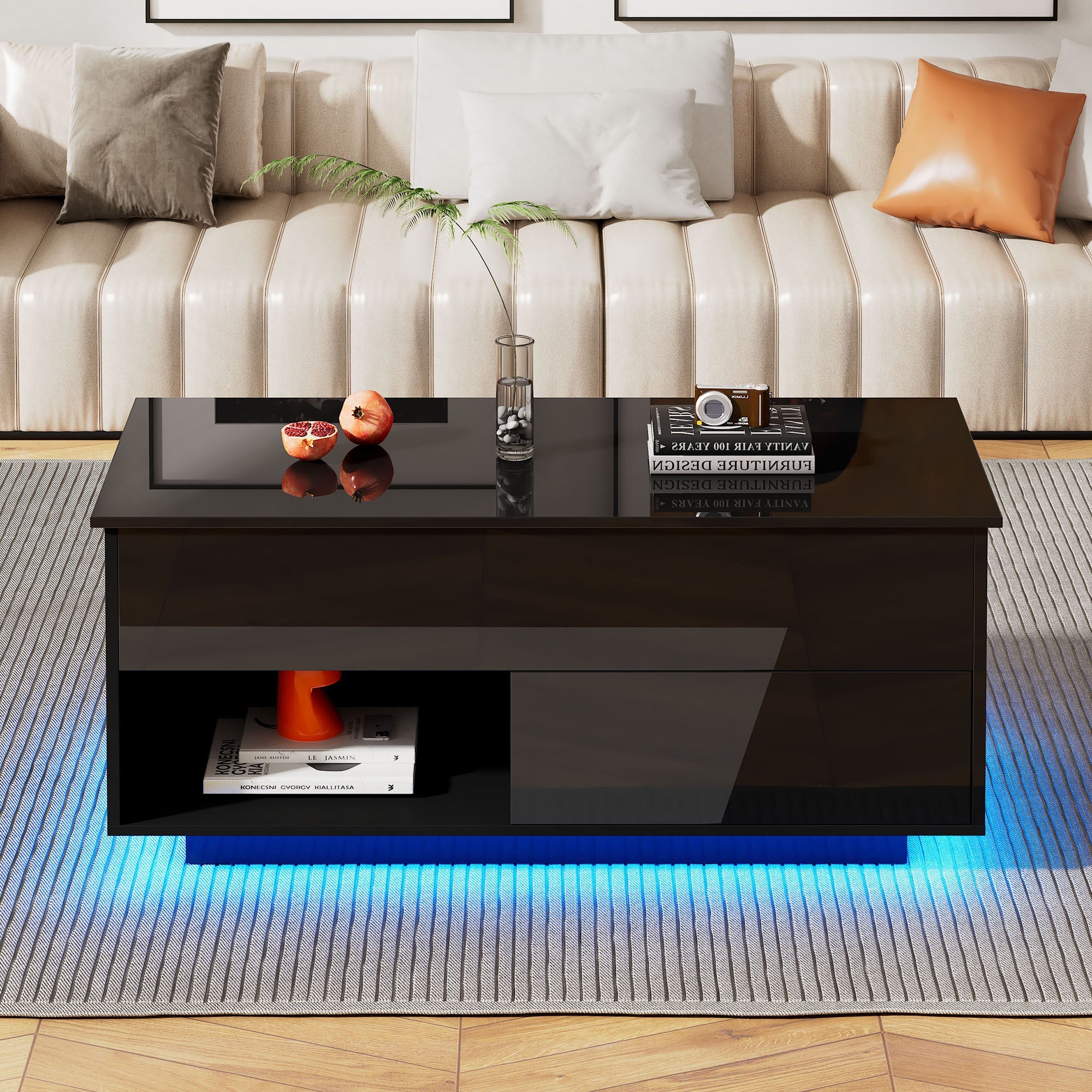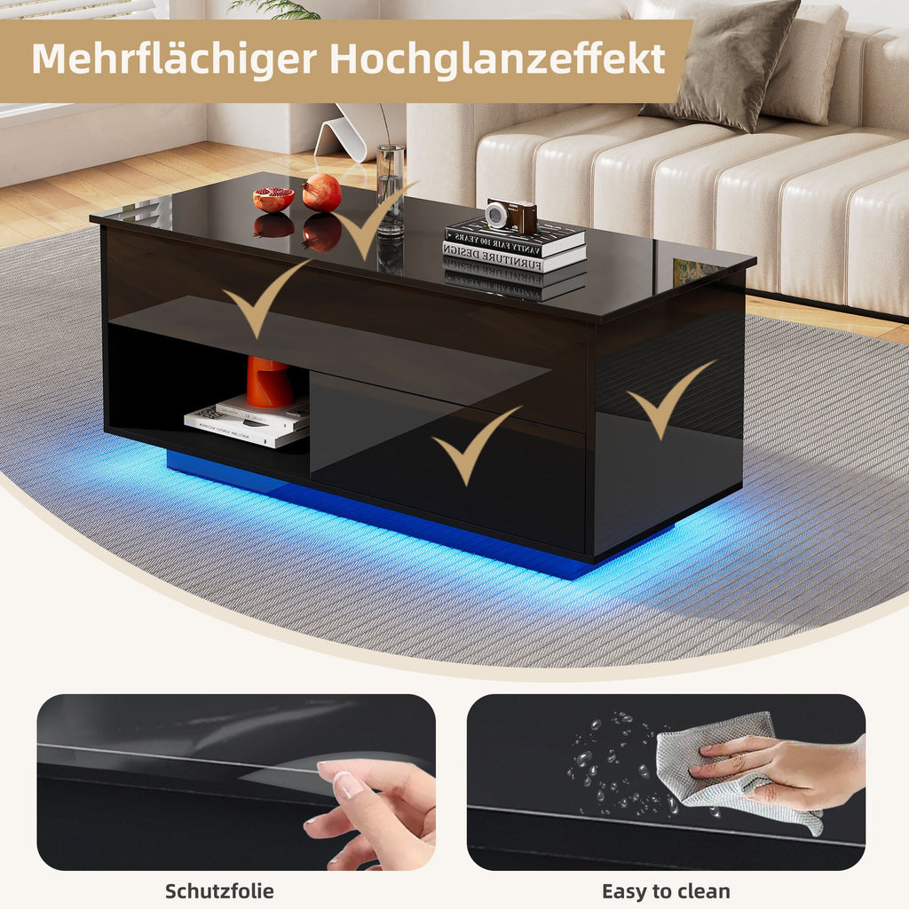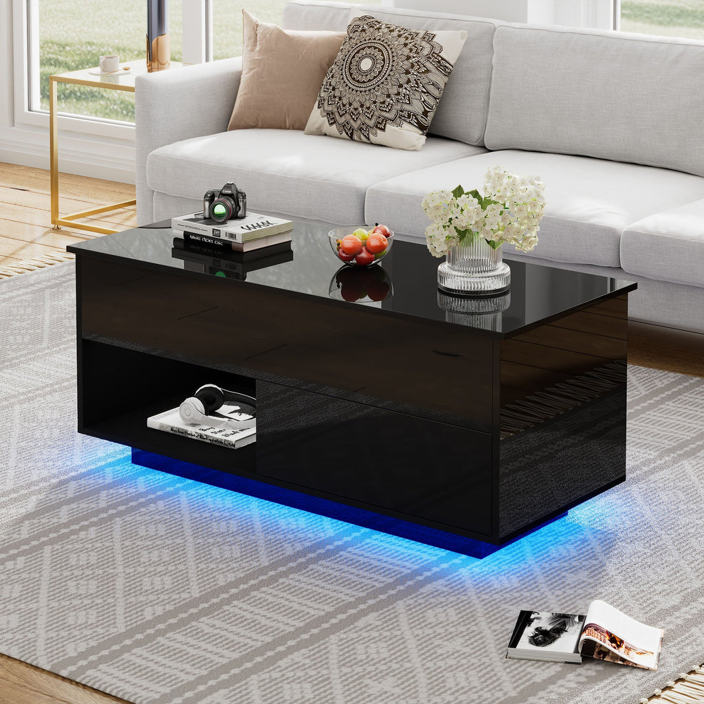 Tea Table, High-Gloss Lift-Up LED with Hydraulic Lift, Black