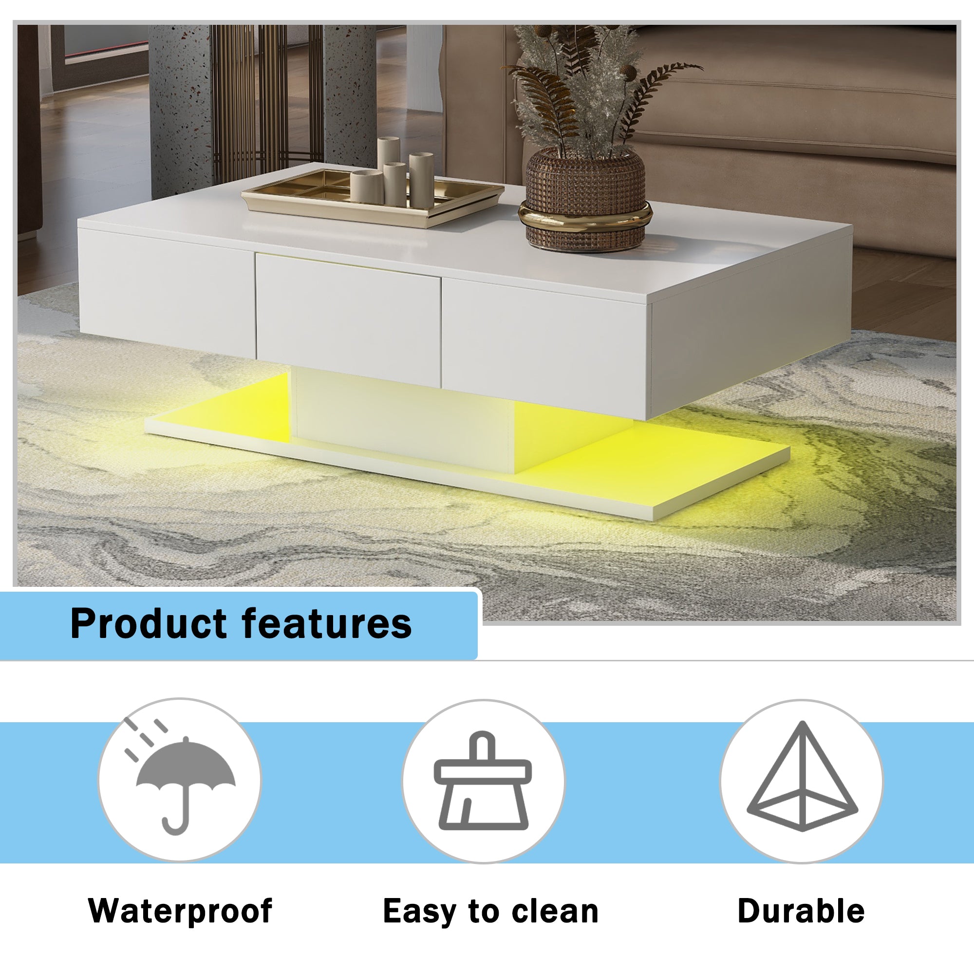 This 2-in-1 table combines a coffee table with LED lights in one product. Therefore, it can be used not only as a side table or storage table but also as an LED light to illuminate the room. This glossy white coffee table is used in many households as a perfect sofa table, office table, and much more. Its minimalist design is perfect for your office, shop, living room, or bedroom.