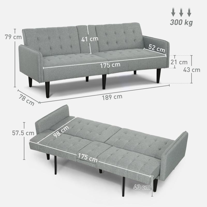 Dimensions: Sofa: 79.5H x 189W x 78Dcm. Bed: 57.5H x 189W x 98Dcm. Seat: 43H 175W x 52Dcm. The maximum load is 300kg. Assembly is required. Made from flame retardant materials.