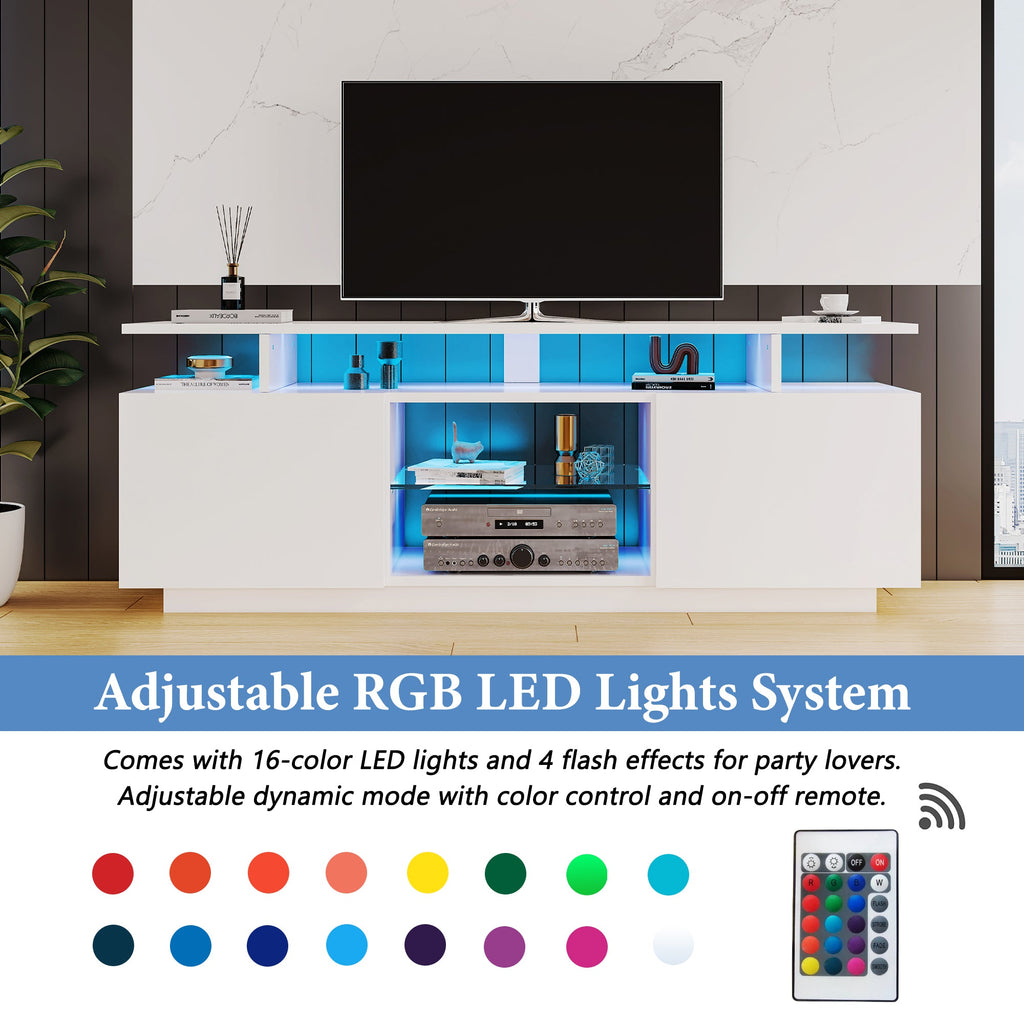With 16-color LED lighting, this TV stand creates a warm and inviting ambiance, adding a modern touch to your living room. The three open shelves in the center provide space for electronic devices and allow for easy access.