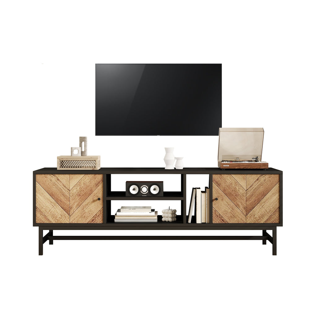 Elevate your home with this black and wood-effect TV cabinet, blending modern design with sophisticated functionality. Its black body perfectly complements the wood-effect doors, featuring a striking inverted V-shape, while sleek black handles complete the elegant look.