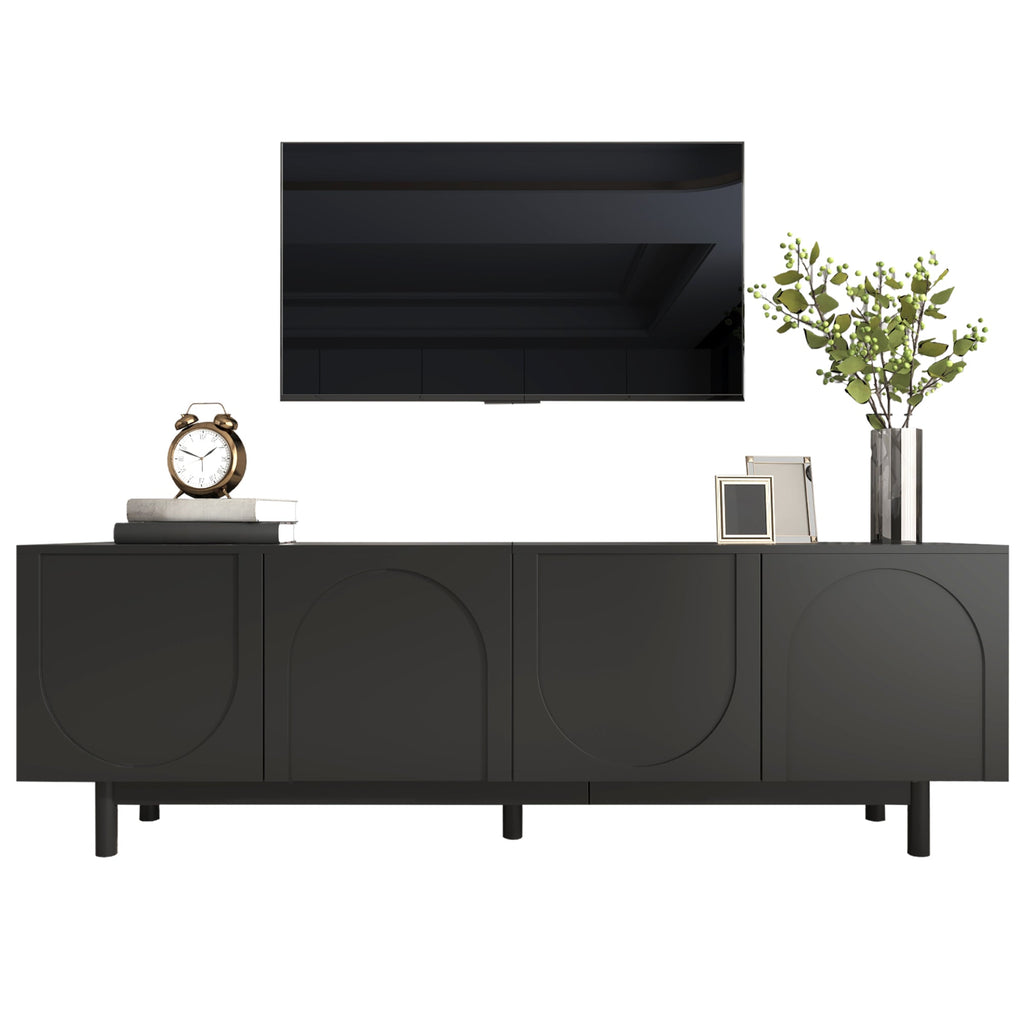 This elegant black TV cabinet combines modern design with practical functionality. Measuring 175 cm x 38 cm x 56 cm, it offers a generous storage solution for multimedia devices, books, and other items. The four uniquely textured doors open without handles using a push-to-open mechanism, emphasizing a minimalist and luxurious appearance.