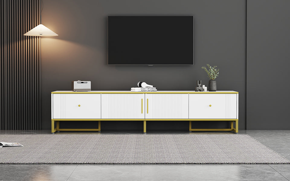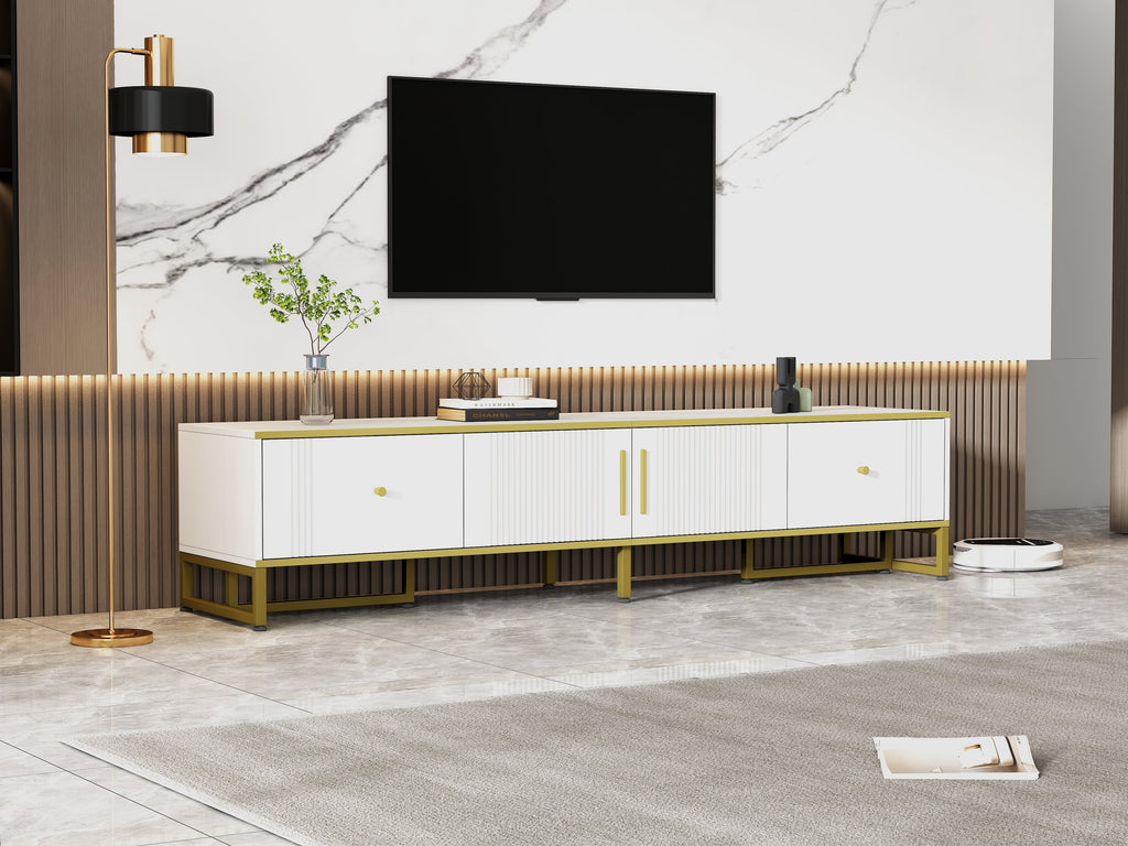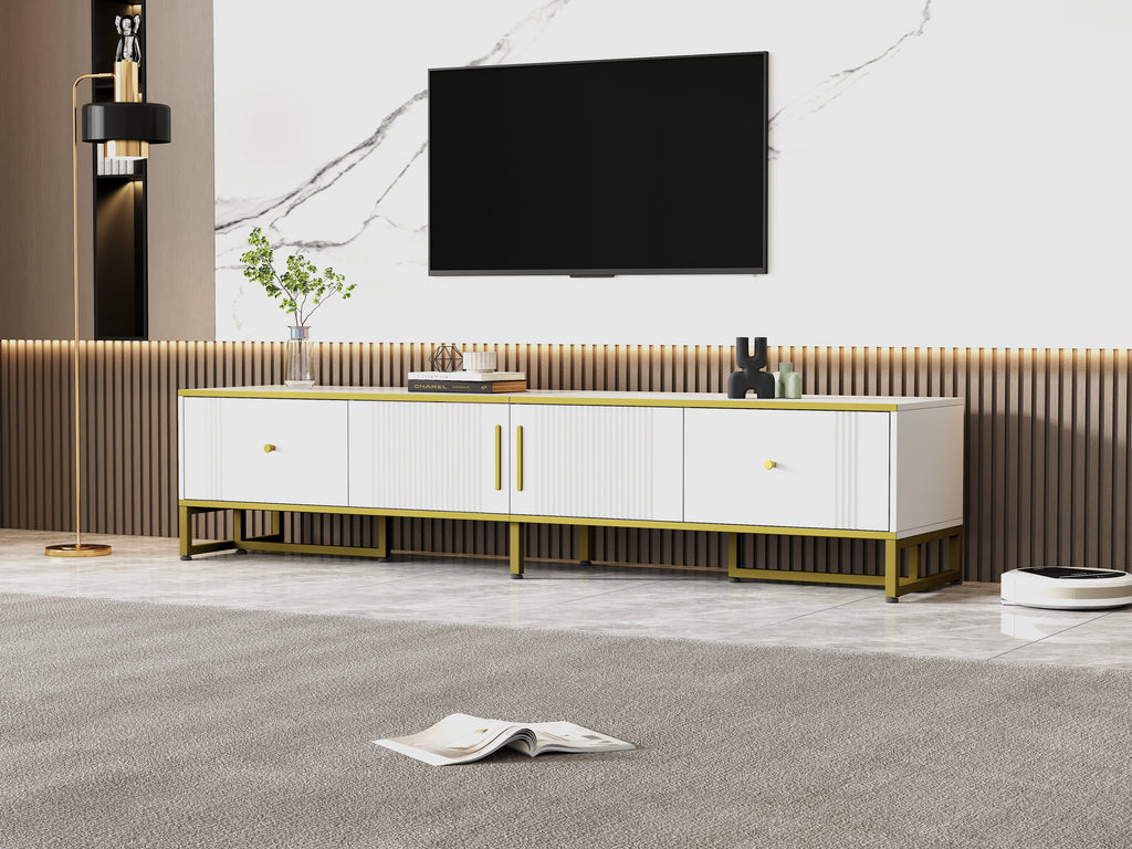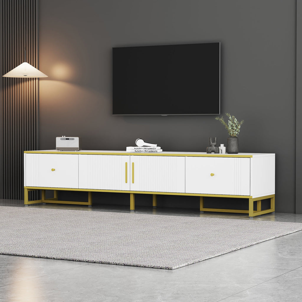 TV Cabinet, 180cm 2 Doors 2 Drawers, Adjustable Feet, Cable Management, 80-inch TV Compatible, White with Gold Edging