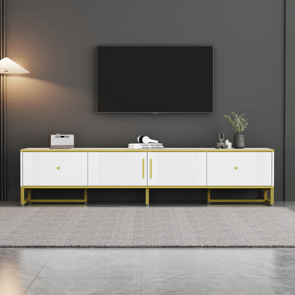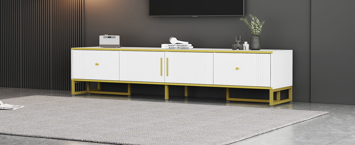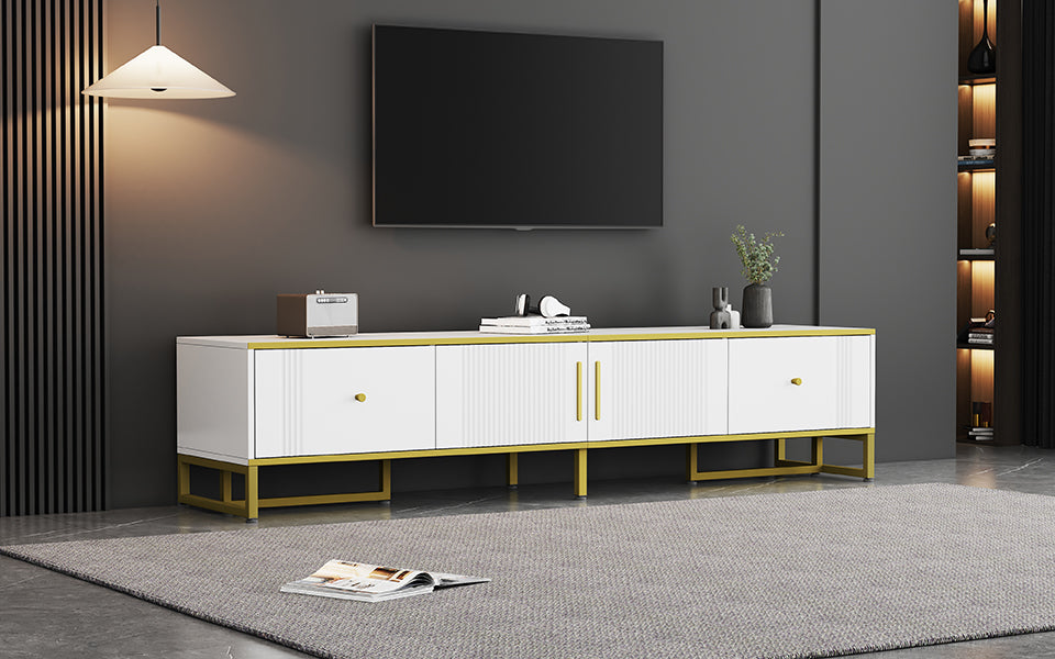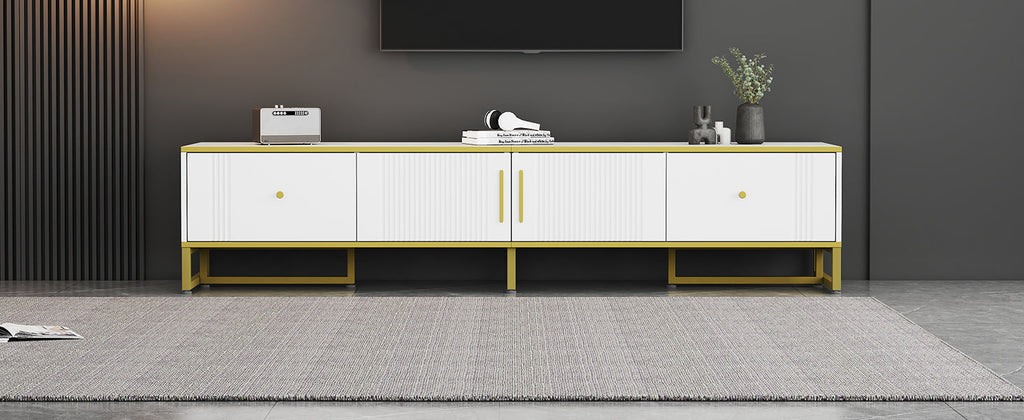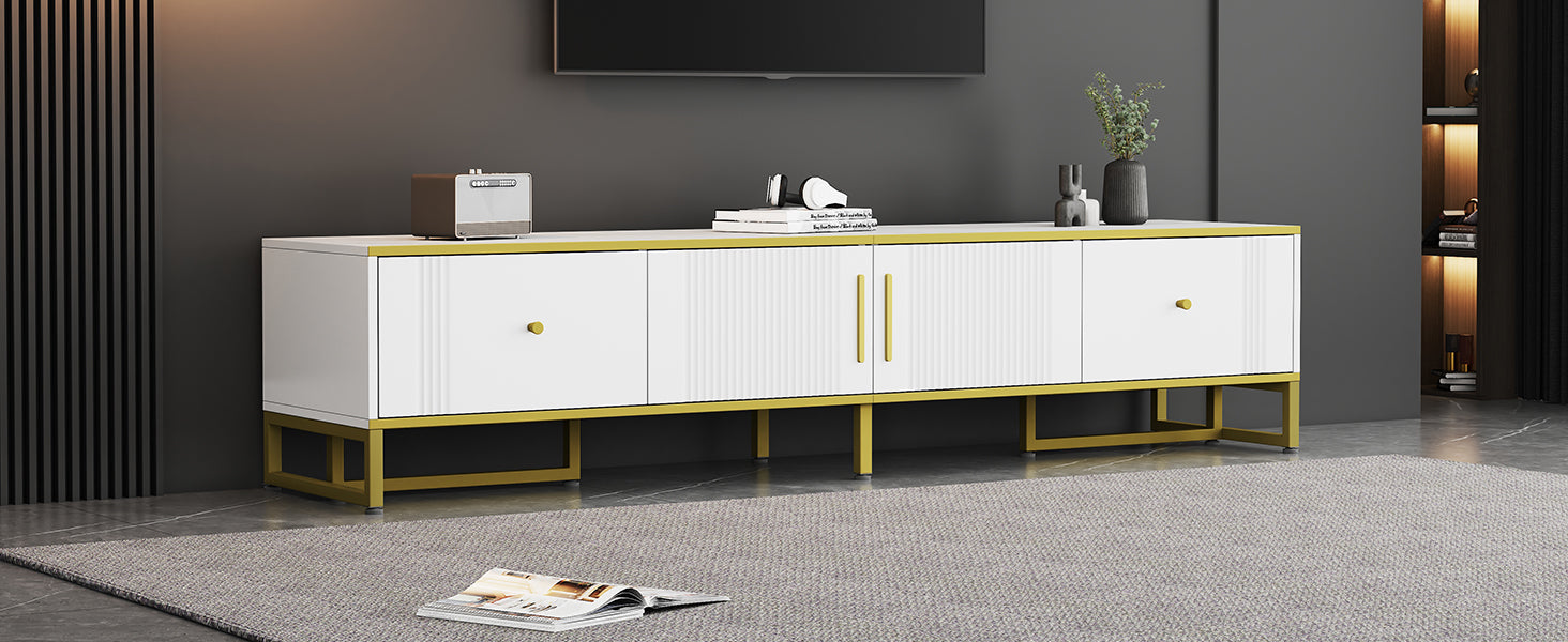 TV Cabinet, 180cm 2 Doors 2 Drawers, Adjustable Feet, Cable Management, 80-inch TV Compatible, White with Gold Edging