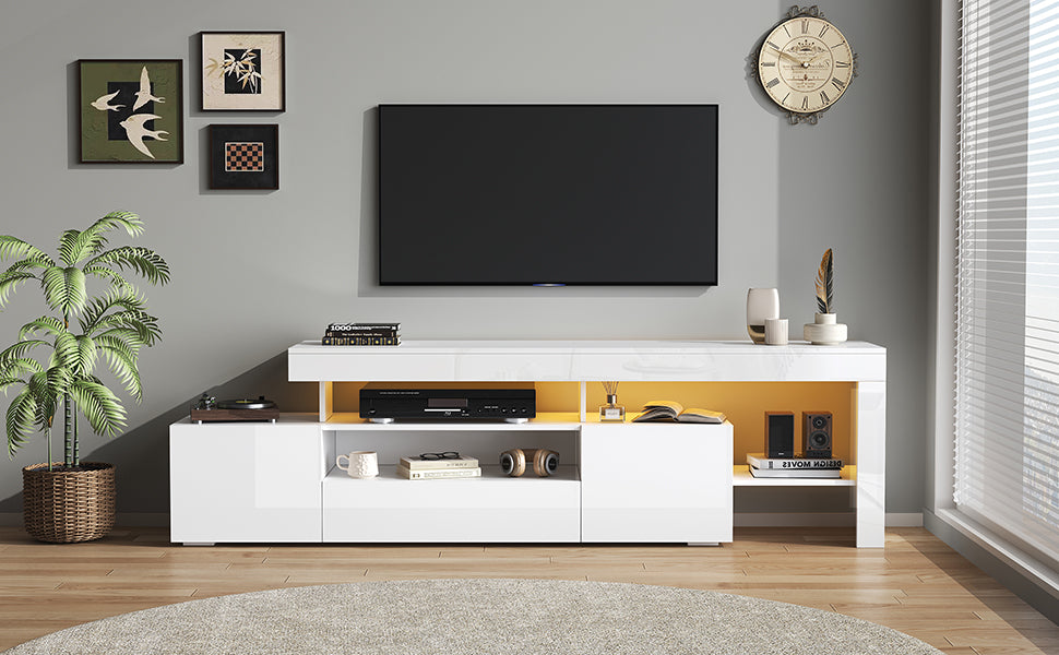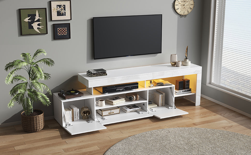 The cabinet features three pull-down doors, offering ample storage space for organizing your living room. The wide tabletop, semi-open drawers, and open shelves provide additional storage. LED lights create a sophisticated and warm atmosphere, adding style and elegance to your living room.