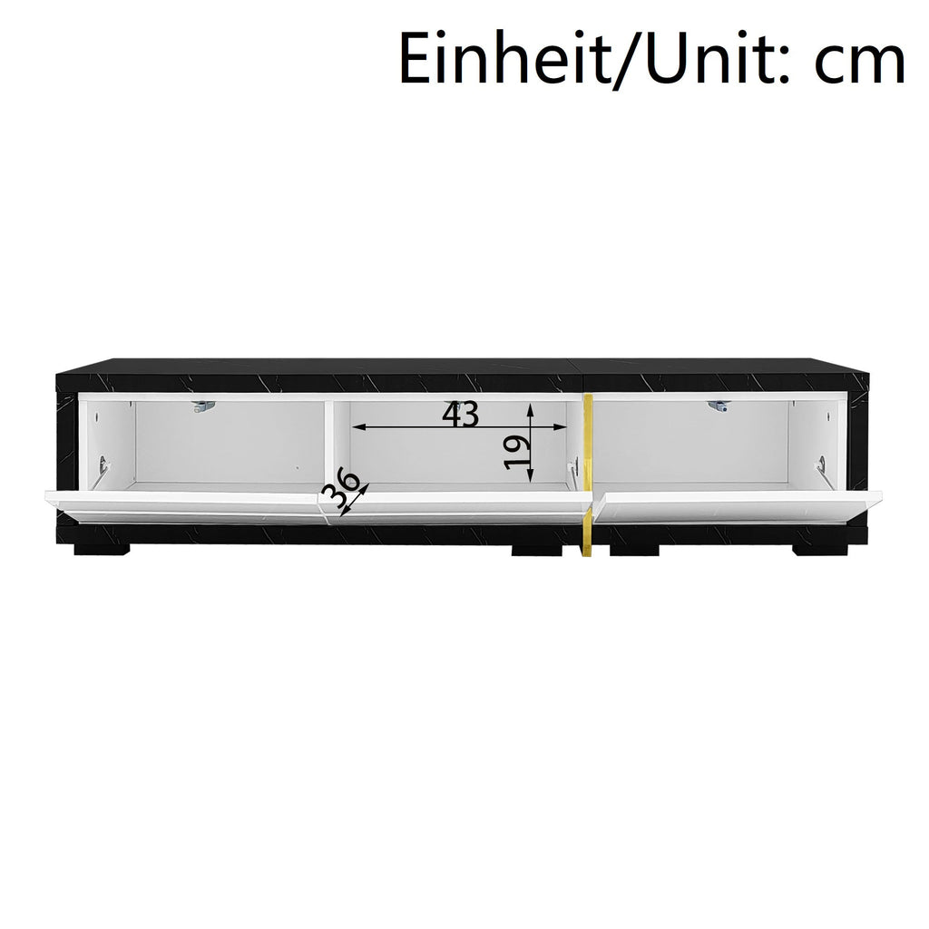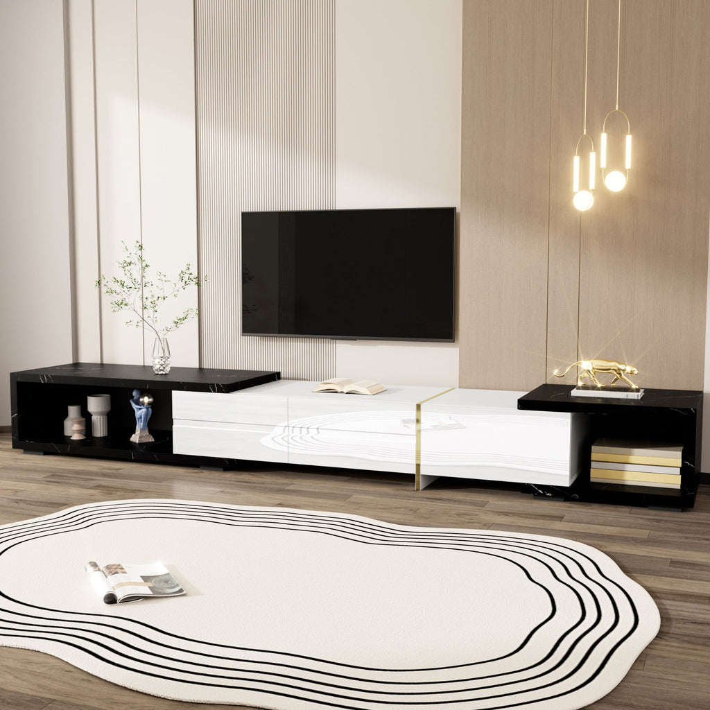 TV Cabinet, Adjustable Length (140-260 cm) Swivel, Black Marble, White High-Gloss Matte, Gold Trim
