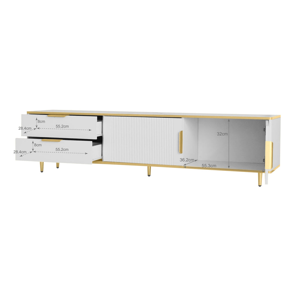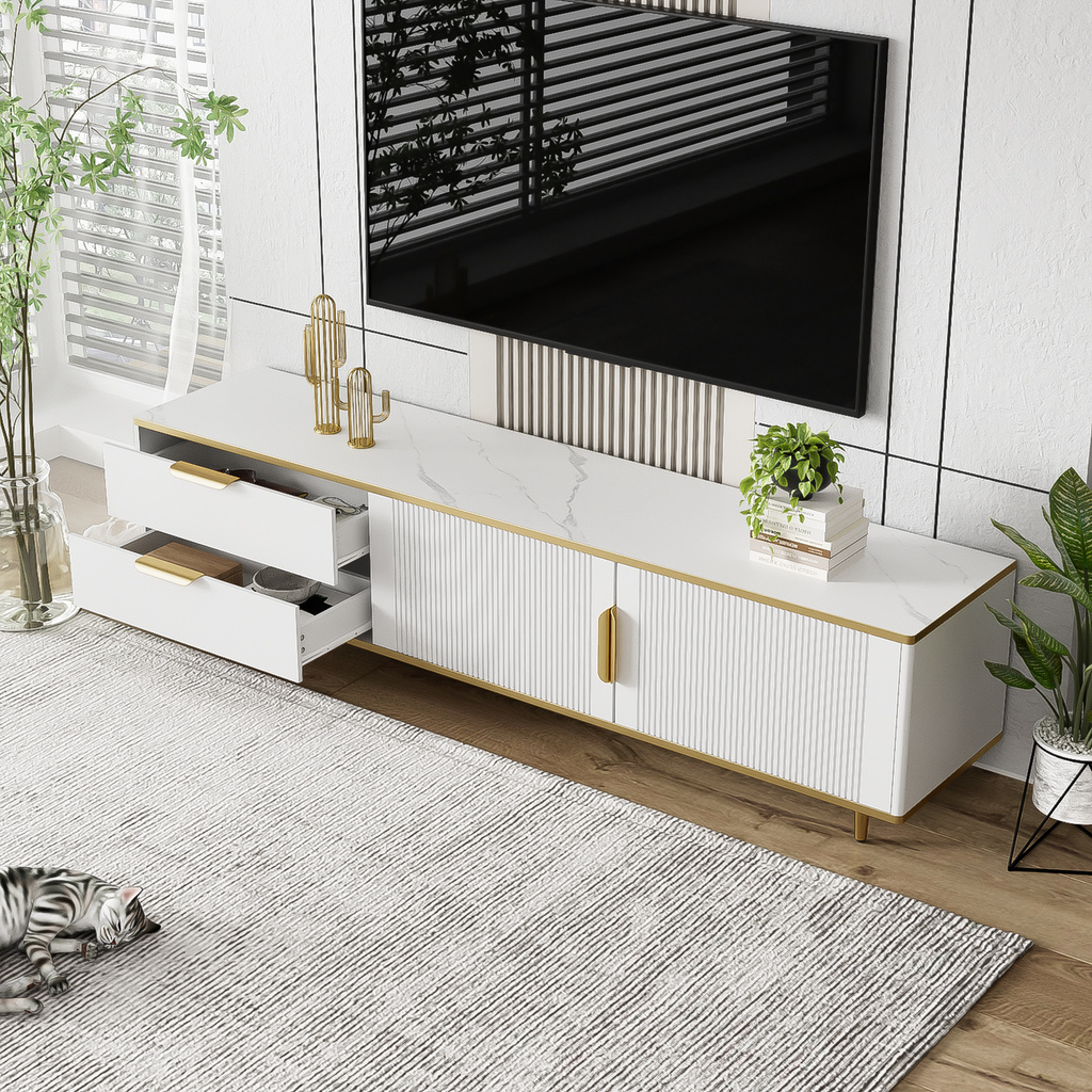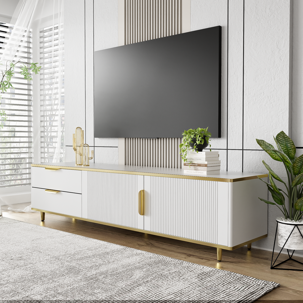 This TV cabinet combines a simple and elegant design. The clever combination of white and gold highlights its nobility and elegance. The two drawers on the left side provide practical storage space. Two storage doors in the middle and on the right cabinet door easily accommodate books, audiovisual equipment, and other everyday necessities, keeping life tidy and organized.