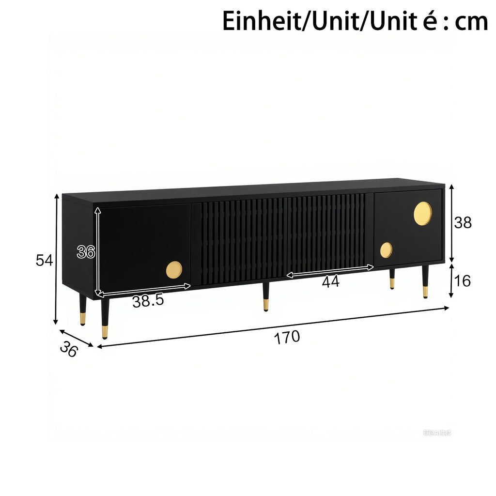 A sophisticated opening system ensures ease of use. The middle door has an anti-rebound design for smooth opening and closing, while the side doors feature concealed handles and gold details, combining comfort and aesthetics. For added safety, an integrated anti-tip feature prevents the stand from tipping over, which is especially important for homes with children or pets. Cable management holes are also included for convenient storage and organization. The sturdy legs, also adorned with gold accents, are not only durable and stable but also adjustable to different floor heights for added convenience. The combination of sophisticated design, practical functionality, and high-quality craftsmanship makes this TV stand a stylish and secure piece of furniture that adds elegance and order to any room.