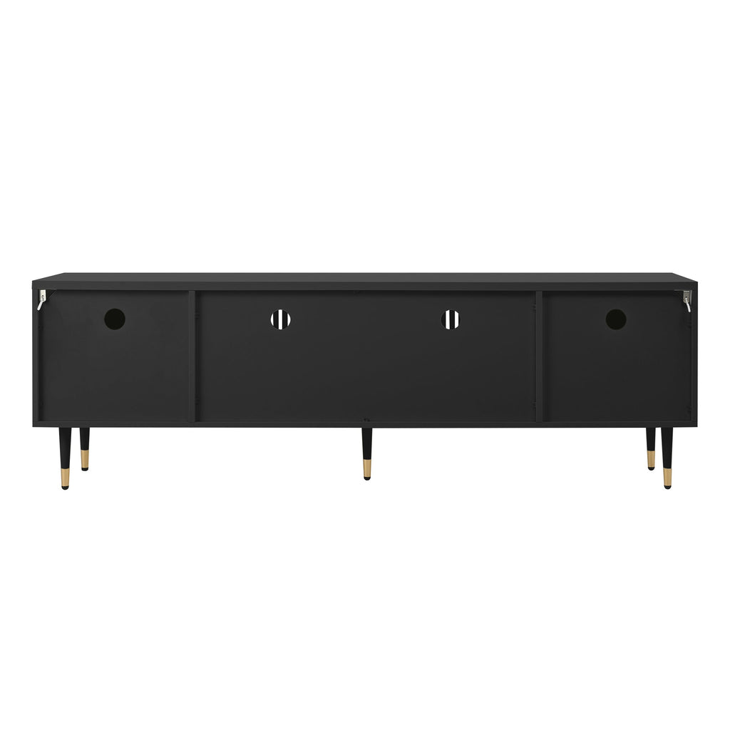 This TV stand combines elegant design with exceptional functionality, fitting perfectly into any modern home. It features four doors, two with a modern lattice design and two with gold accents, seamlessly blending classic and contemporary charm.