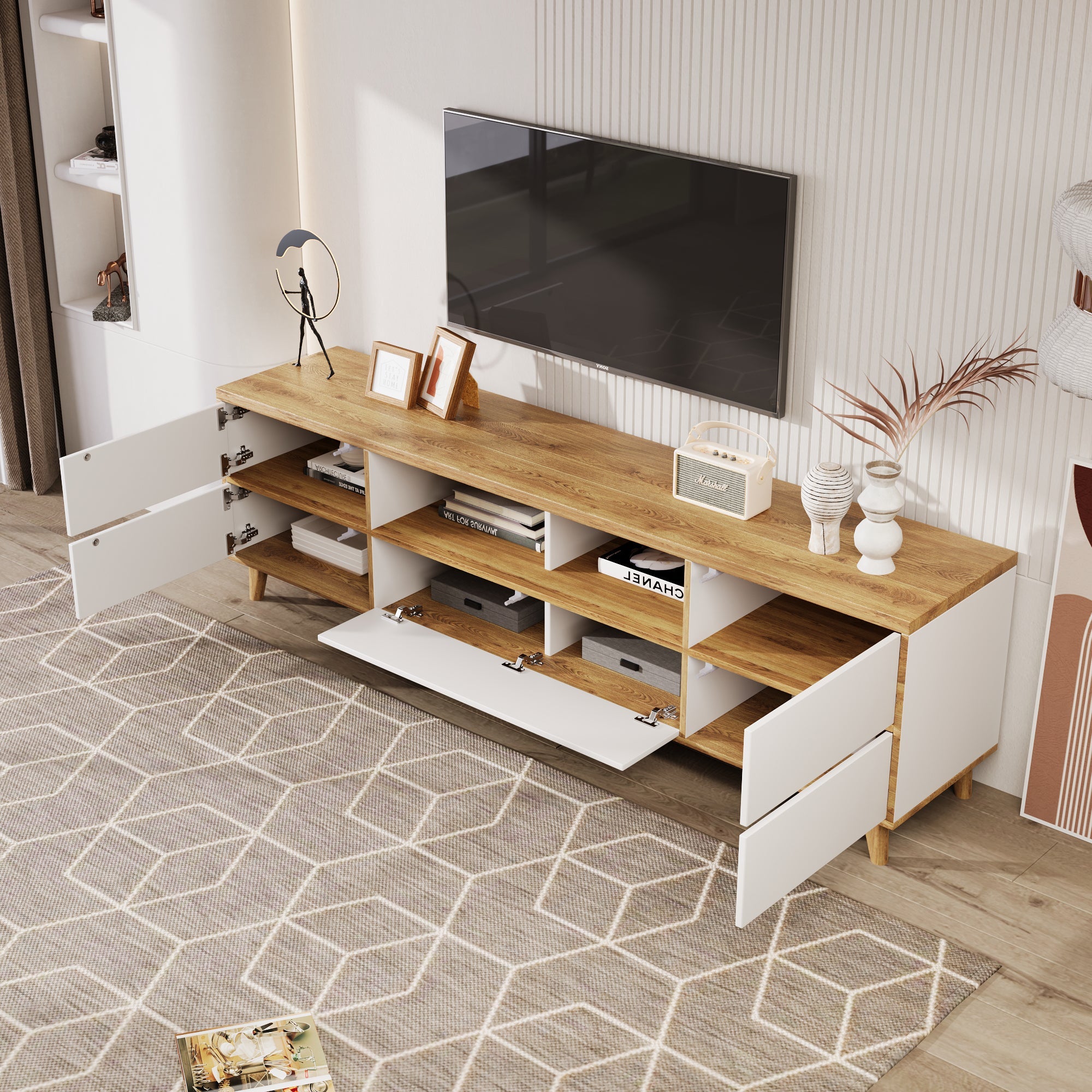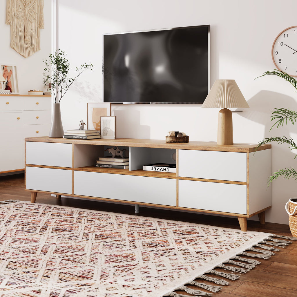 This TV stand (175 x 37 x 51 cm) features a brilliant white and warm wood design, offering a stylish color combination for contemporary elegance. It provides perfect presentation for your TV with practical storage space, combining aesthetics and functionality. Add a stylish accent to your living room with this high-quality E1 grade board, which is durable and environmentally friendly.