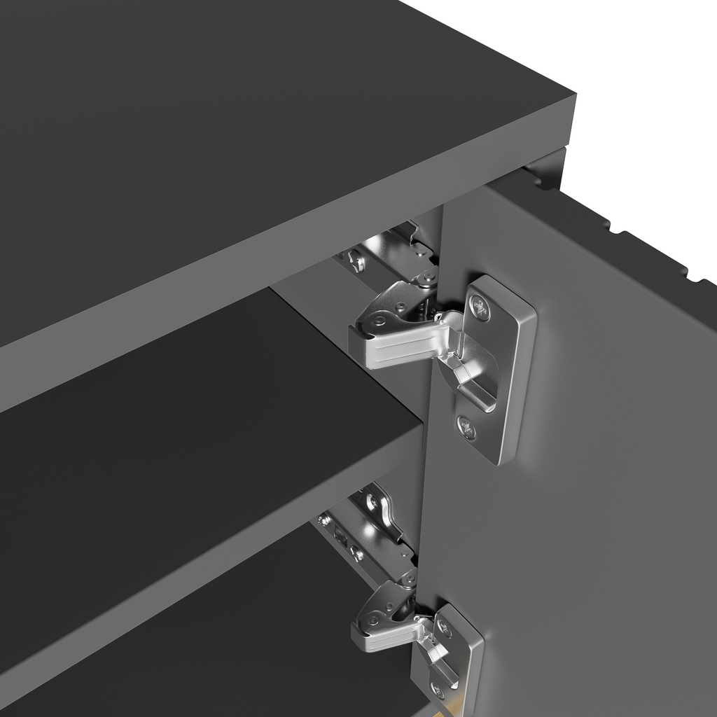 Spacious door compartments keep your media equipment and accessories organized and out of sight, offering versatile storage solutions for a variety of items. The sturdy, gold-colored metal legs not only enhance the cabinet's appearance but also ensure strong support, with a height of 15.5 cm and adjustable feet ensuring stability on any surface. This TV stand fits seamlessly into various room configurations and adds modern elegance to your interior.
