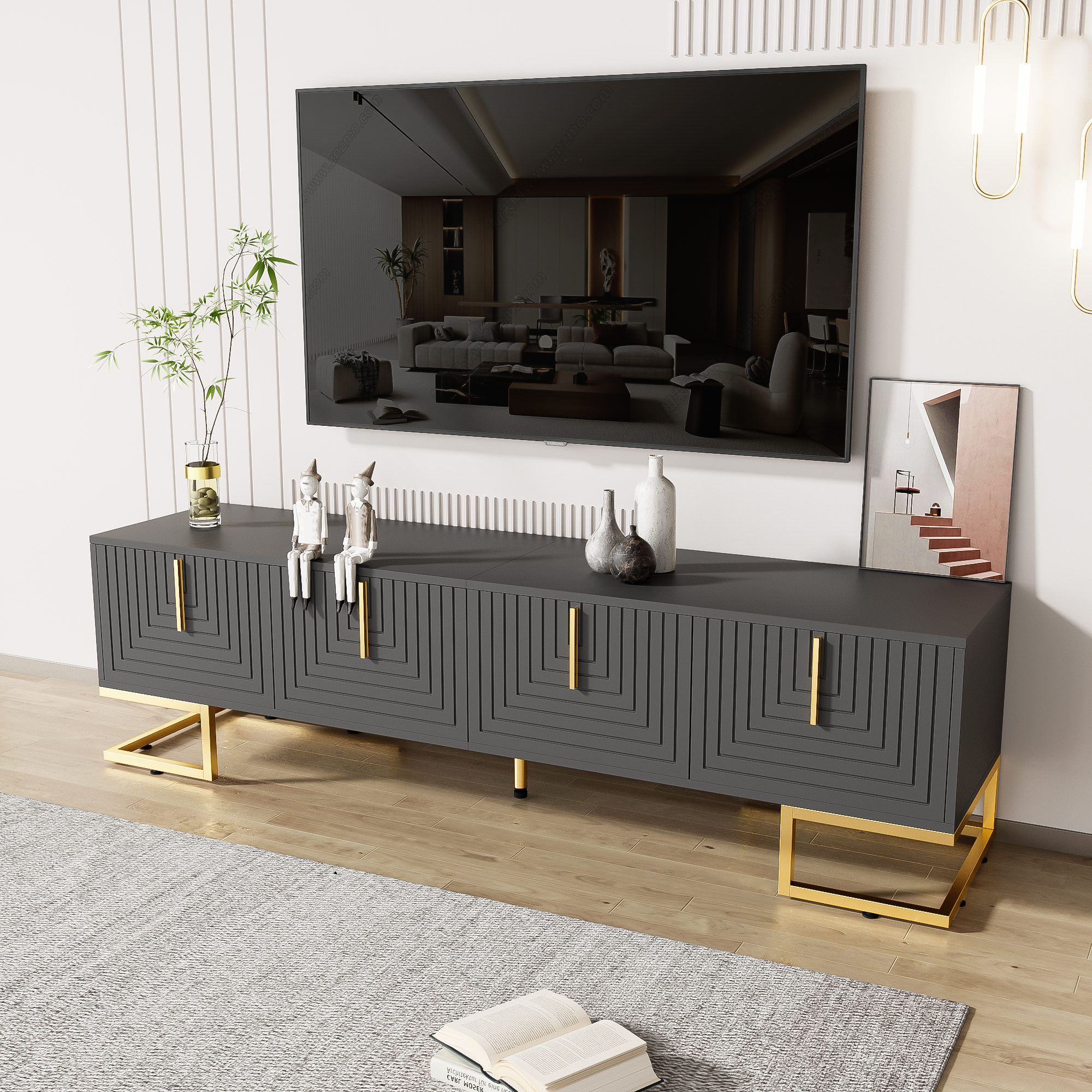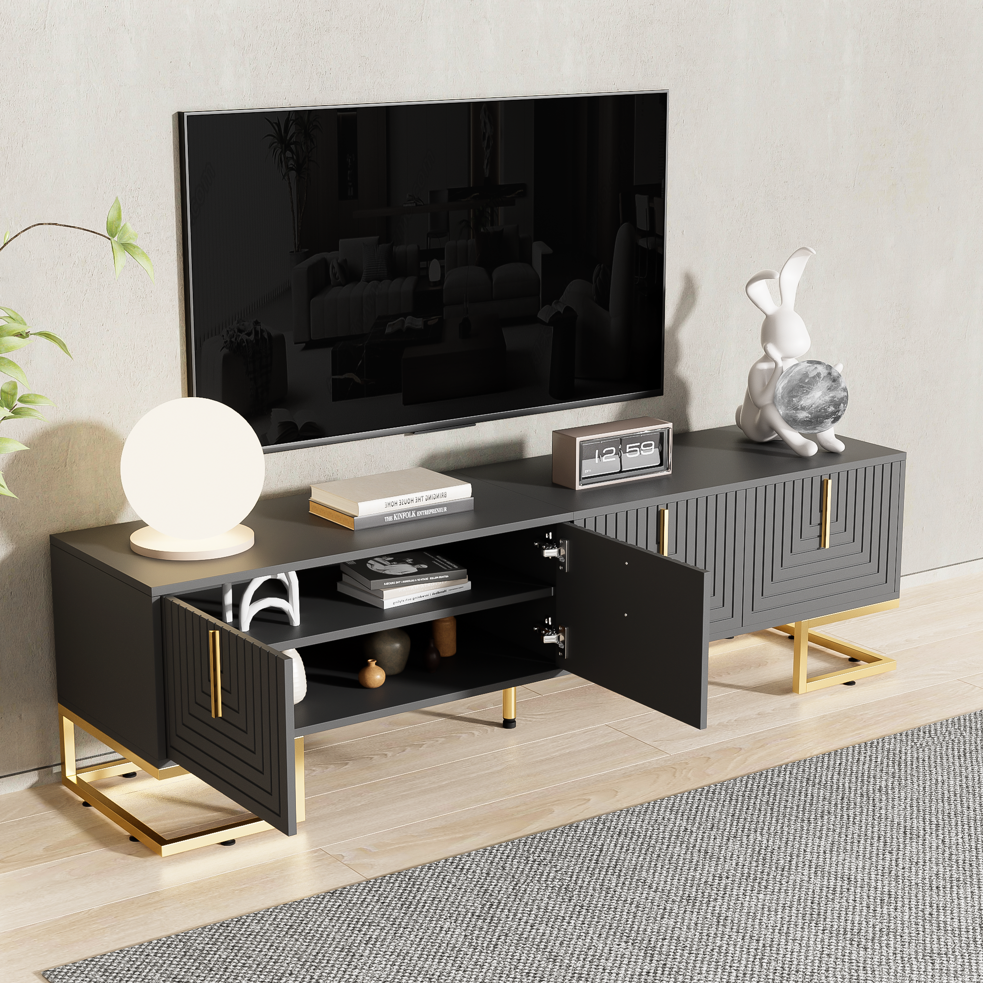 TV Cabinet, Lowboard with Textured Door, Gold Handles & Feet