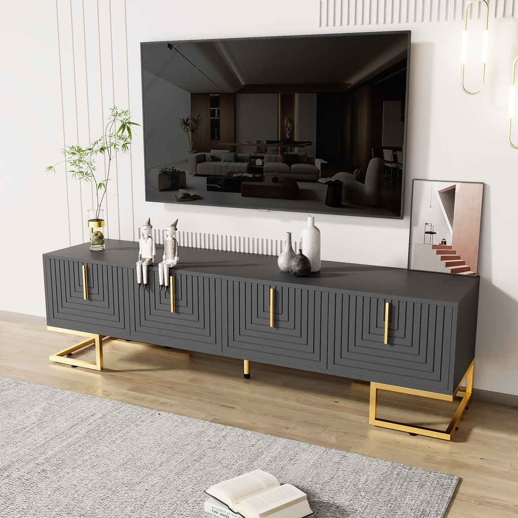 This stunning TV stand combines elegance and functionality, making it the perfect addition to any modern living space. It measures 170 cm long and features a sleek gray-black finish with a distinctive texture and luxurious gold accents on the handles and legs.