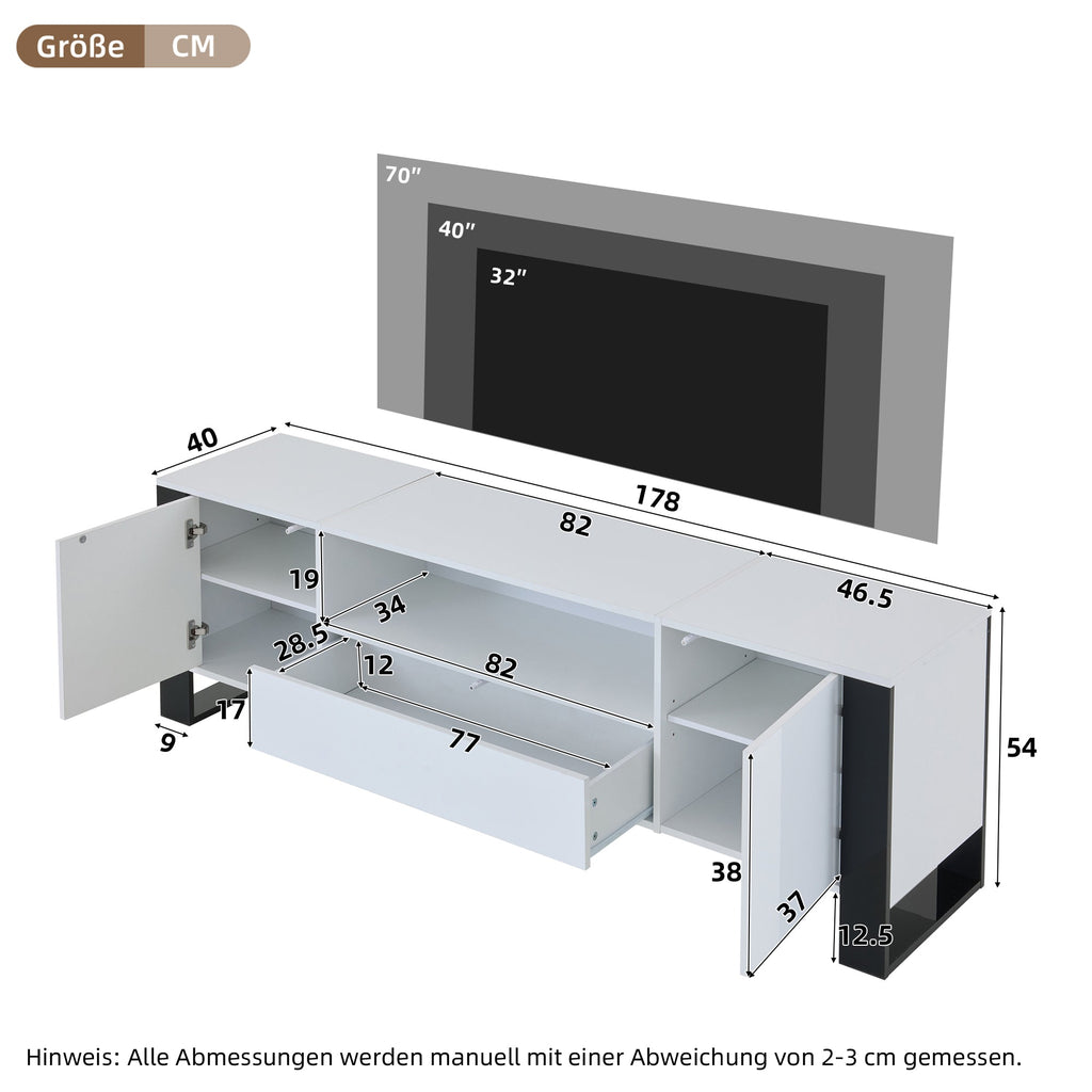 This stylish TV cabinet in brilliant white high-gloss is a real highlight for your living room. With generous dimensions of 178 x 40 x 54 cm, it accommodates TVs up to 70 inches. The elegant black high-gloss legs, which extend from the top to the bottom, provide stability and a modern design.