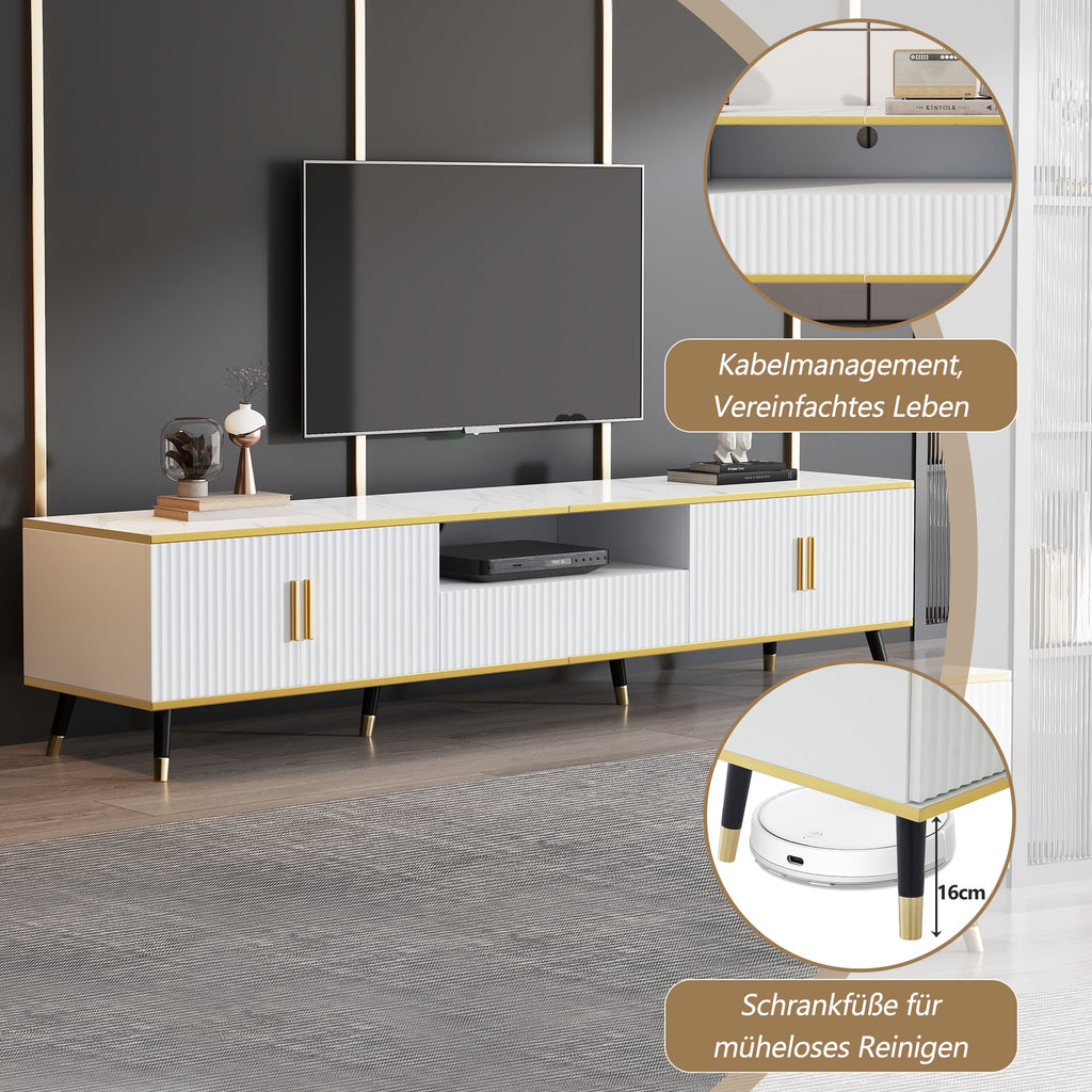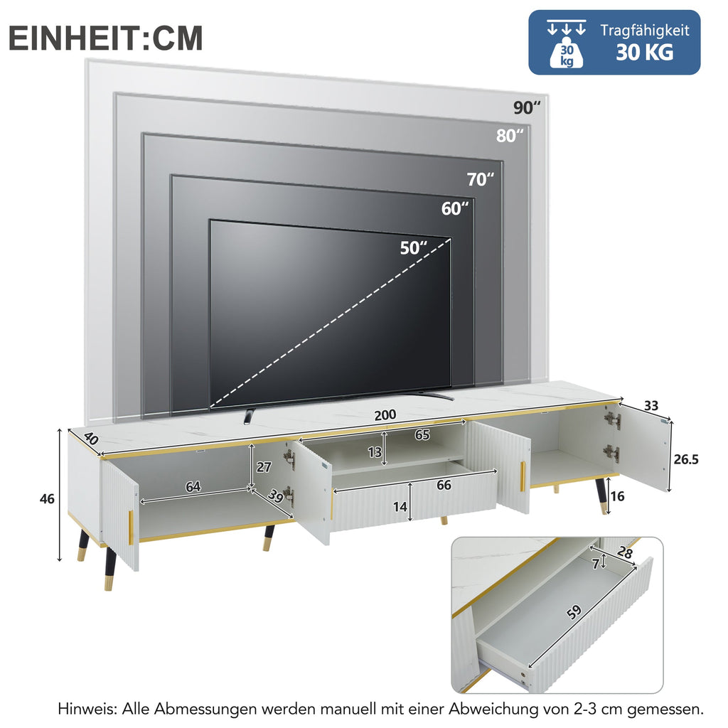 This elegant white TV cabinet combines modern design with practical functionality, making it the perfect solution for your home theater setup. With generous dimensions of 200 x 40 x 46 cm, this cabinet offers ample space to stylishly display TVs up to 90 inches.