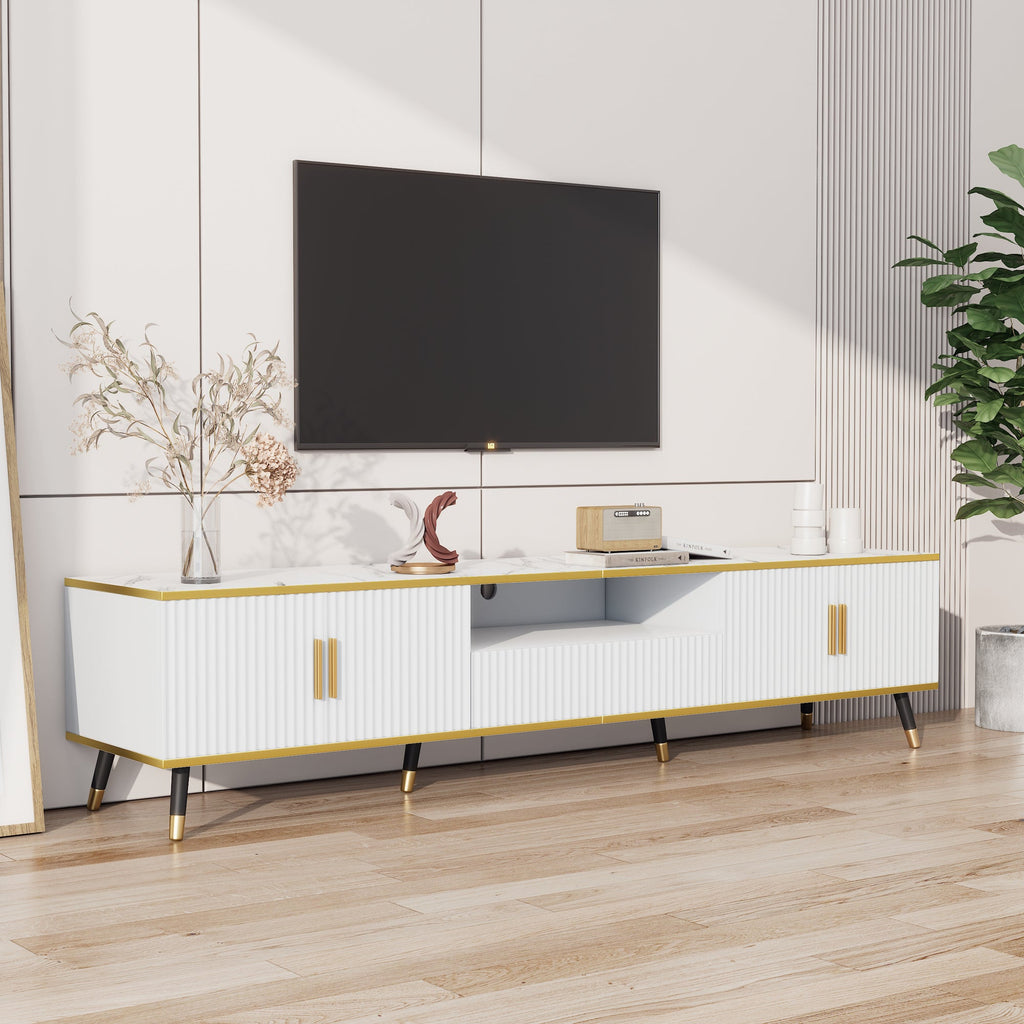 The tabletop features a sophisticated marble finish, giving the furniture a luxurious appearance that complements both modern and classic interiors. Behind the two doors and in the additional drawer, there's ample storage space for neatly organizing media devices, cables, and other items.