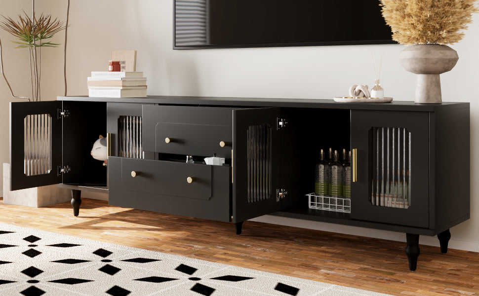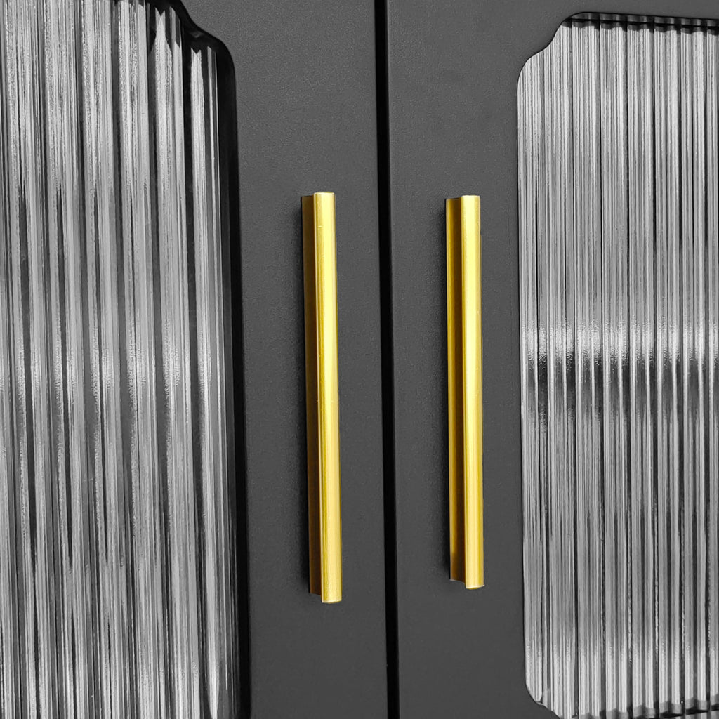 This elegant TV cabinet is the perfect combination of functionality and beauty. It measures 175 x 38 x 55.5 cm and offers plenty of space for your entertainment system and more. All four doors are covered with ribbed tempered glass, creating a unique play of light and shadow that will add a special touch to your living room. Stylish drawers open at the touch of a button and provide generous storage space. Gold handles and metal feet complete the high-quality design.