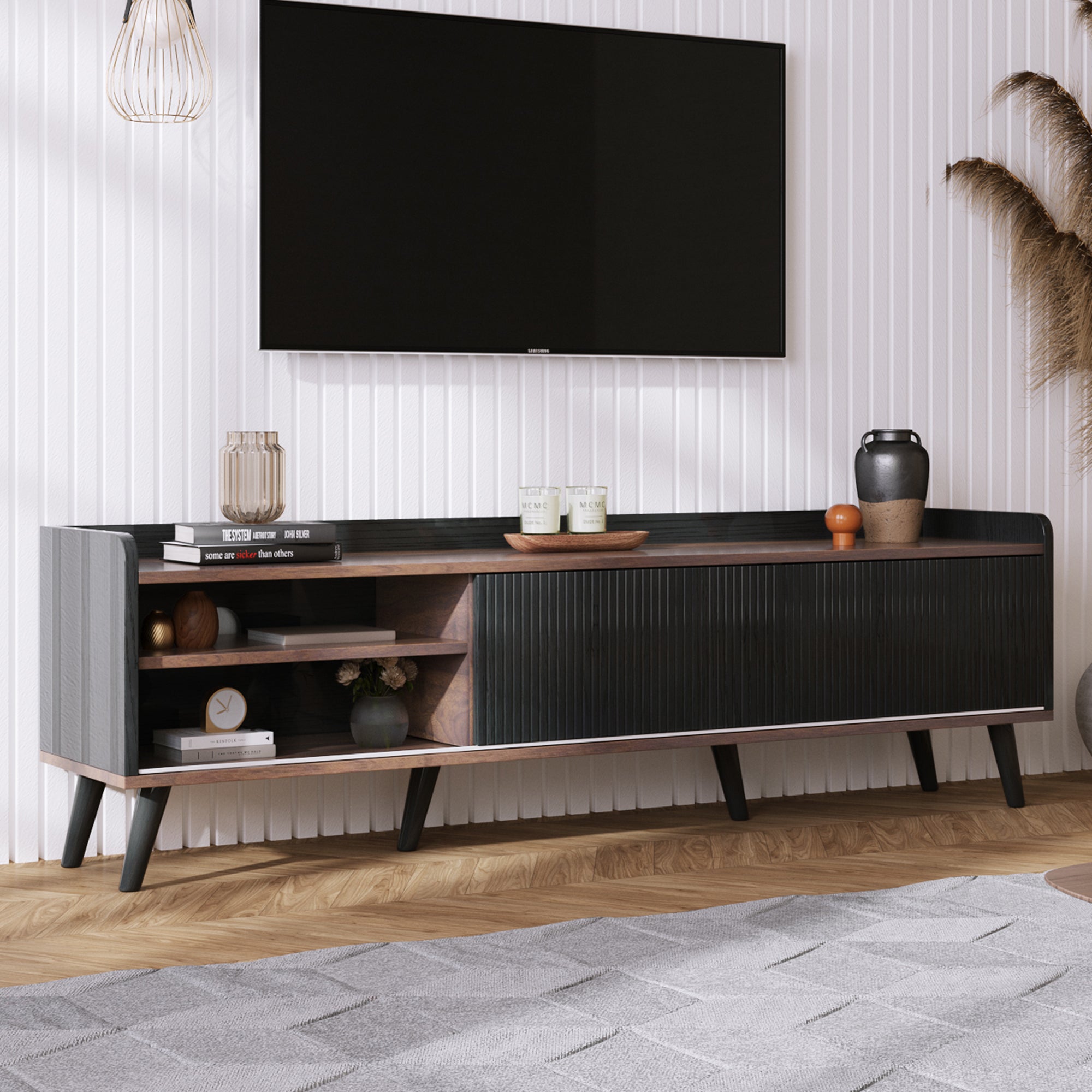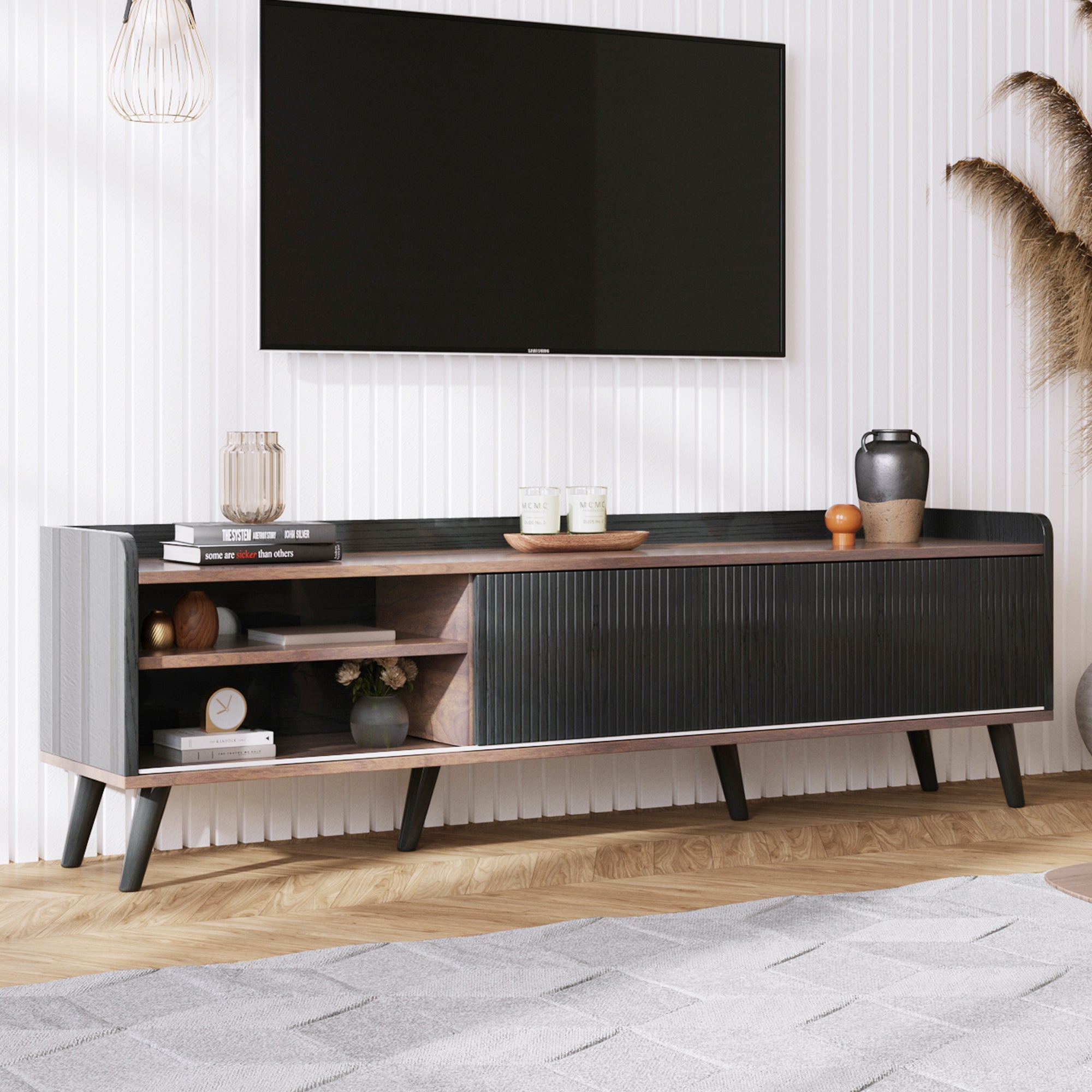 Display your TV furniture and store your small items with our stylish TV stand. Striped sliding doors on both sides reveal interior shelves, while the two middle drawers are perfect for storing smaller items. The top of the cabinet has a raised lip to prevent items from sliding off, and the wooden legs provide stability. This versatile design is perfect for your living room, and its striped door adds a touch of elegance to your decor. Add this cabinet to your collection today.