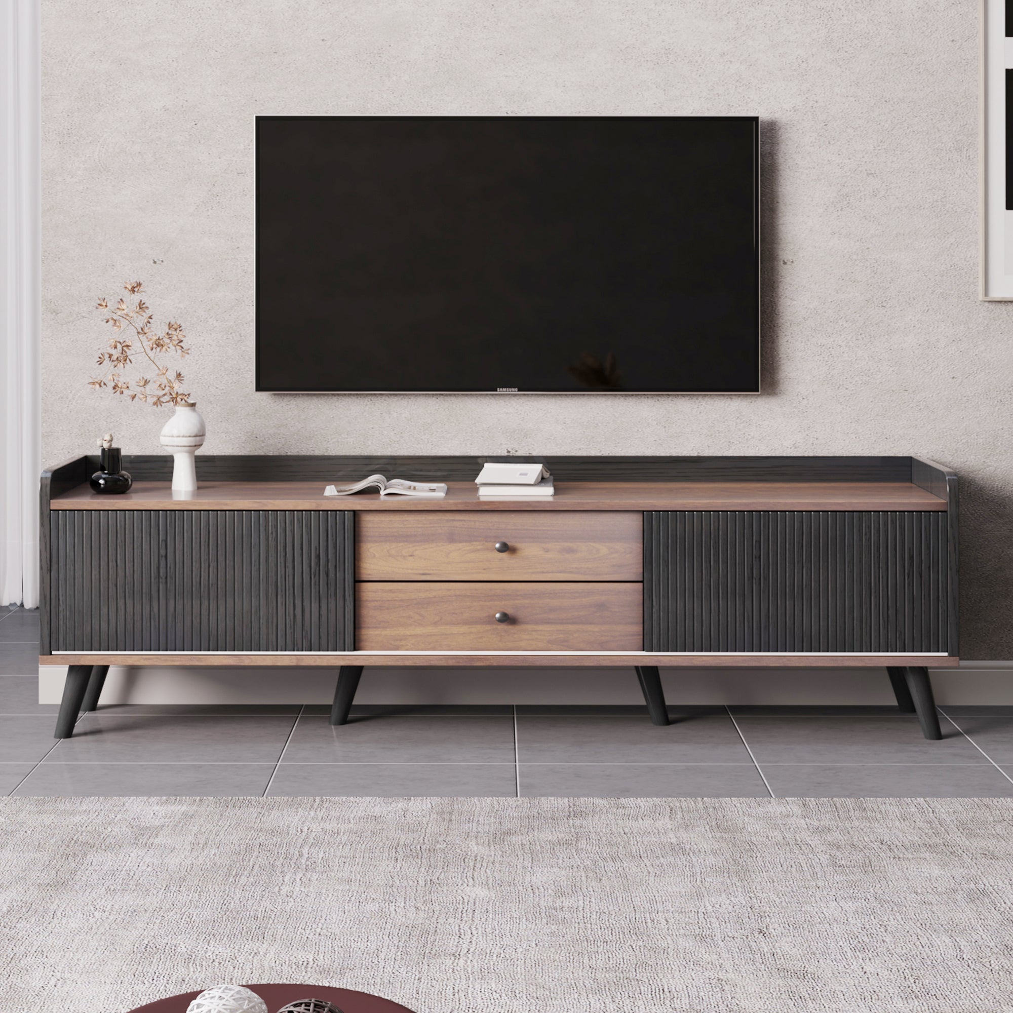 TV Cabinet, Two Drawers Sliding Doors Lowboard, Black and Natural Wood