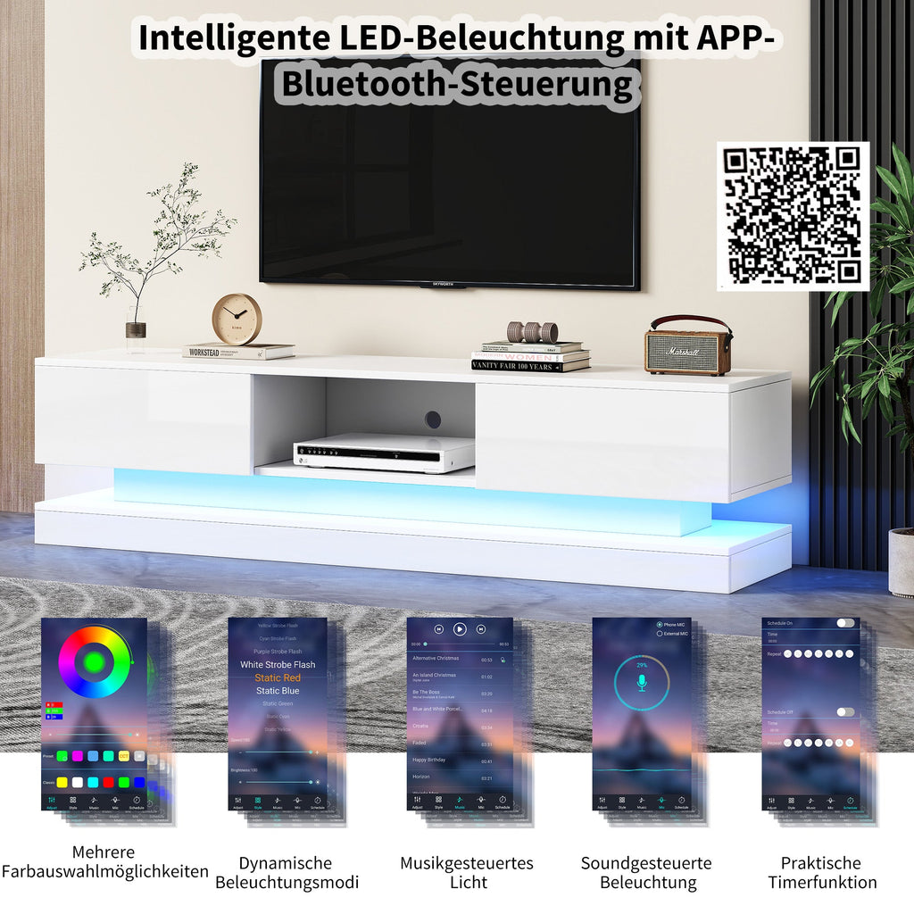 A special highlight of this TV cabinet is the integrated LED lighting, which shines in multiple colors. These LEDs can be conveniently controlled via an app that connects via Bluetooth. With the app, you can adjust the color, brightness, and temperature of the lighting and even set timers for turning the LEDs on and off. This feature gives your living room a modern atmosphere and provides customizable lighting to suit every mood.
