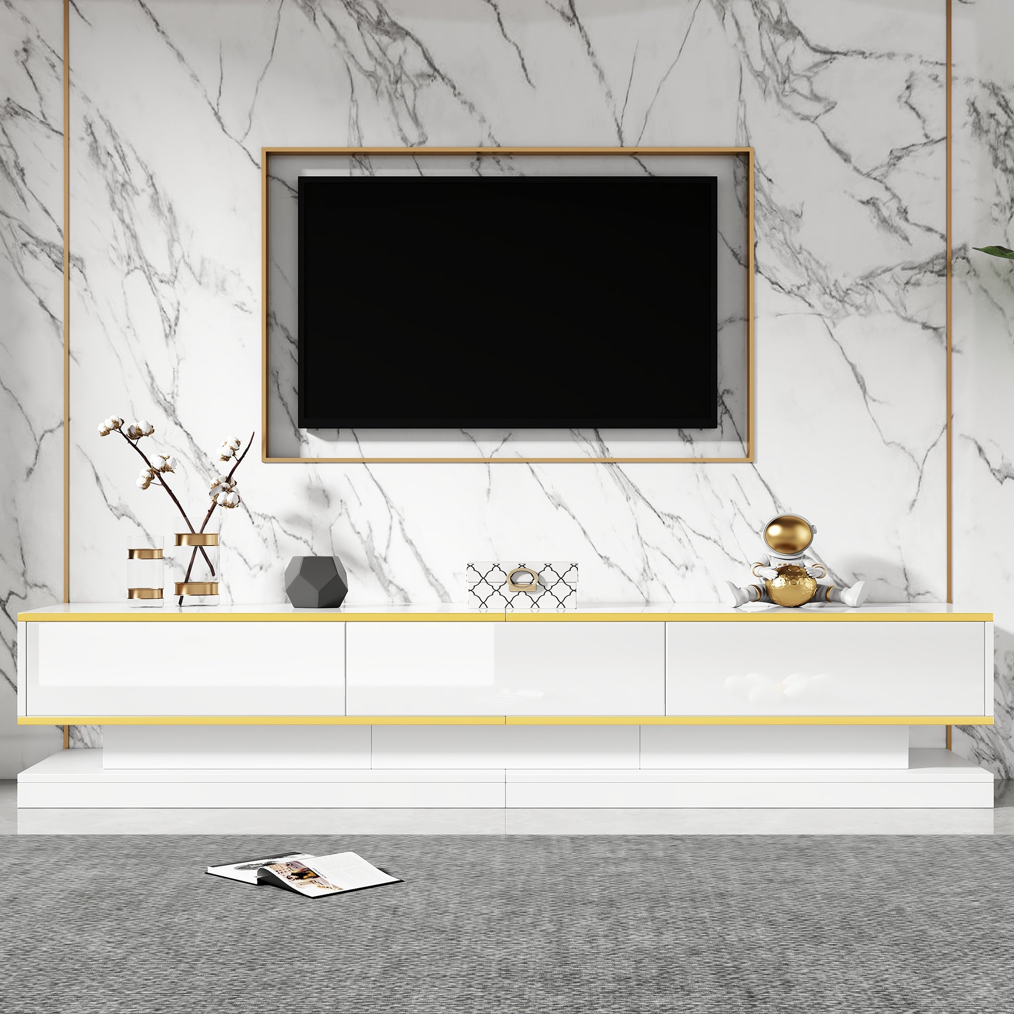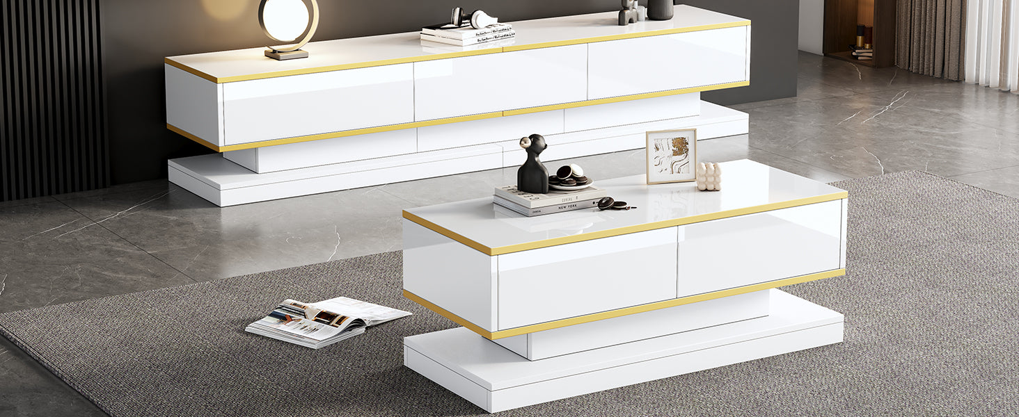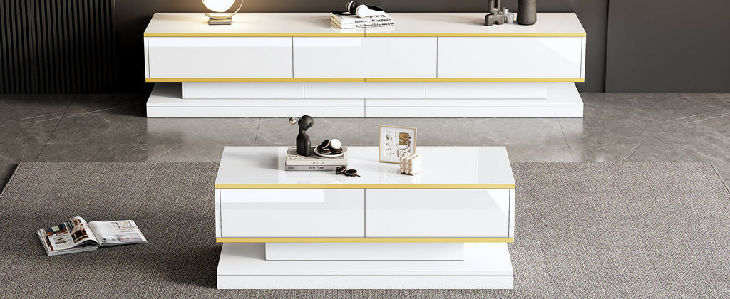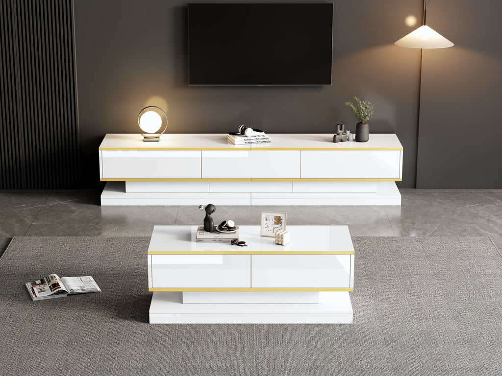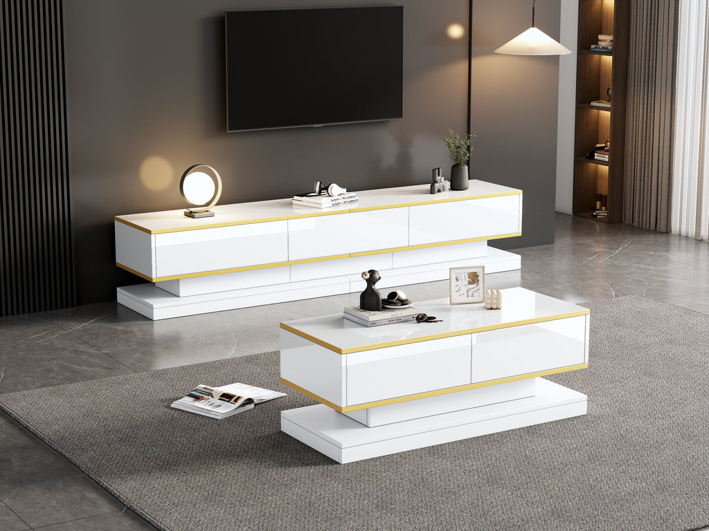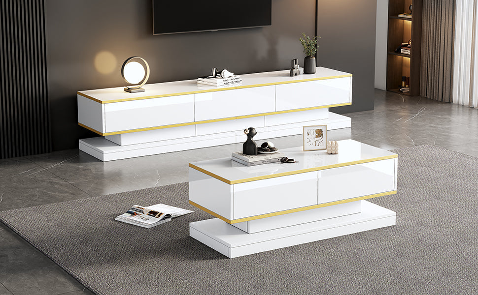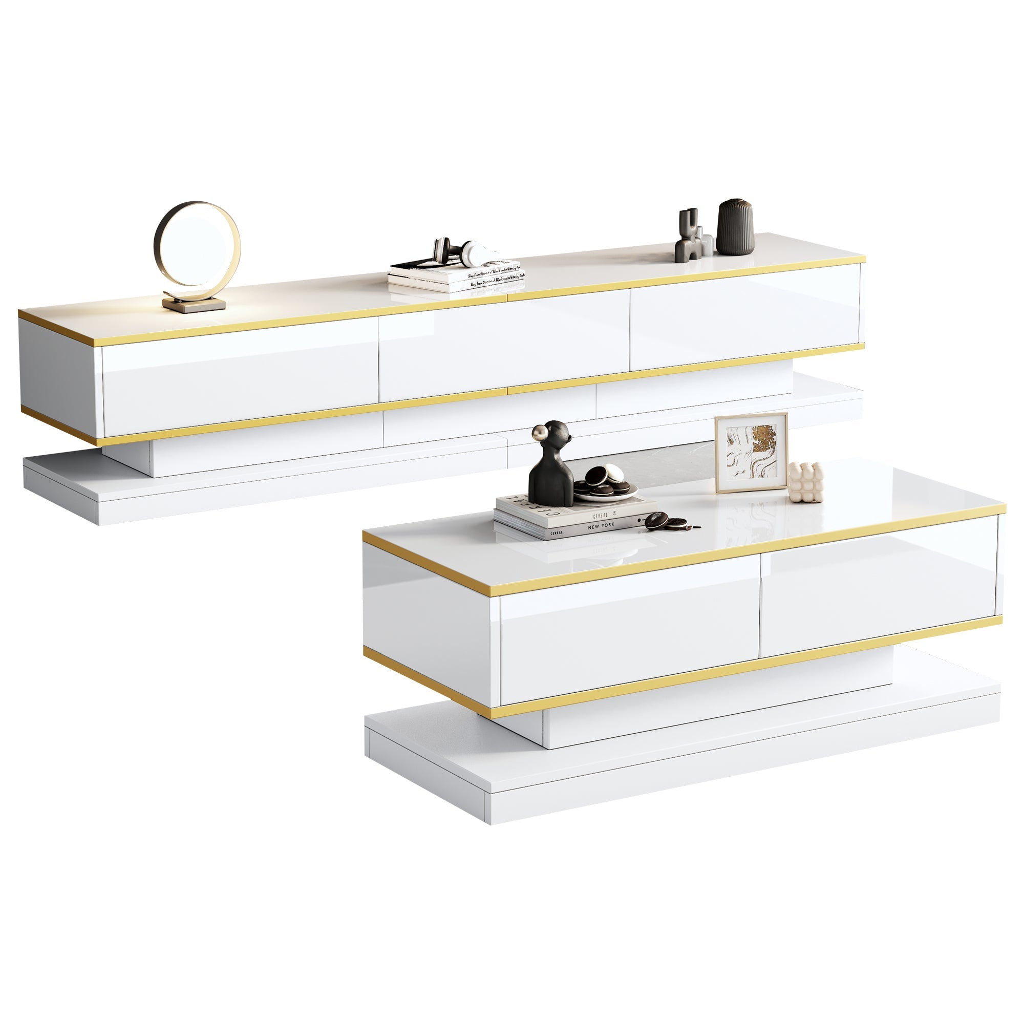 TV Stand & Coffee Table Set with 3-Drawer TV Console & 2-Drawer Coffee Table, White High Gloss & Gold