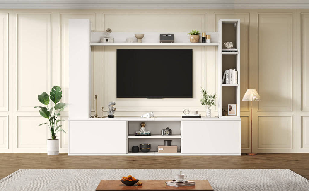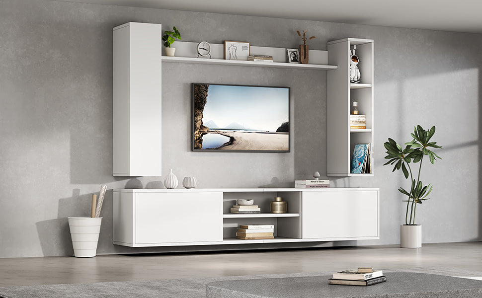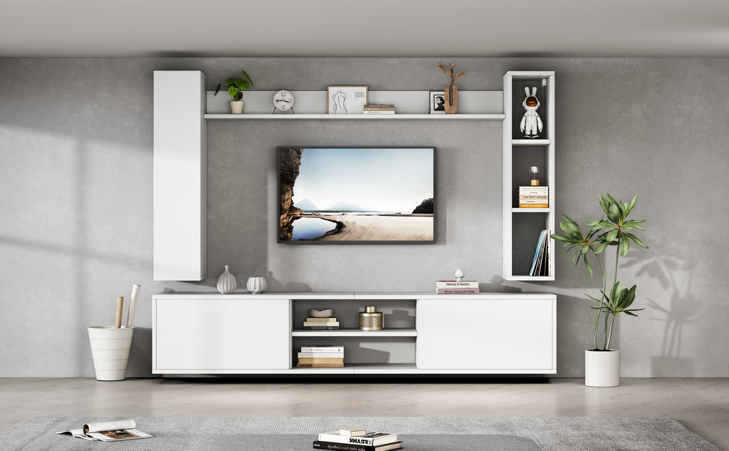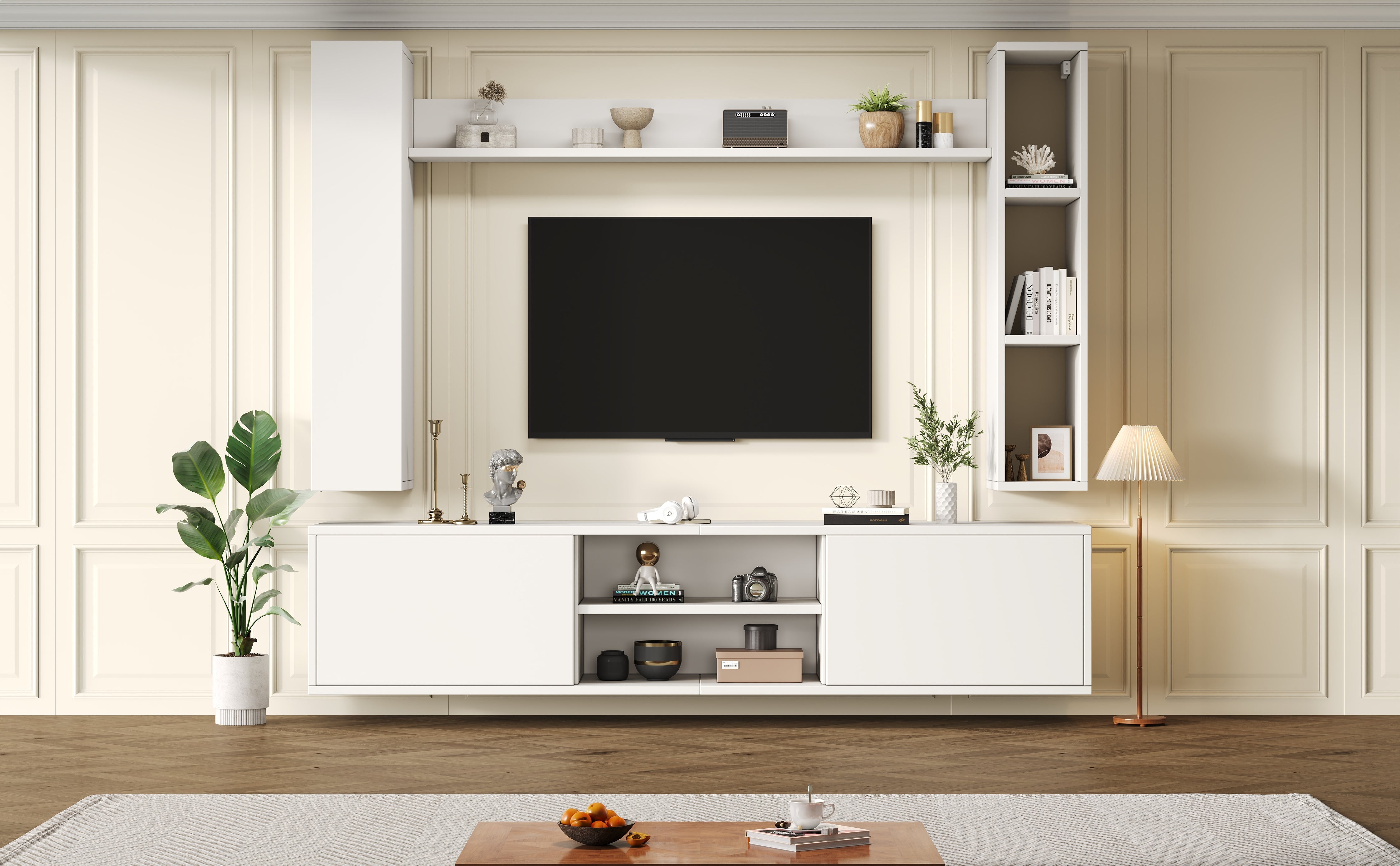 This living room TV set consists of four components: a TV stand, two wall cabinets, and a wall shelf. It is available as both a freestanding and wall-mounted version. The TV stand features two drop-leaf doors and two semi-open drawers. The two freestanding wall cabinets and the wall shelf are connected; one wall cabinet has doors and two shelves, while the other is an open display shelf without doors. This set not only offers ample storage space, but also serves as a decorative and display element, making it an ideal living room accessory. Soft-close hinges, hanging brackets, and high-quality particle board ensure durability, while the white design creates a simple and elegant look.