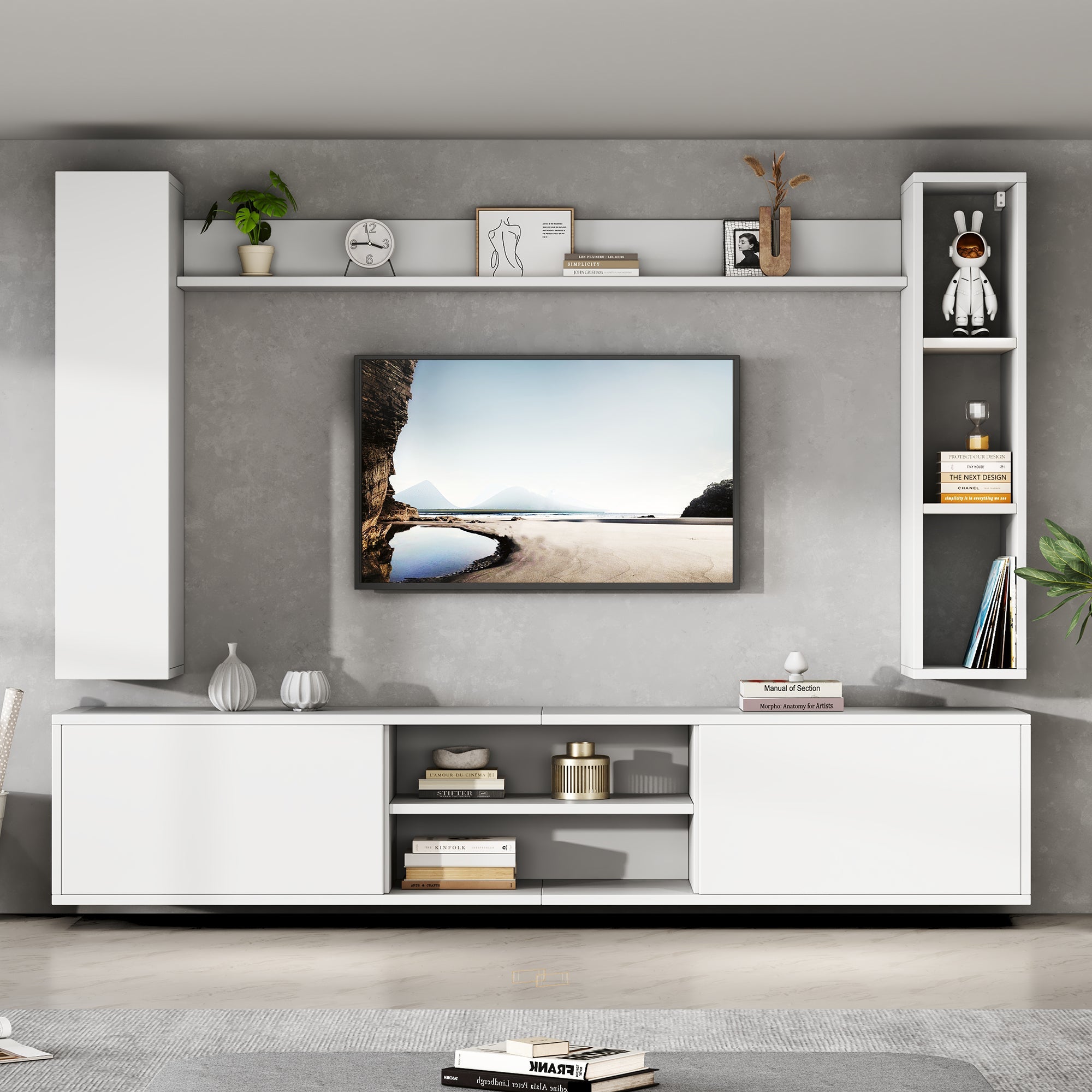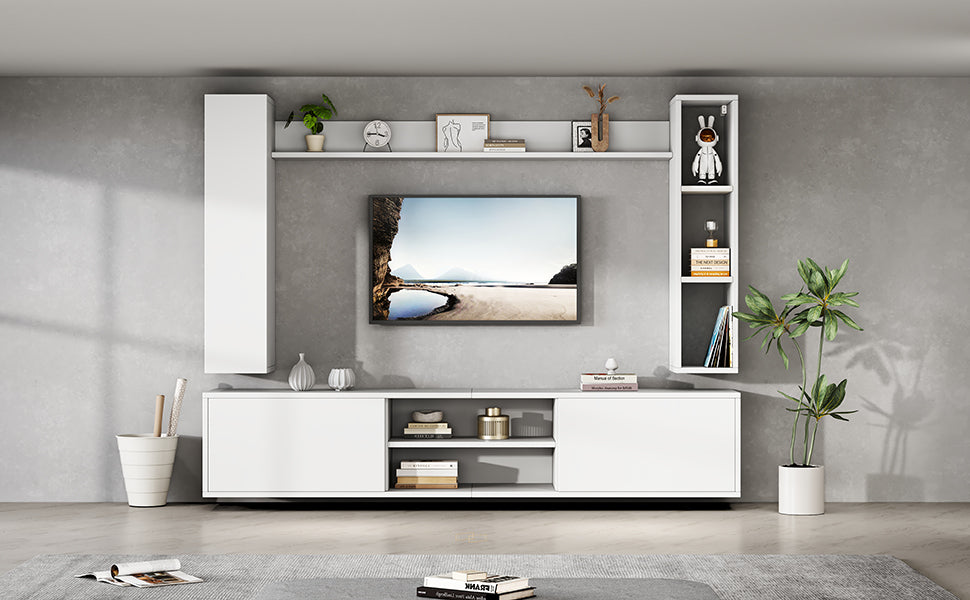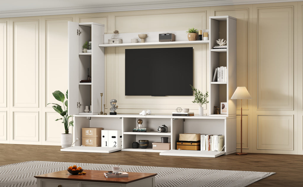 TV Wall Unit Set, 4-Piece Media with Display Cabinets, TV Board, Shelves, White