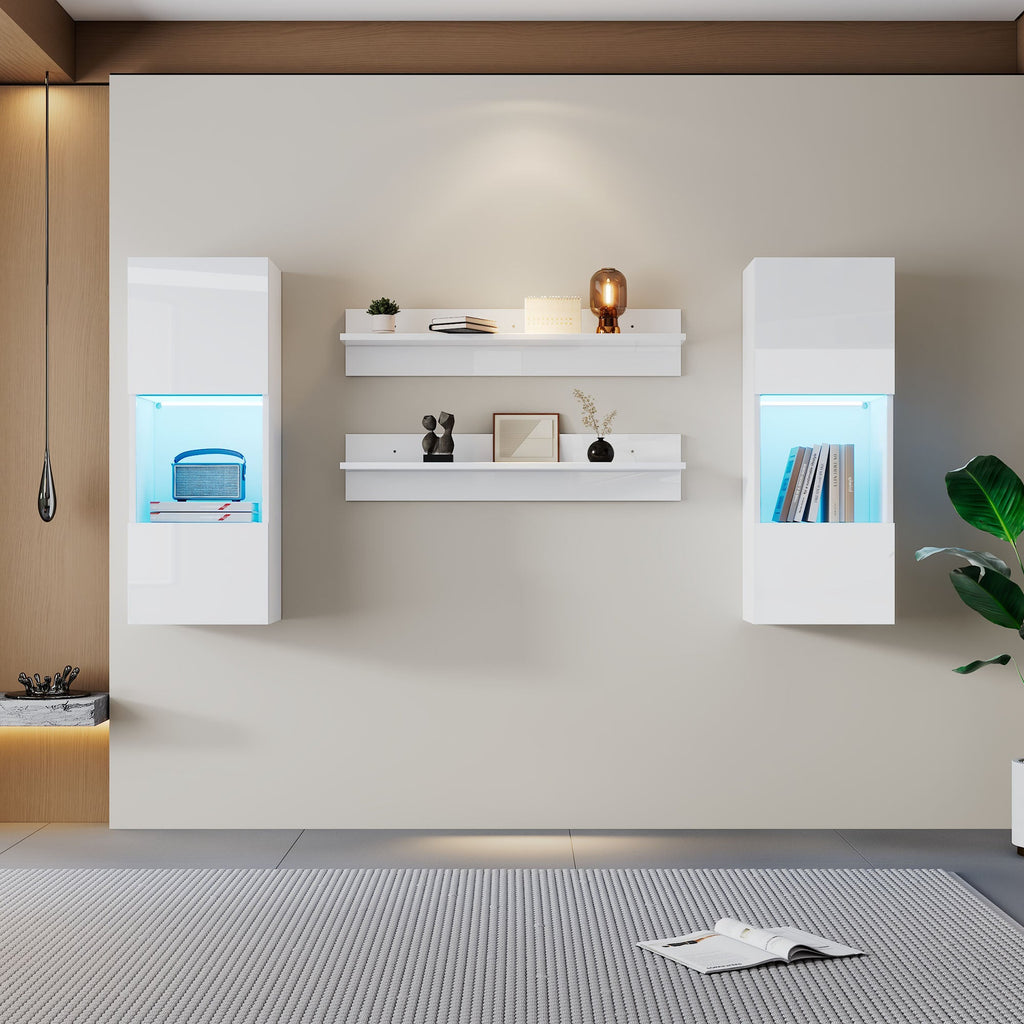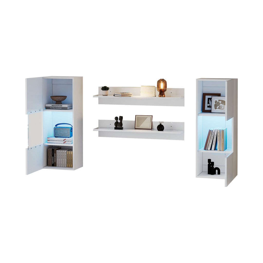 This 5-piece TV stand set includes two wall cabinets, two shelves, and a TV stand, offering ample storage space. Both the wall cabinets and the TV stand feature LED lighting, creating a cozy atmosphere. The cabinet doors and TV stand fronts have a high-gloss lacquer finish, making them aesthetically pleasing and easy to clean. This set is sturdy and durable. The TV stand and wall cabinet each have a weight capacity of 30 kg. Available in white.