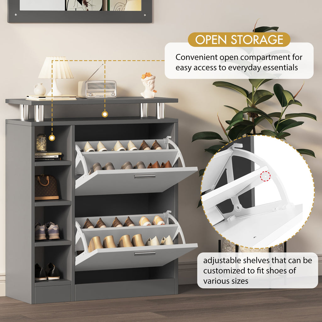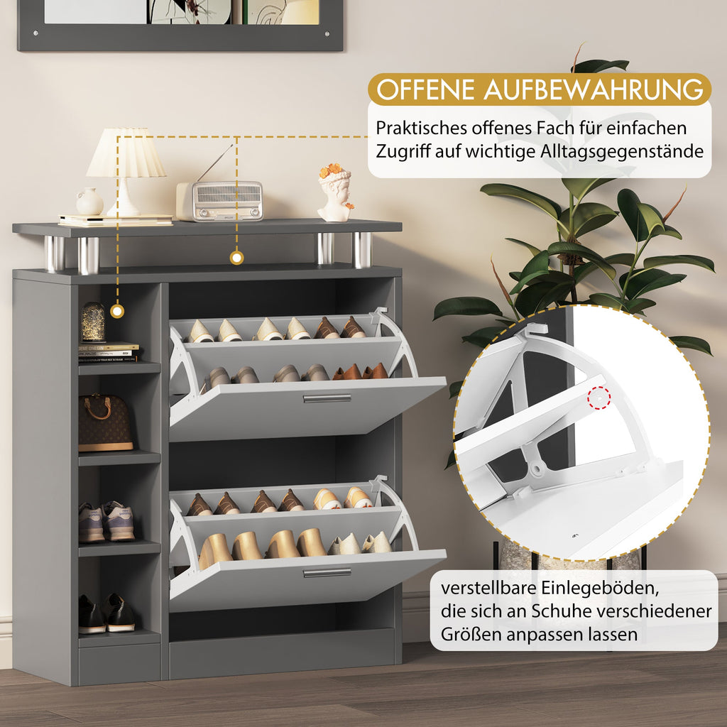 The interior of the shoe cabinet is divided into two levels, each with adjustable, movable shelves that can be adjusted to suit your shoe size. It has a capacity for approximately 3 pairs per shelf, totaling about 12 pairs, and a weight capacity of 35 kg.