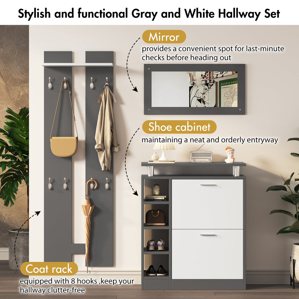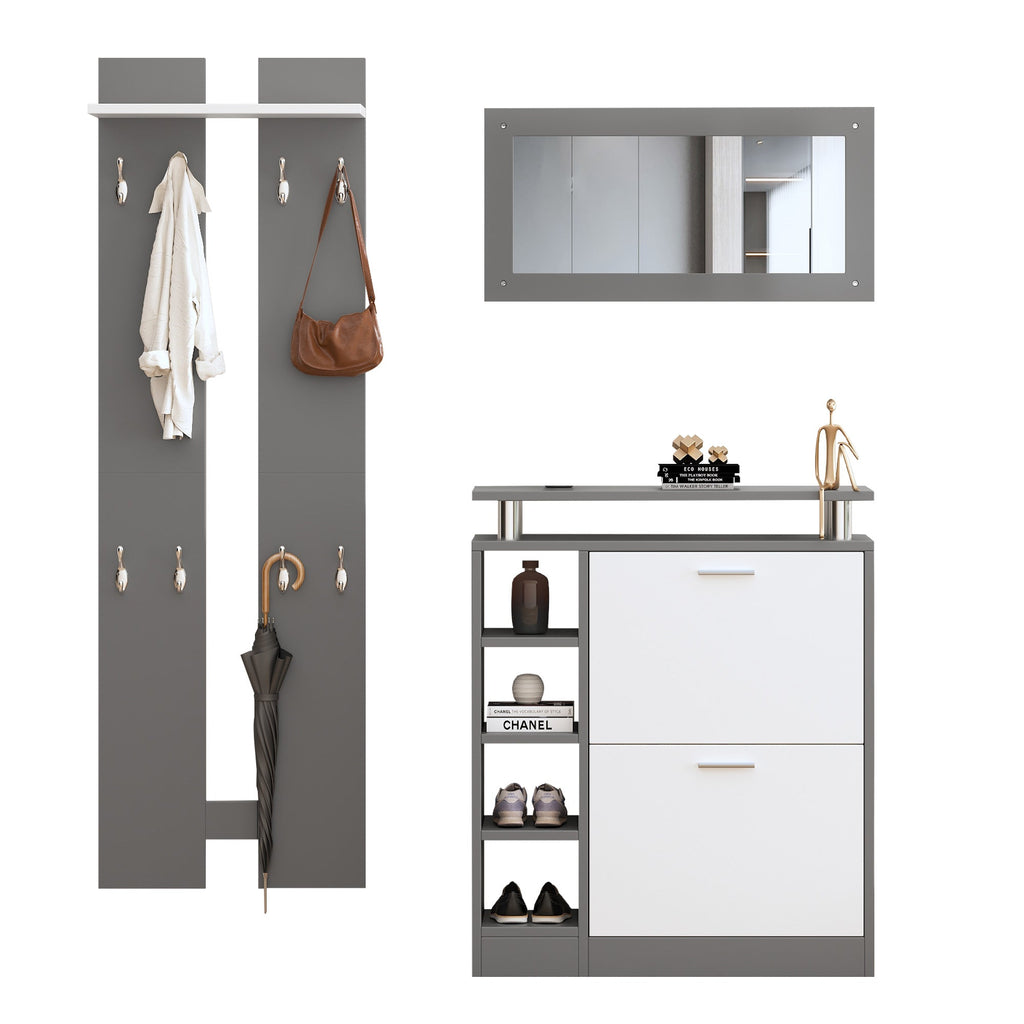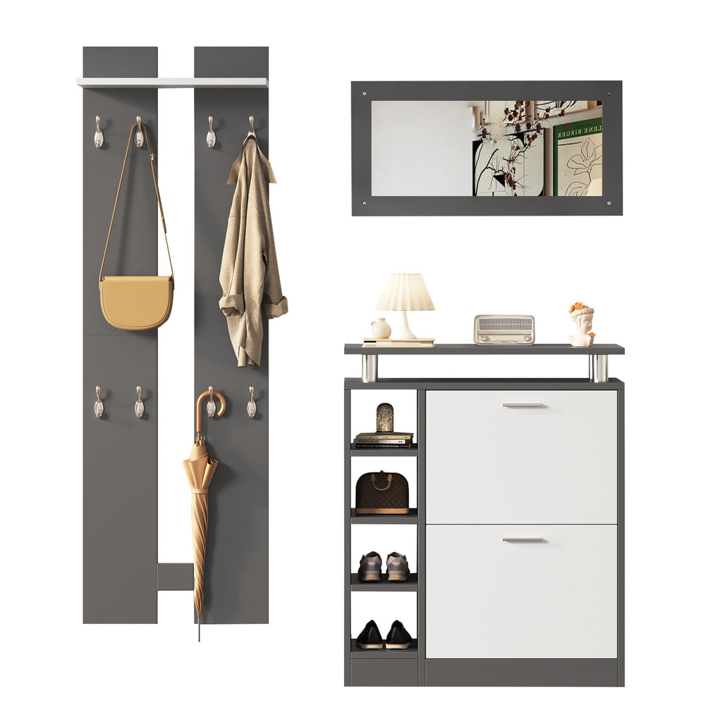 Components: 1 shoe cabinet, 2 wall panels with 8 coat hooks, 1 top shelf, 1 decorative wall mirror