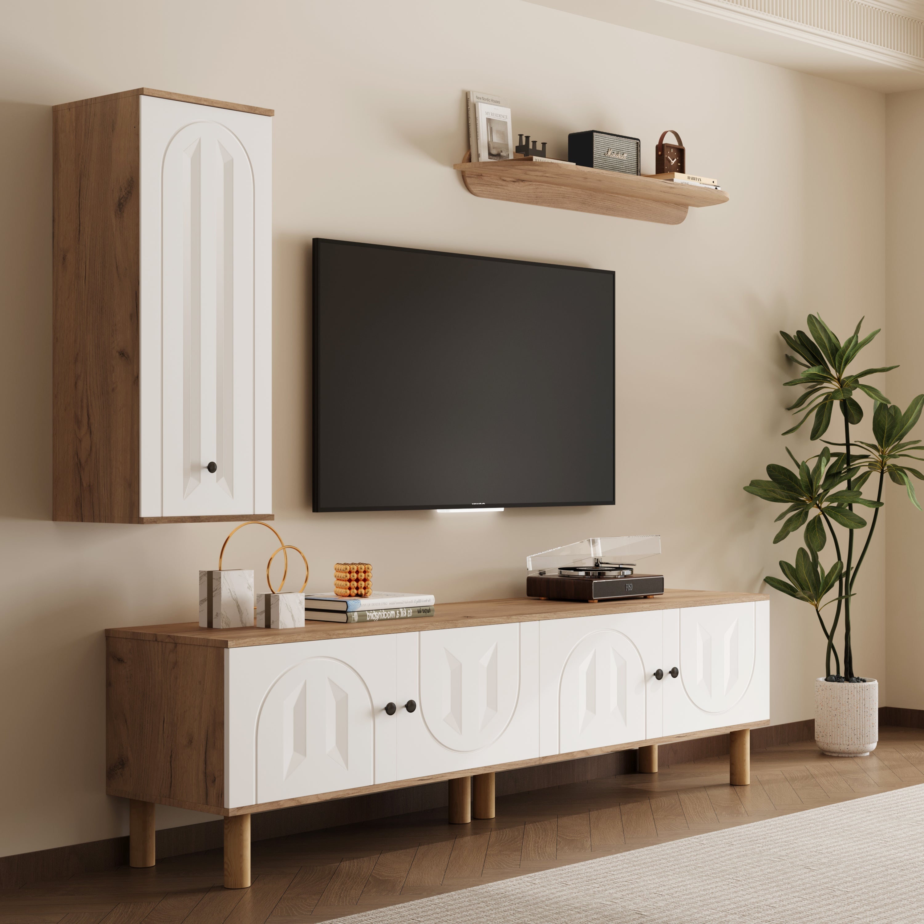 Flexible design: tall/low panels with wall shelves. Elegant look: white with natural wood. Artistic touch: carved door panels. Complete set: TV cabinet (80 kg), display cabinet (30 kg), and shelf (15 kg). Robust construction: solid wood legs. Smart storage: open and closed spaces. Safe use: smooth, quiet hinges.