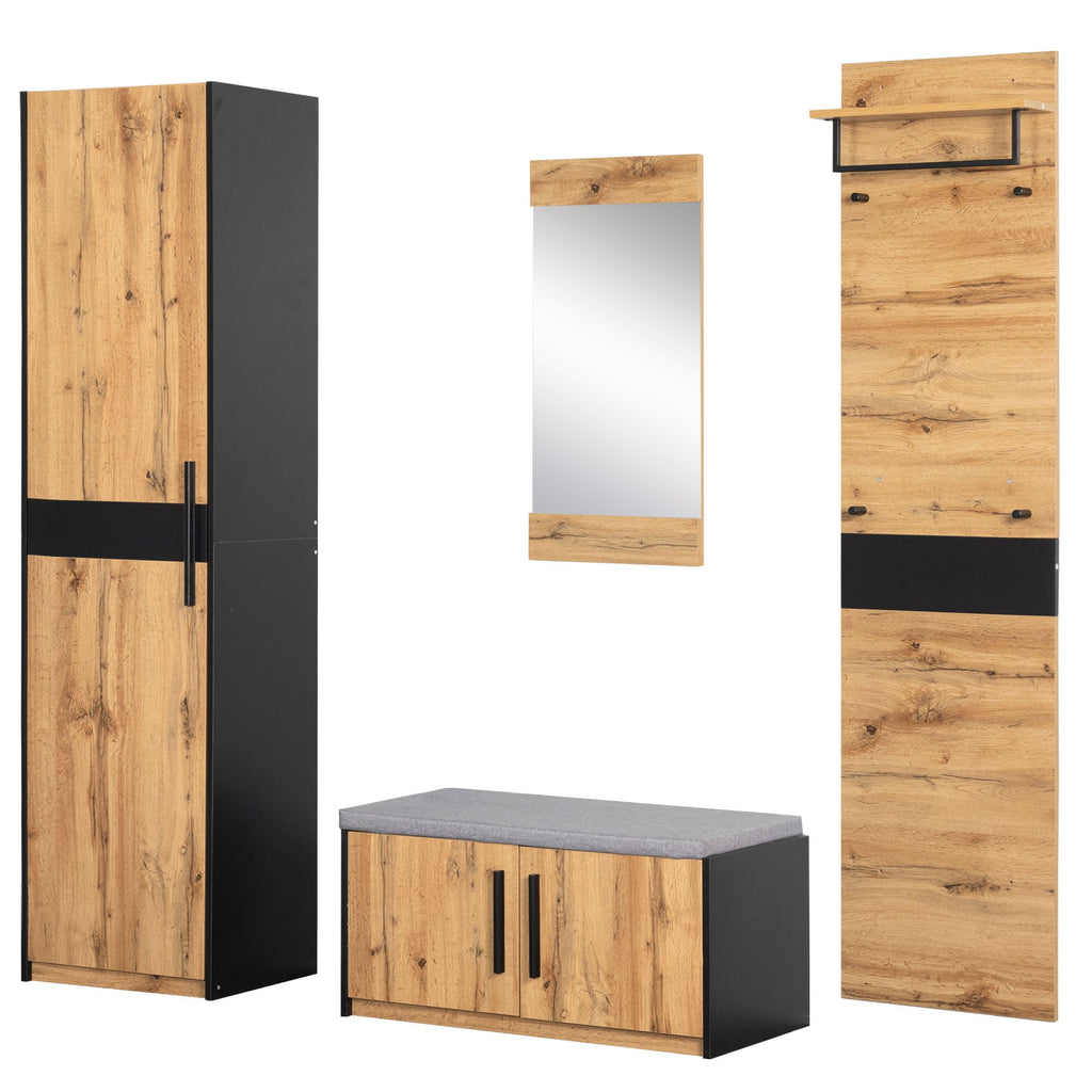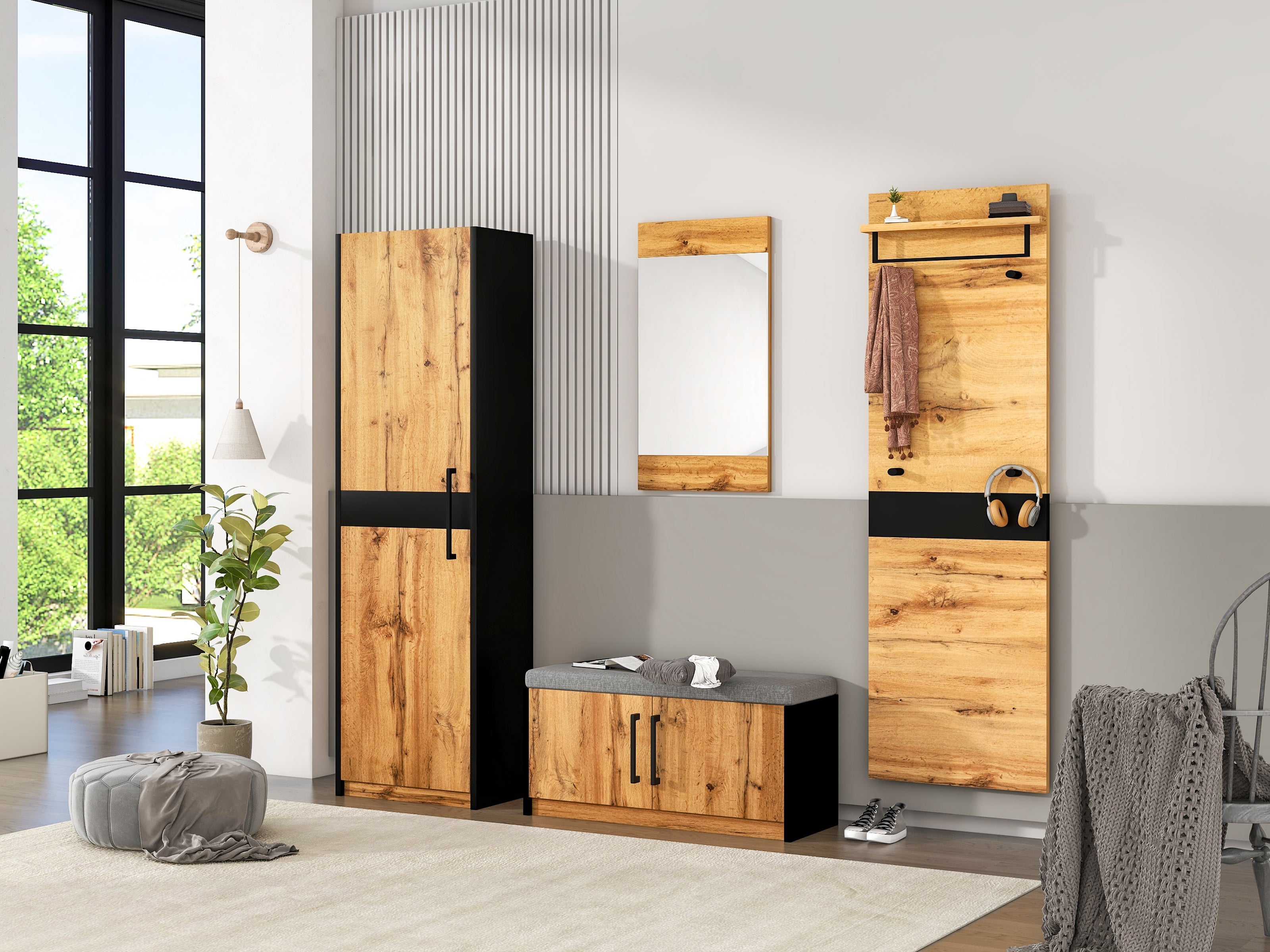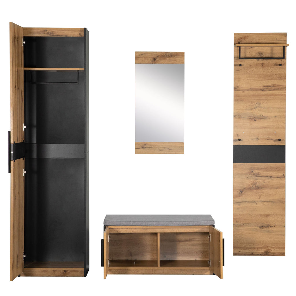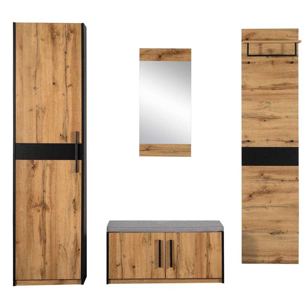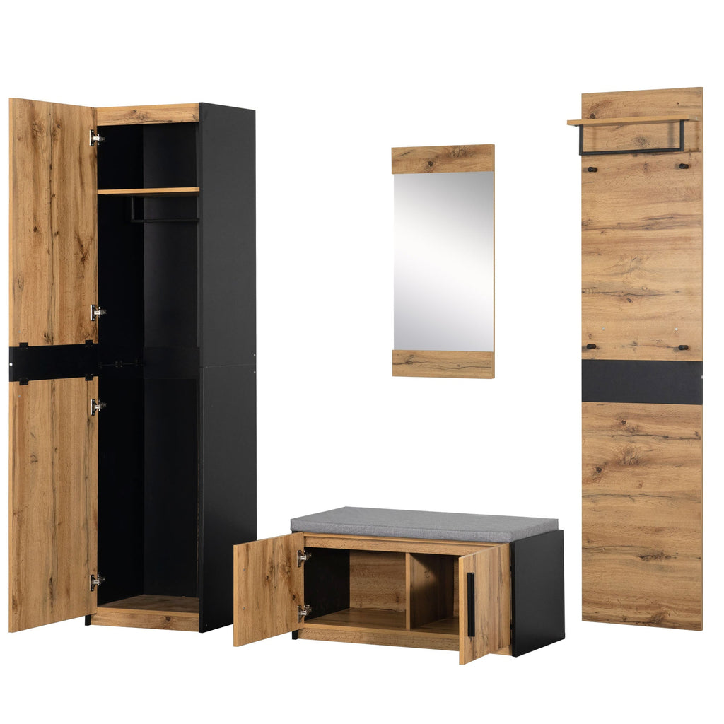 Wonderful Storage Space! Our 4-piece wardrobe set protects you from chaos in the hallway. This modern complete set, including a shoe bench, wardrobe panel, shoe cabinet, and mirror, guarantees plenty of space for shoes, jackets, accessories, and much more! Made in Europe. Whether in the hallway or entrance area, the design of the wardrobe furniture blends discreetly into any entryway.